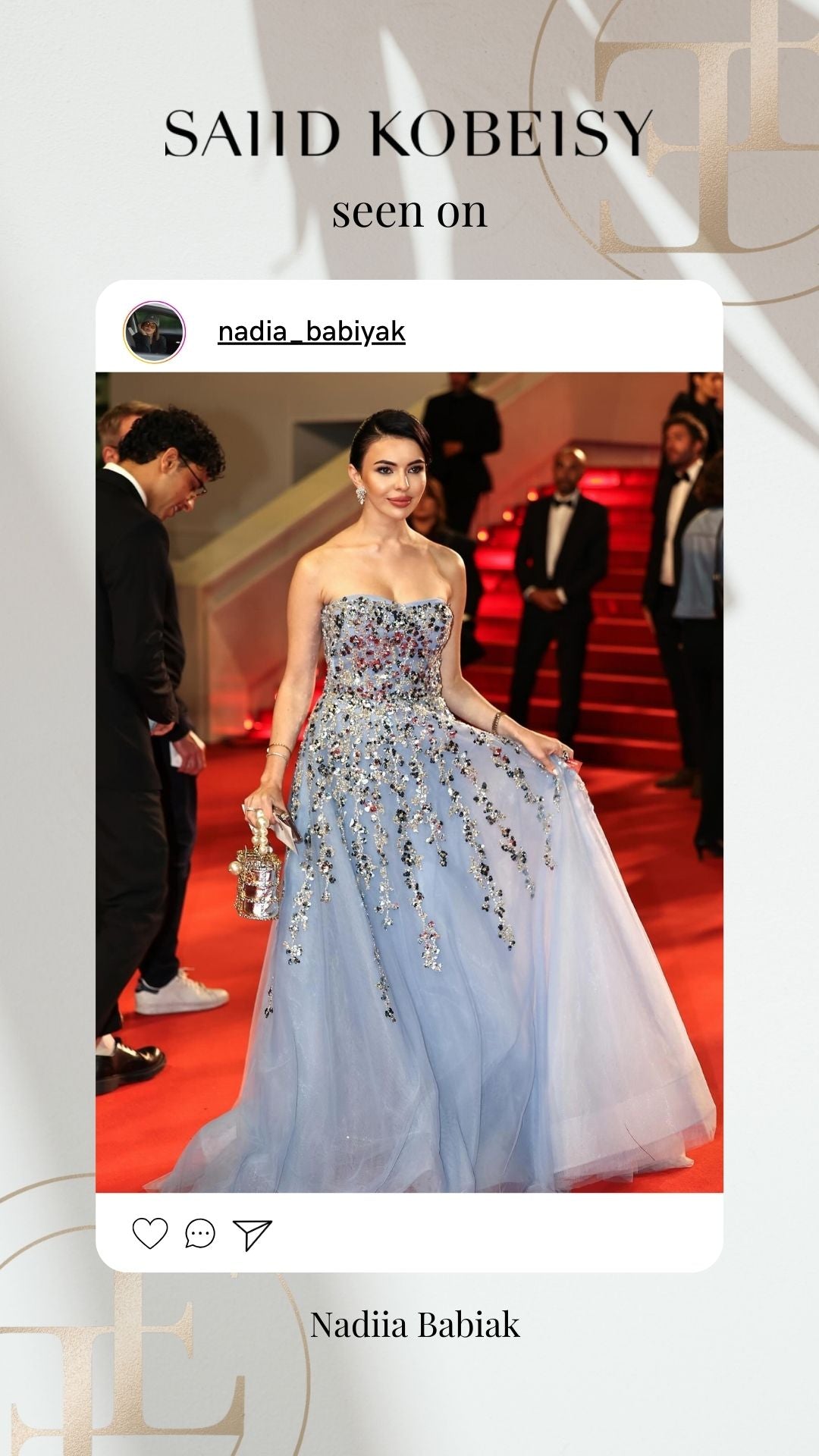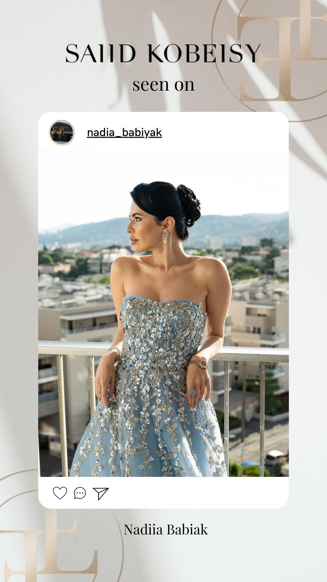 Blue tulle dress with a strapless top; the beading is Blue and Silver dots formed into thin lines, distributed heavily on the top and lighter on the flared skirt; paired with an SK blue belt.