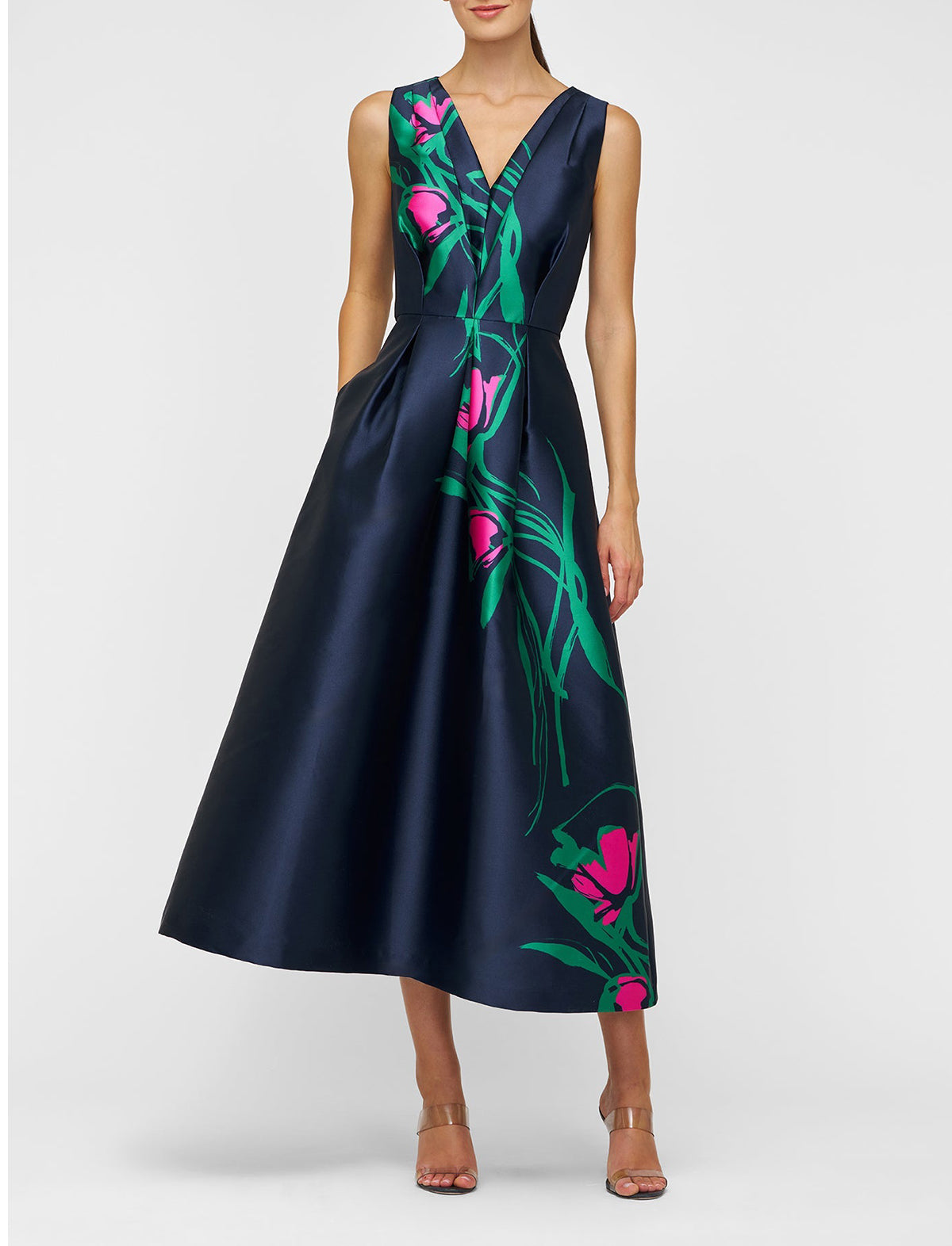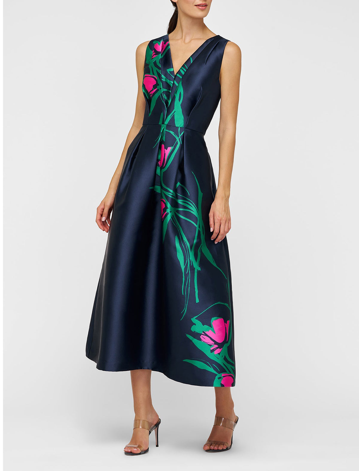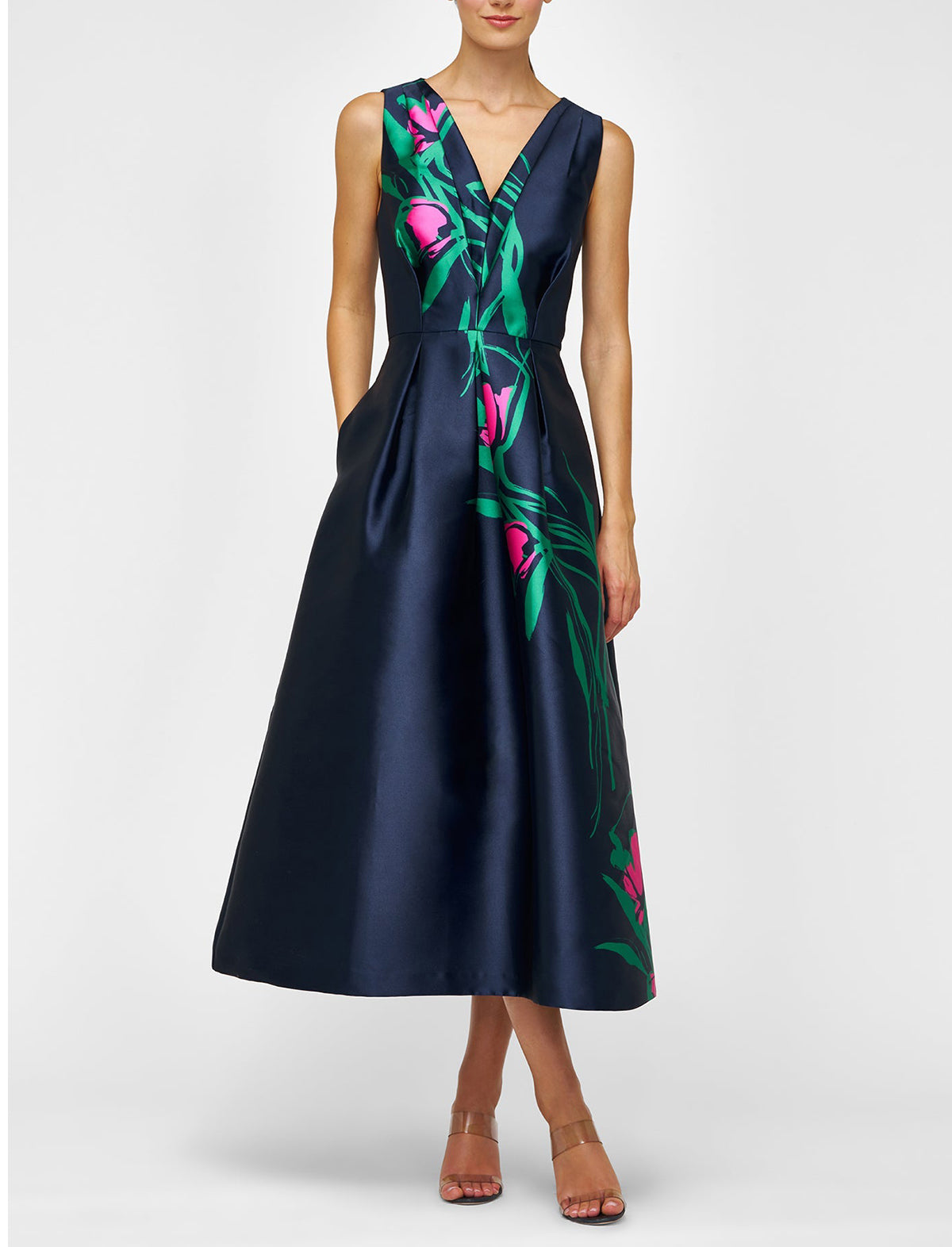 Crafted from printed Mikado, this tea-length dress features a striking tulip placement print and a pleated skirt that adds volume and shape. A vivid option for summer weddings and outdoor celebrations.