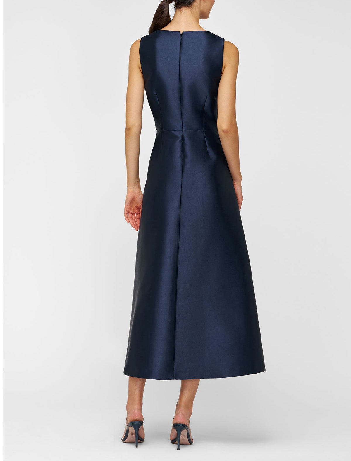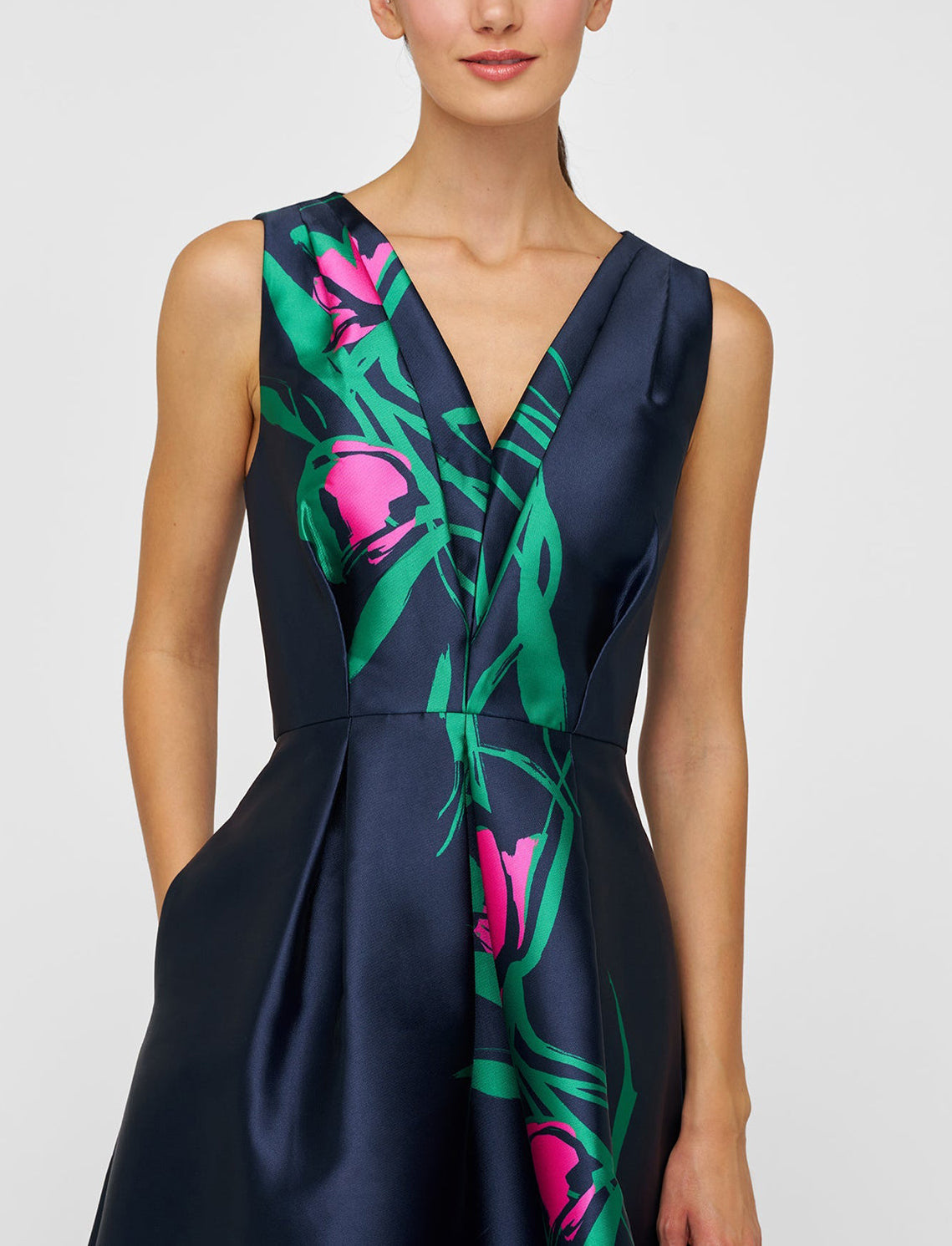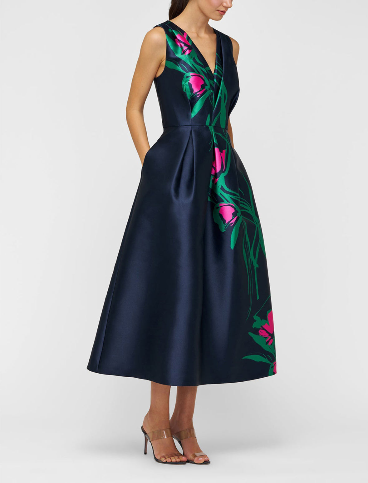 Crafted from printed Mikado, this tea-length dress features a striking tulip placement print and a pleated skirt that adds volume and shape. A vivid option for summer weddings and outdoor celebrations.