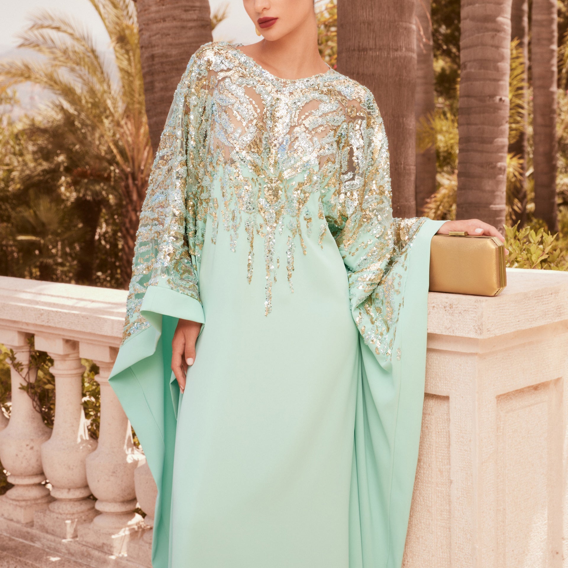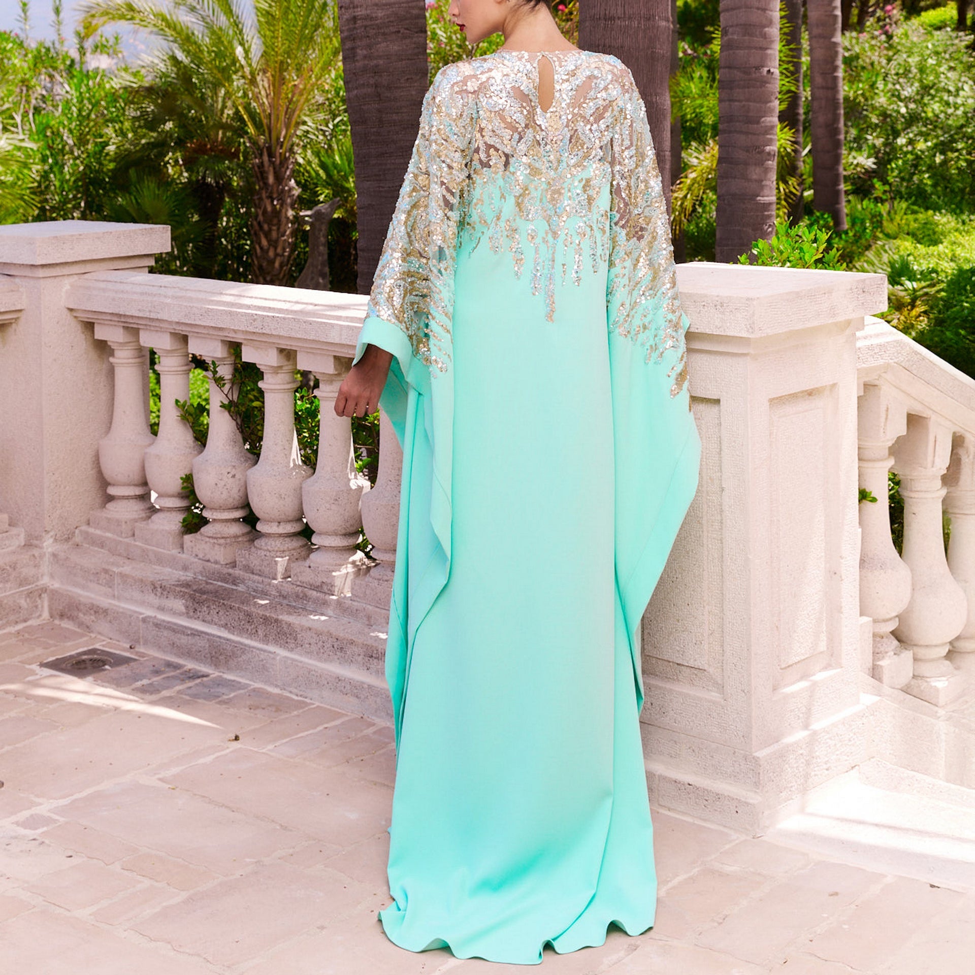 Water-Green Kaftan Dress with Silver Beaded Tulle