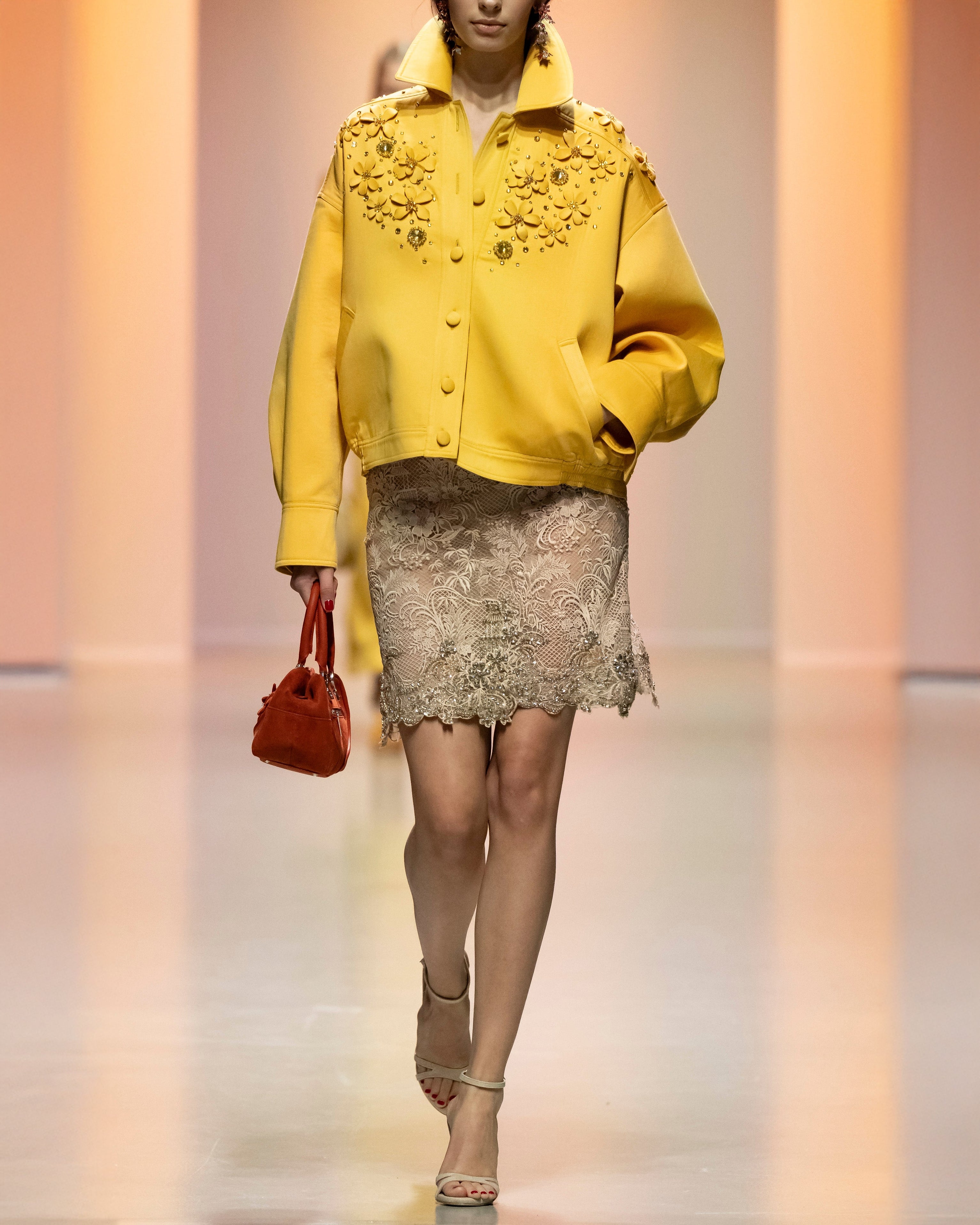 - Pair with a sleek, fitted dress or tailored trousers to balance the jacketÆ¢¢Å¢¢s oversized silhouette. Opt for delicate jewelry and heels to complement the elegant floral details.