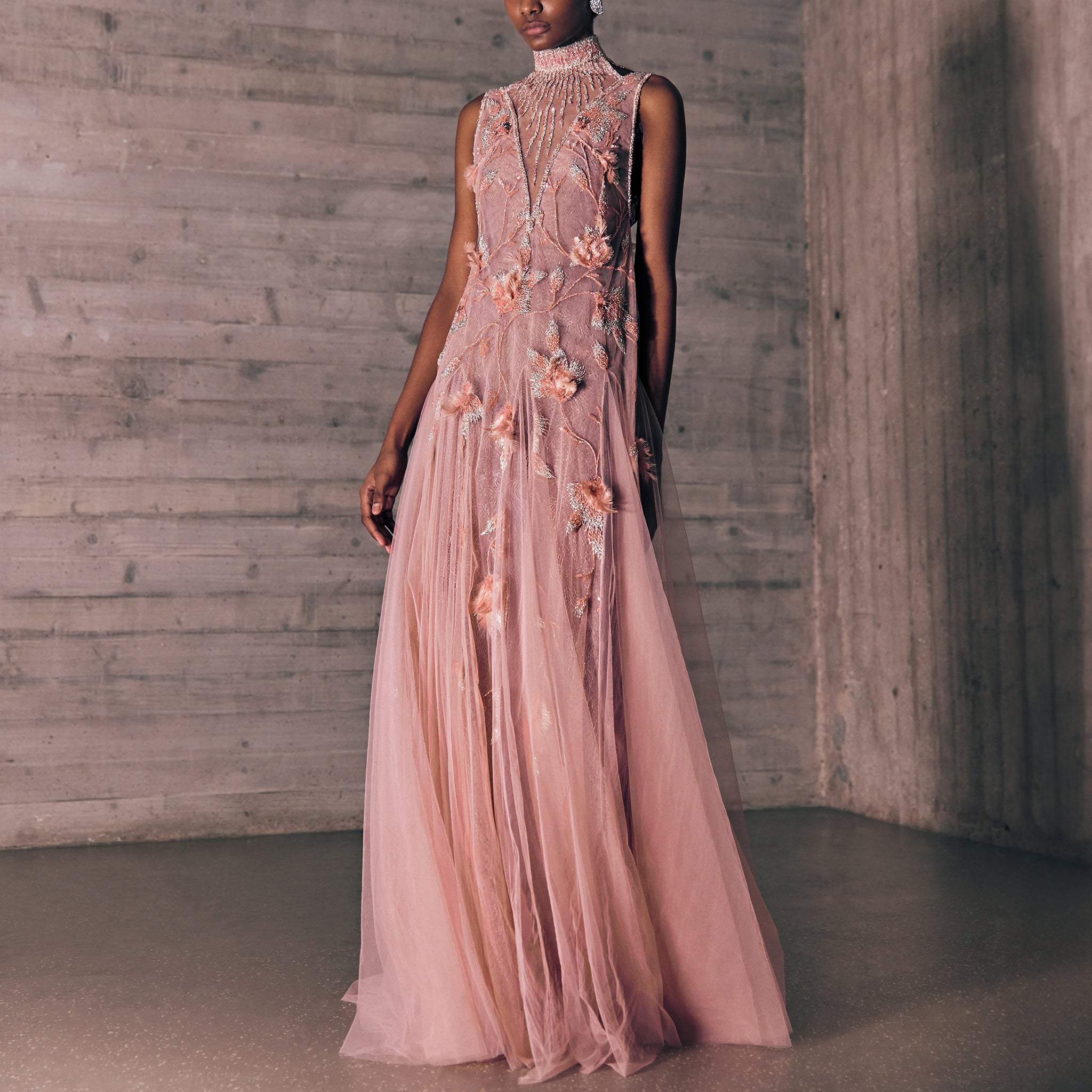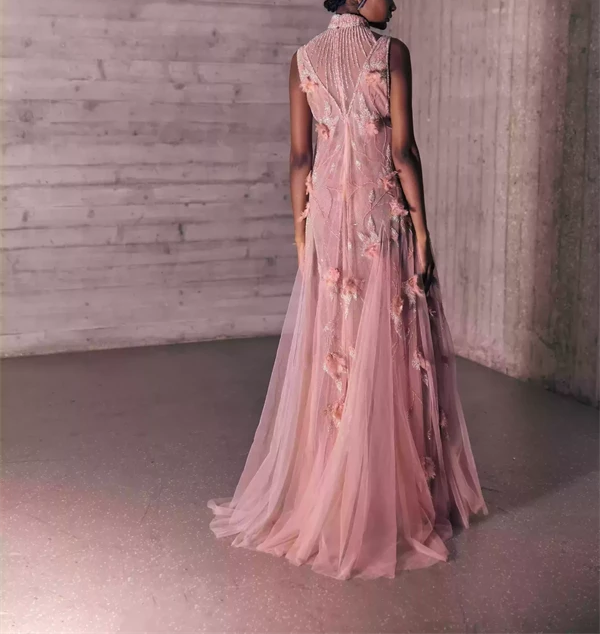 Feather Embroidered Blush Pink Dress With A Lacec Fond De Robe.