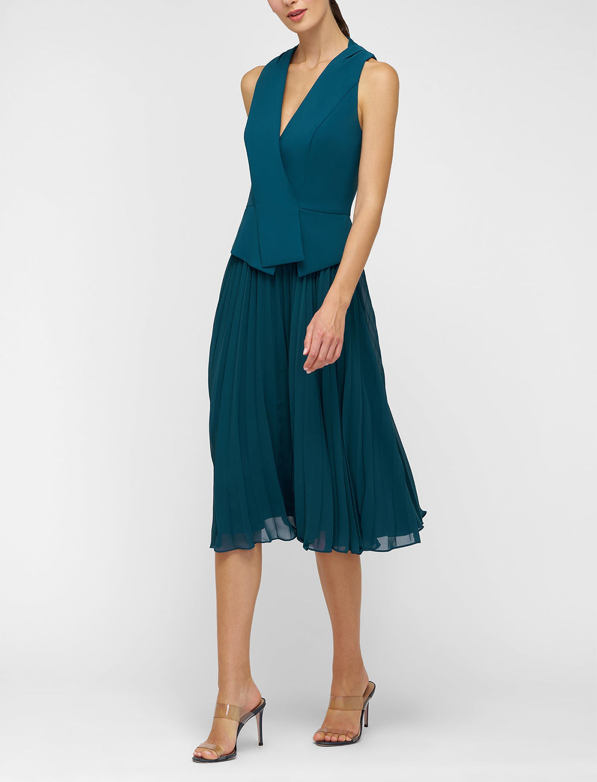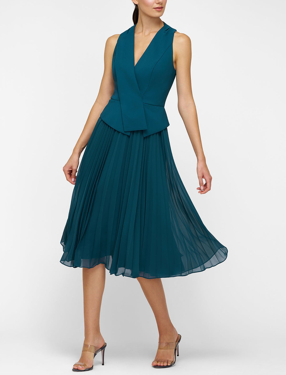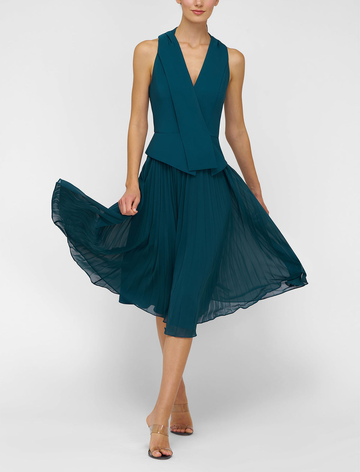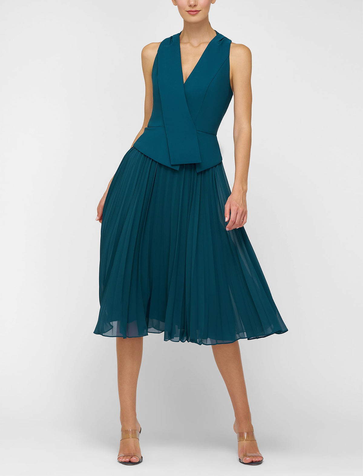 Sleeveless midi dress featuring a stretch crepe bodice with an asymmetric peplum overlay, paired with a flowing pleated chiffon skirt for soft movement. A modern update on a bestselling silhouette—polished enough for work, yet playful enough for evening celebrations. Ideal for bridal showers, luncheons, and seamlessly transitioning from meetings to cocktails.