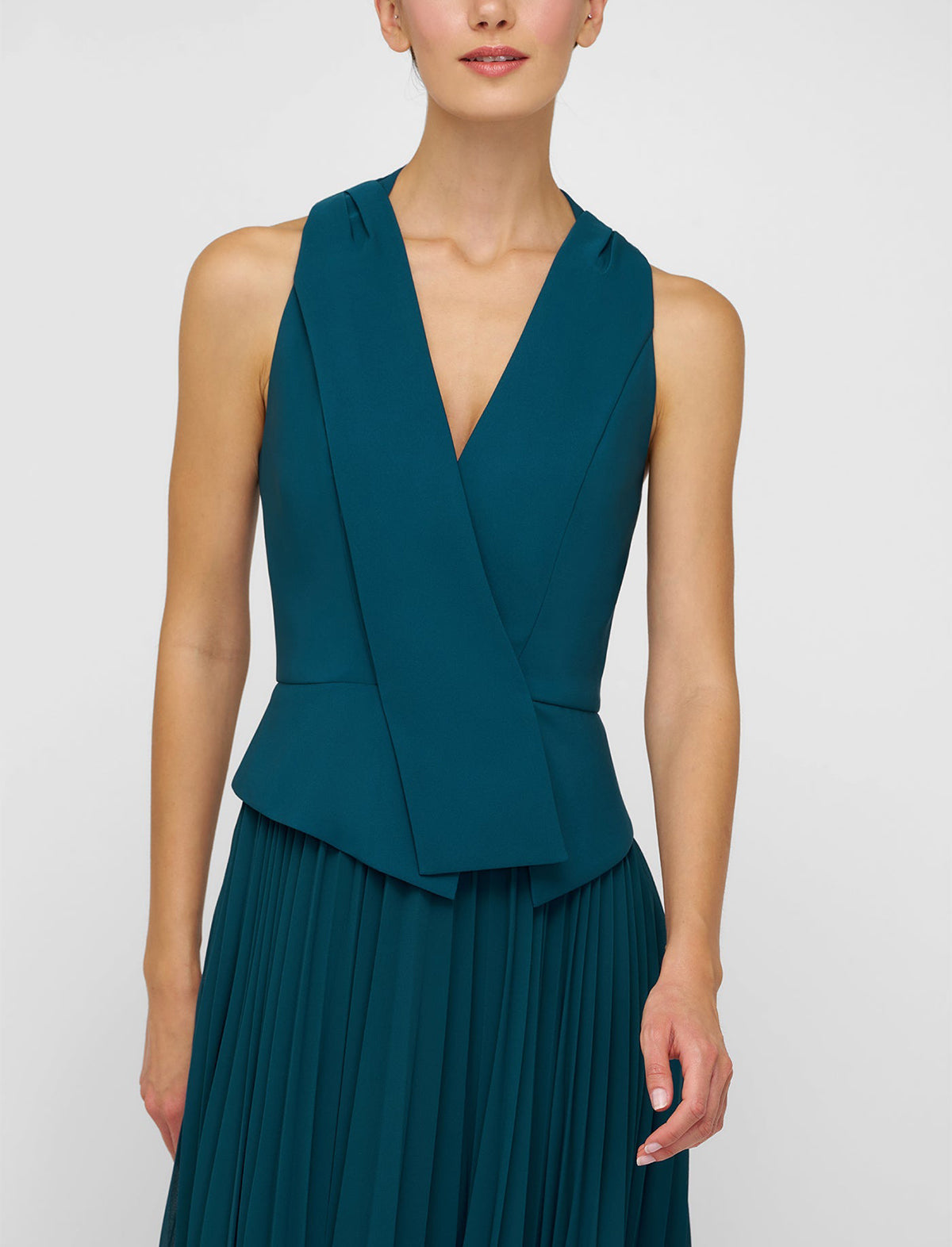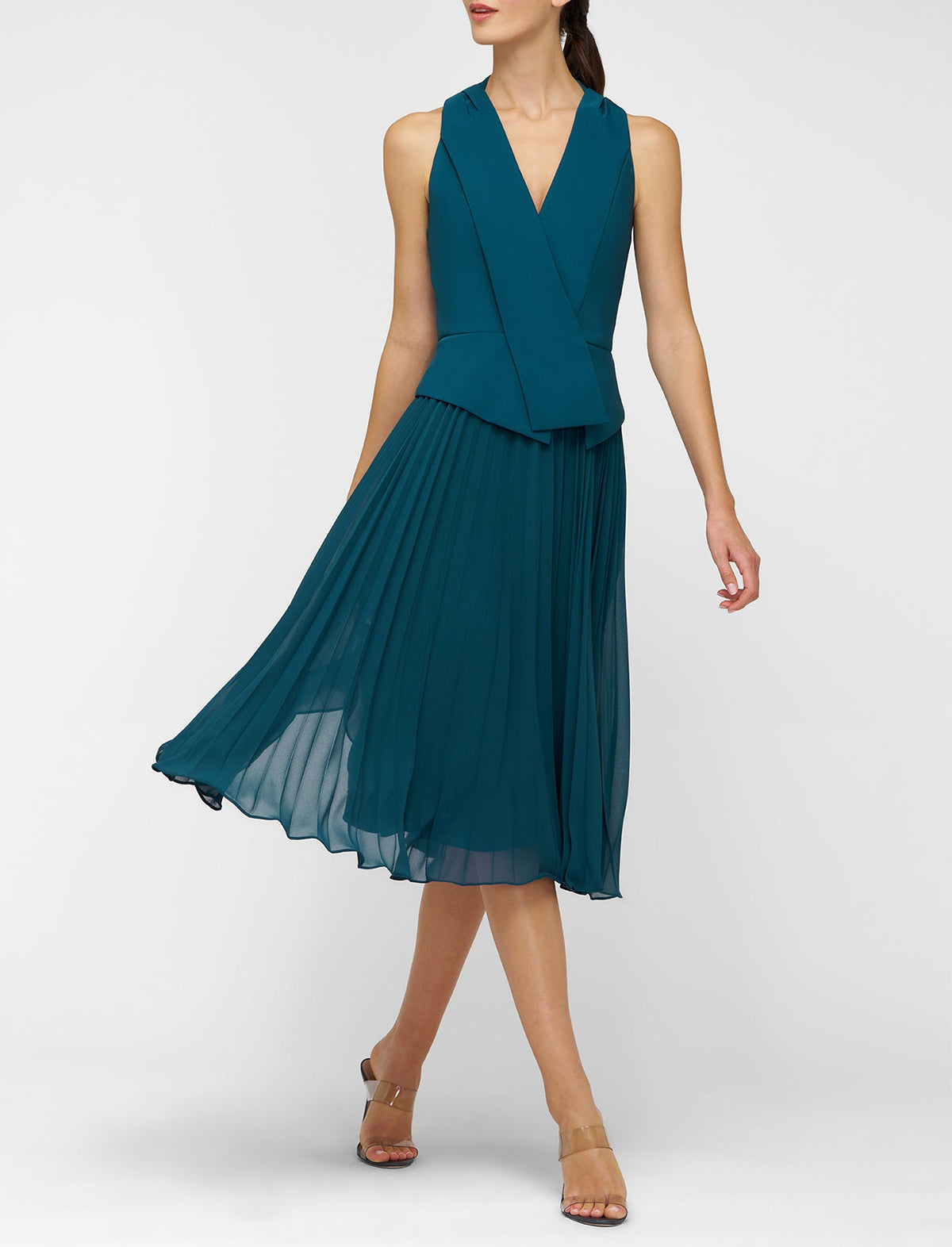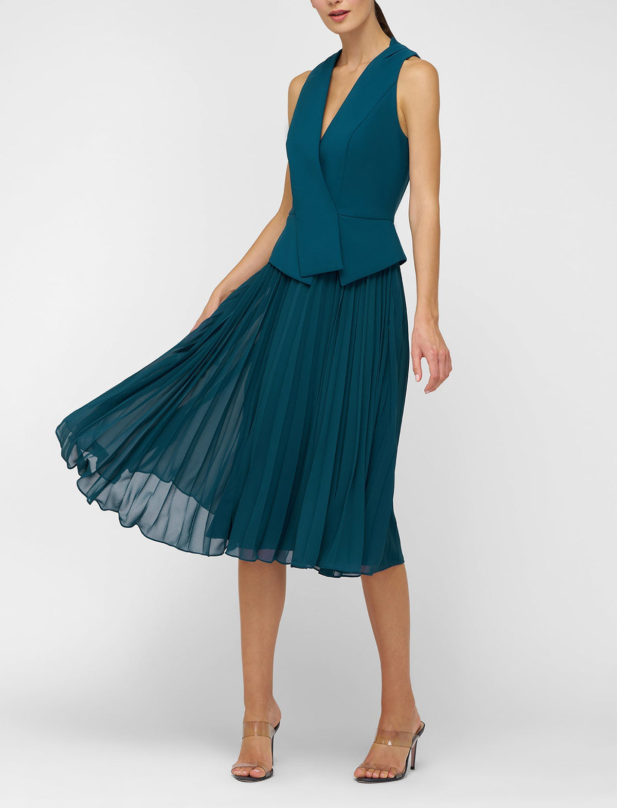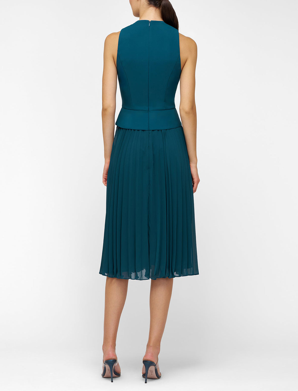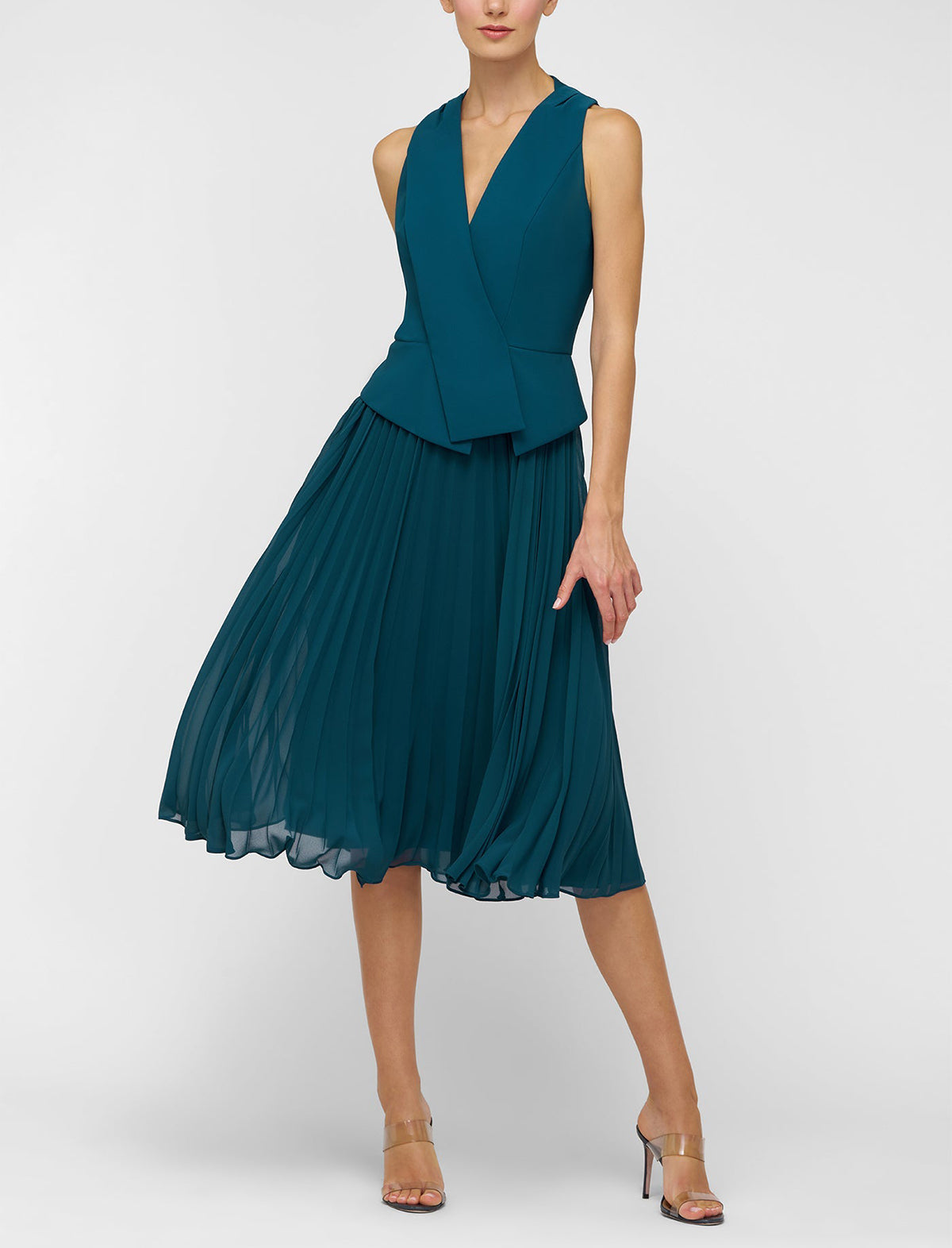 Sleeveless midi dress featuring a stretch crepe bodice with an asymmetric peplum overlay, paired with a flowing pleated chiffon skirt for soft movement. A modern update on a bestselling silhouette—polished enough for work, yet playful enough for evening celebrations. Ideal for bridal showers, luncheons, and seamlessly transitioning from meetings to cocktails.