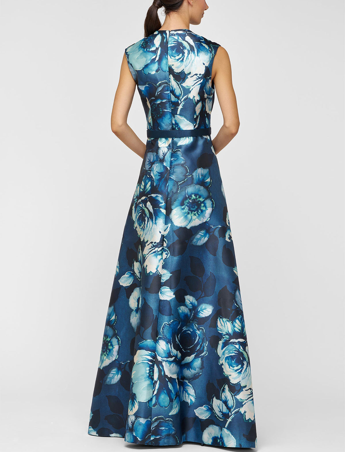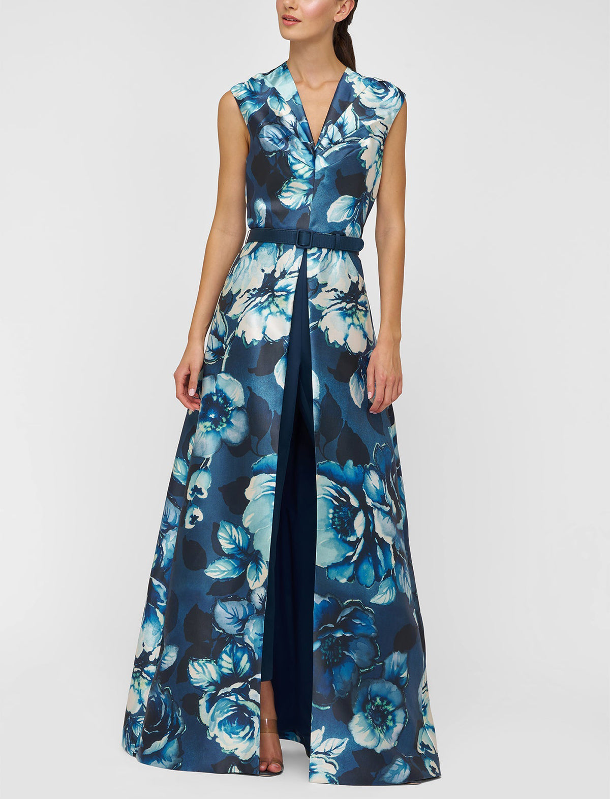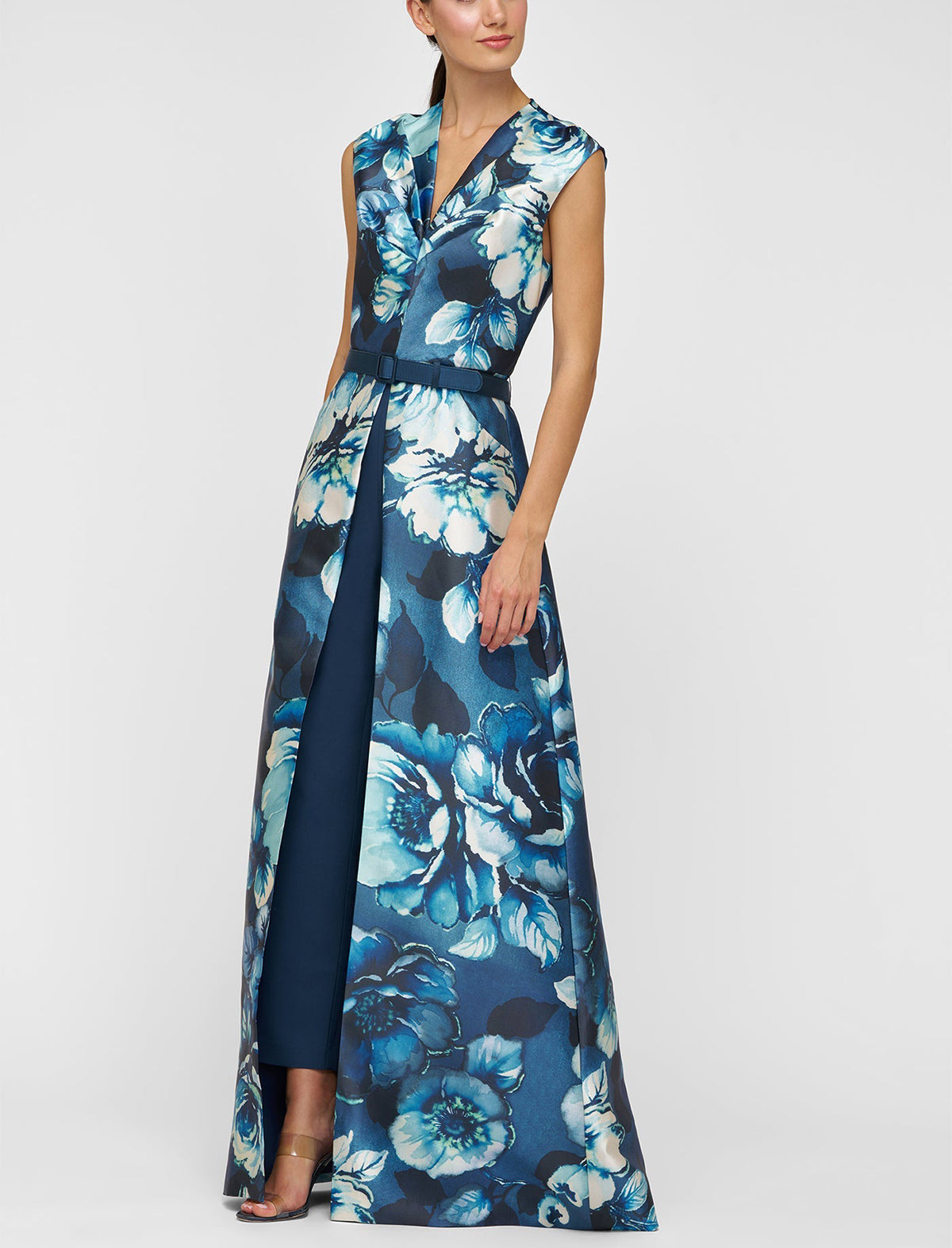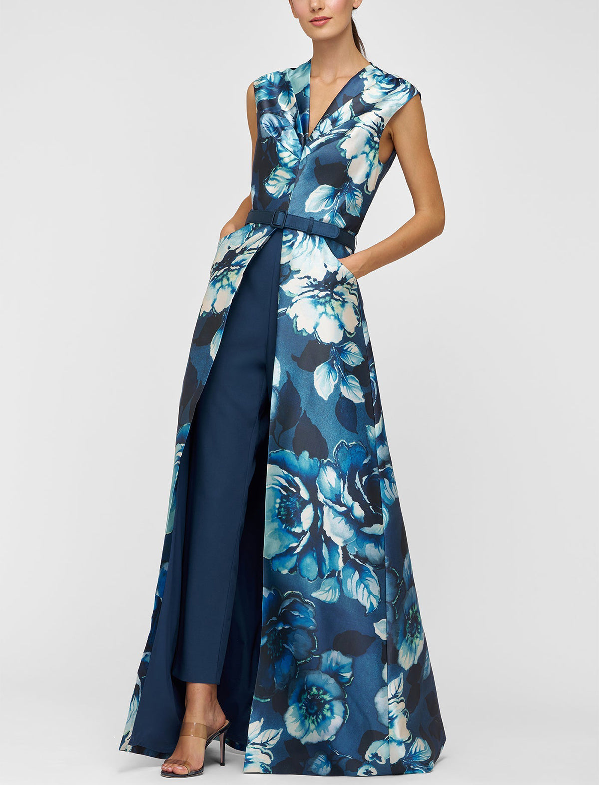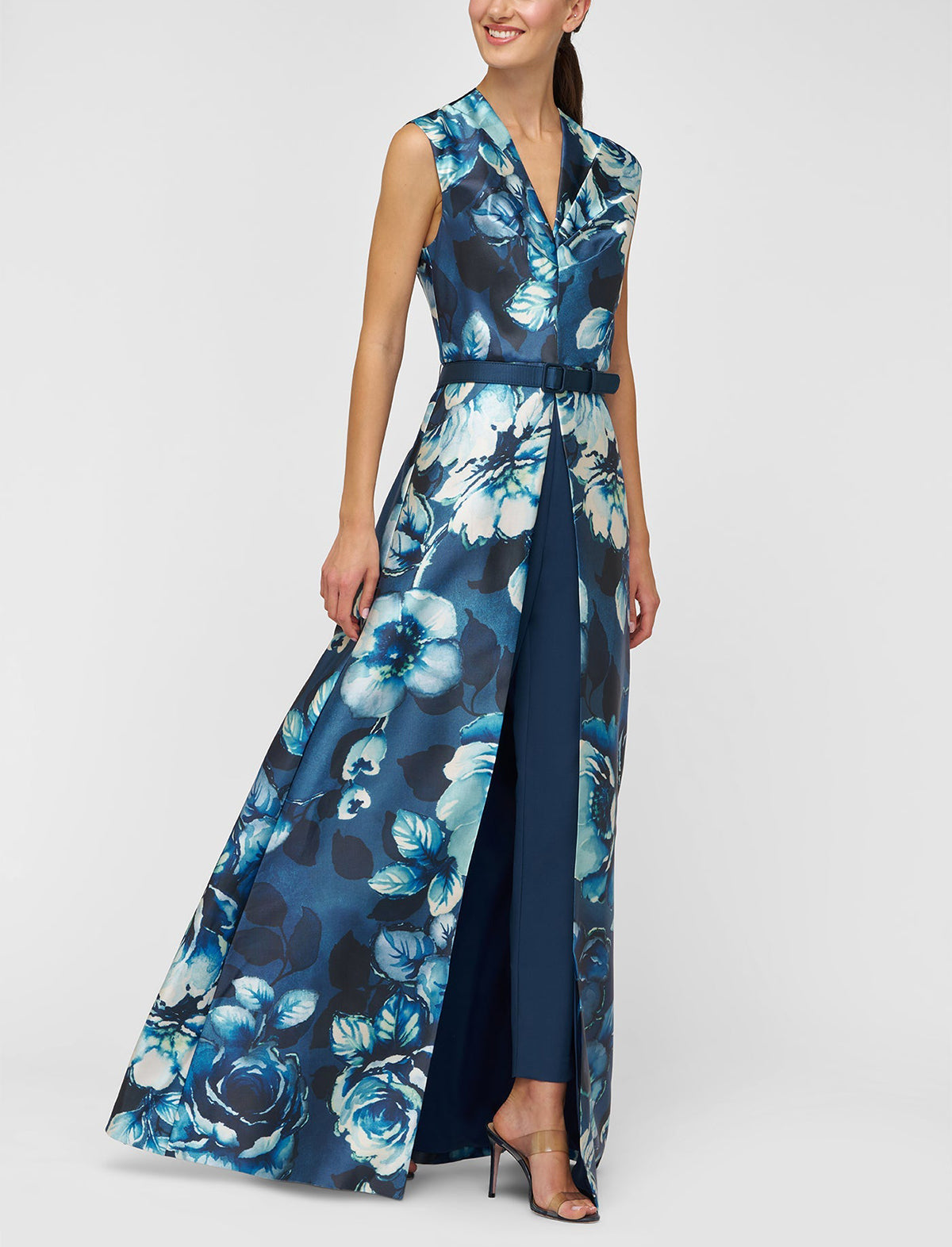 A fresh take on formalwear, this walk-thru jumpsuit is crafted from printed Mikado in a moody rose poppy motif. Designed with soft pleating along the bodice and stretch crepe pants, it balances structure and ease for any ceremony or reception.