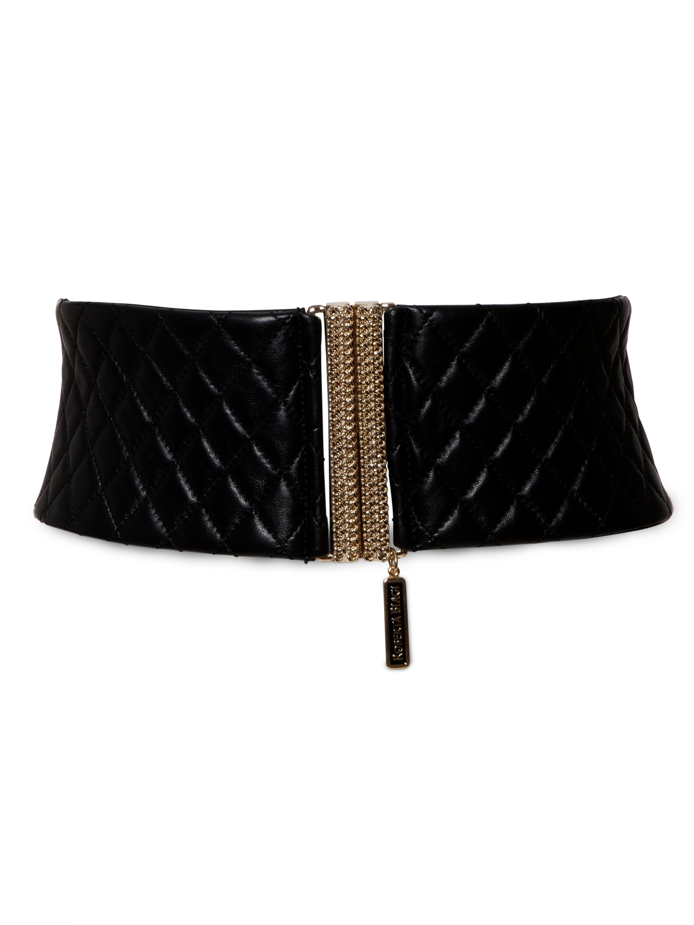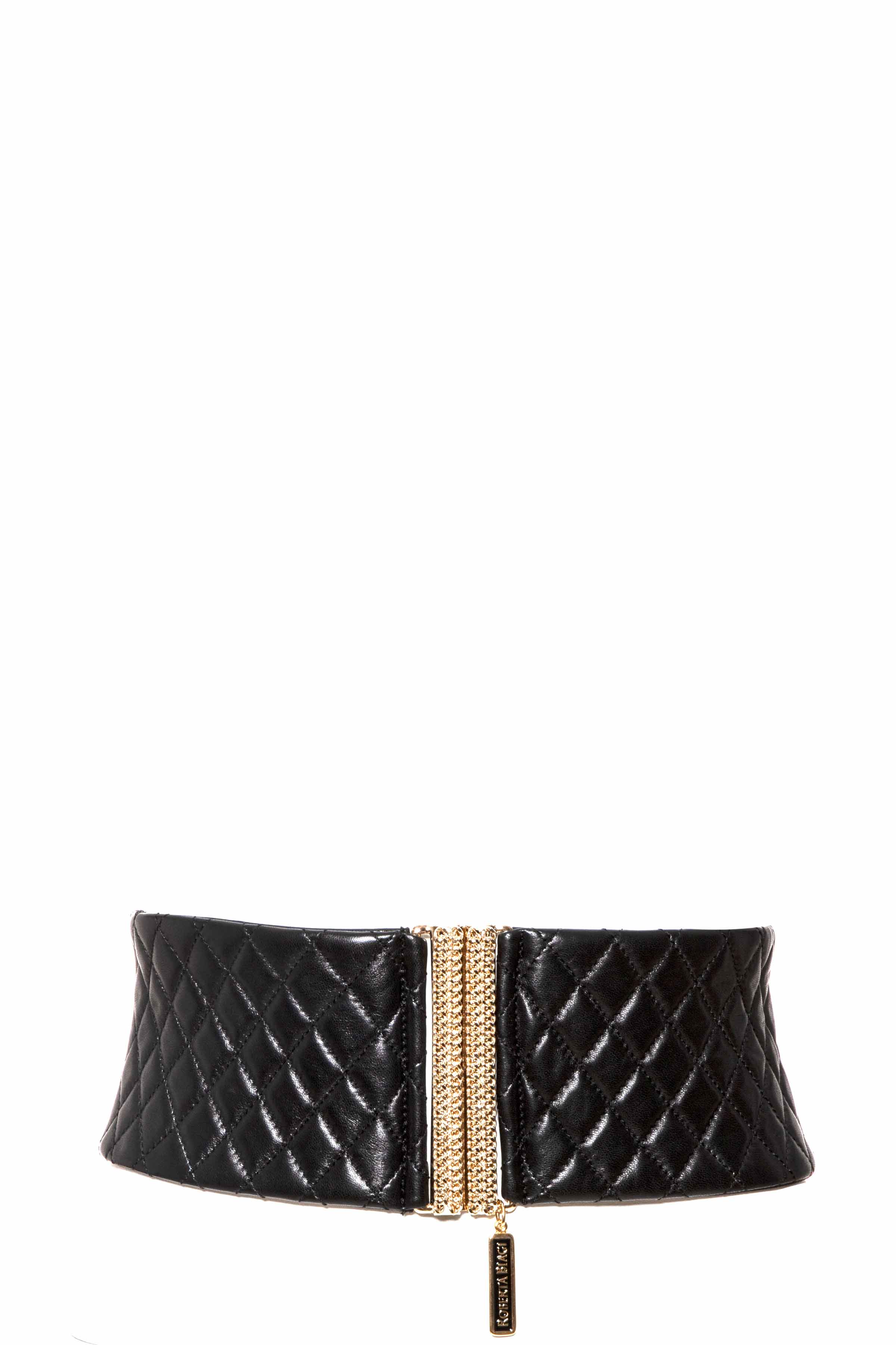 Black leather belt with diamond-shaped stitched design. Roberta Biagi's belt has a golden twist fastening and its elasticated. 100% Leather.