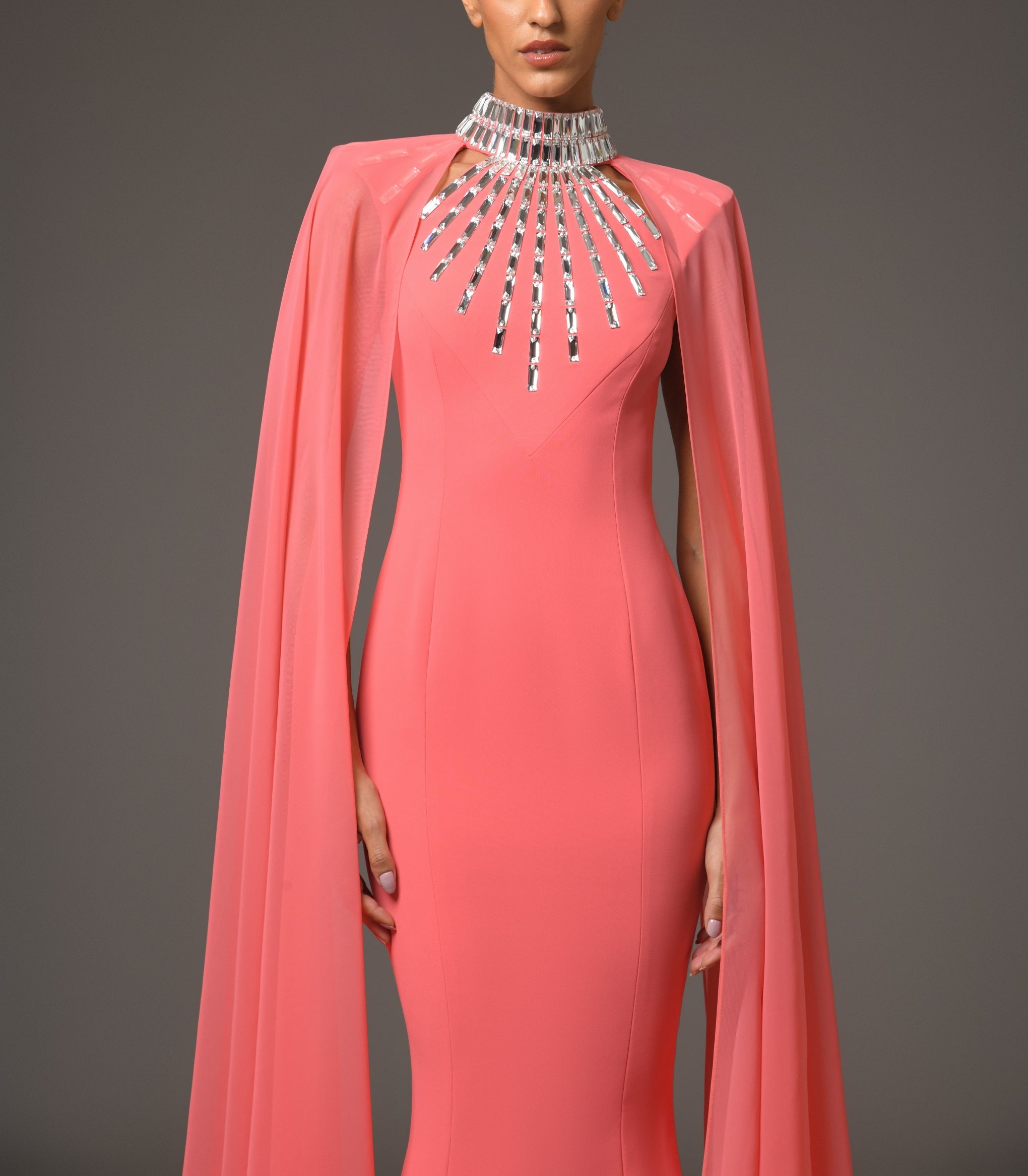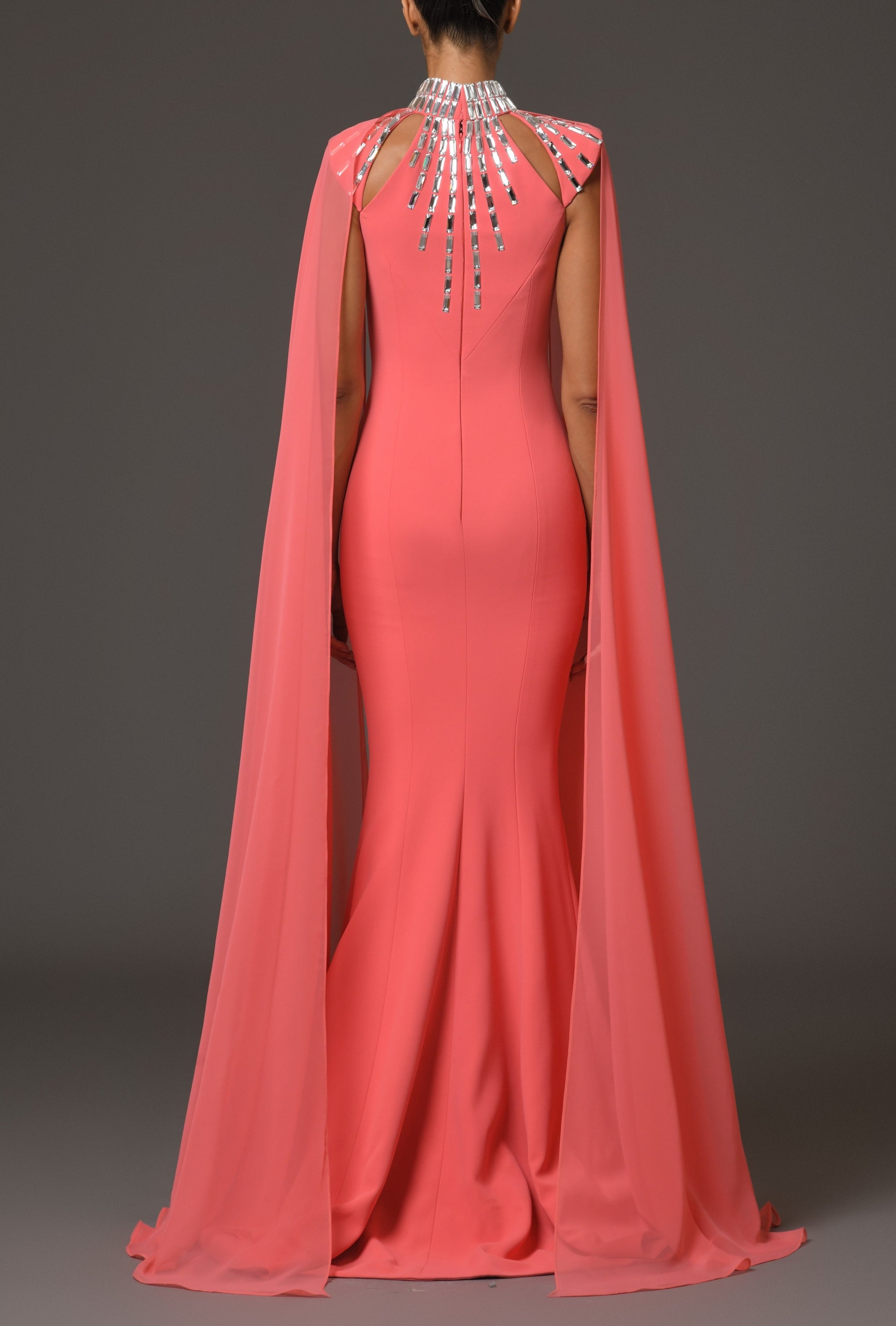 Coral Crepe Dress With Baguette Embroidery And Chiffon
