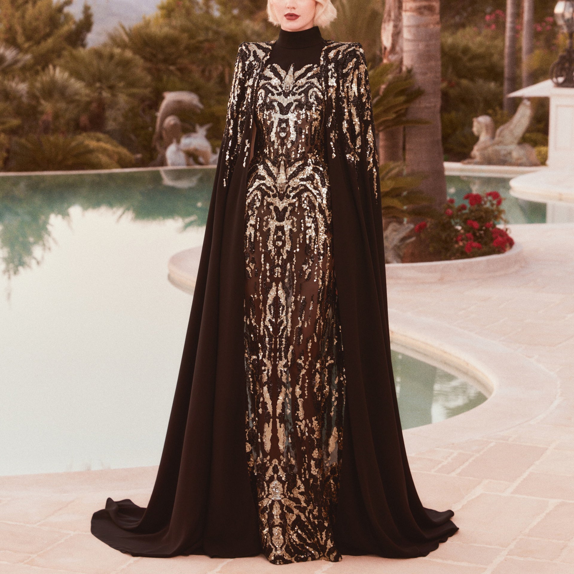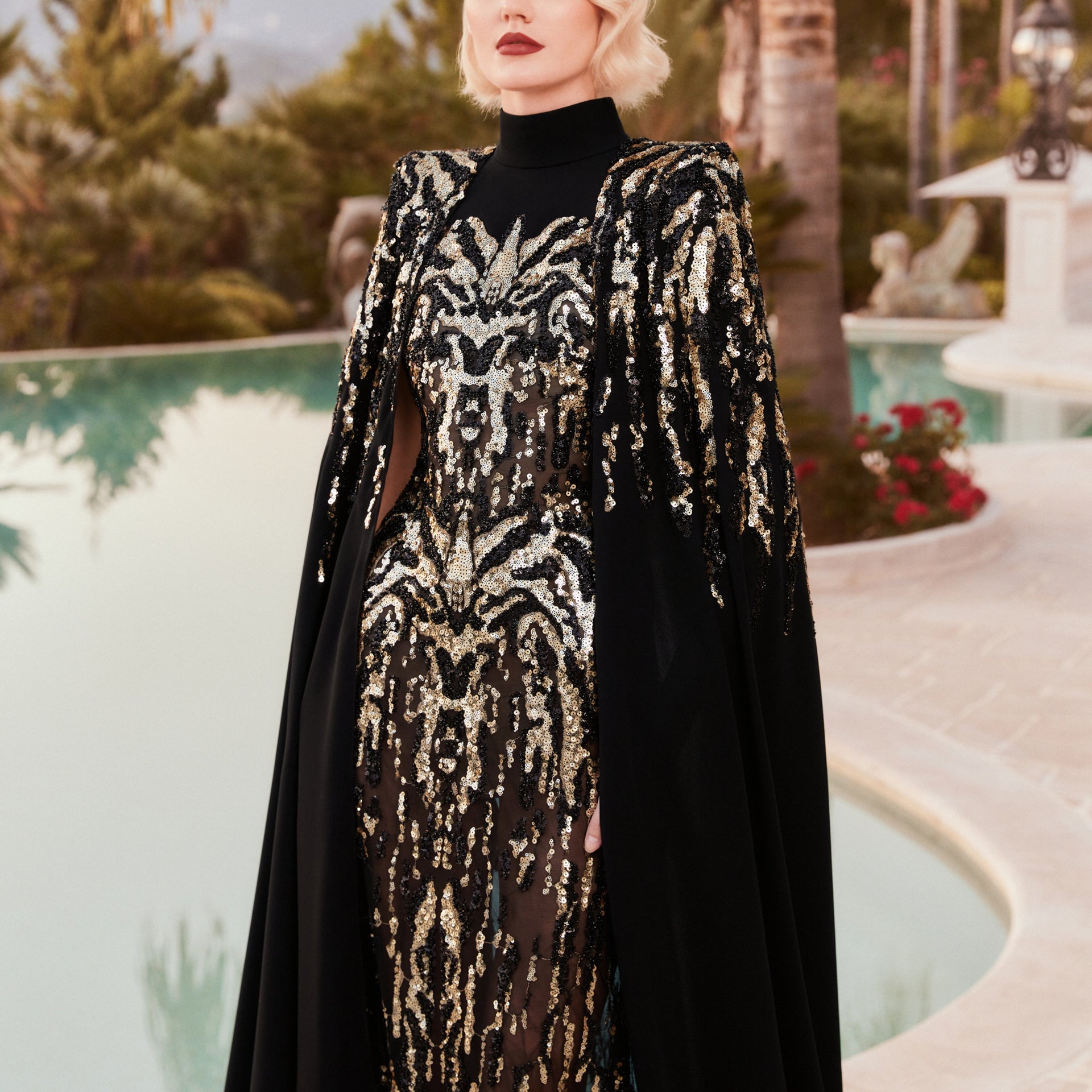 Black Mermaid-Cut Tulle Dress with Gold Yarn