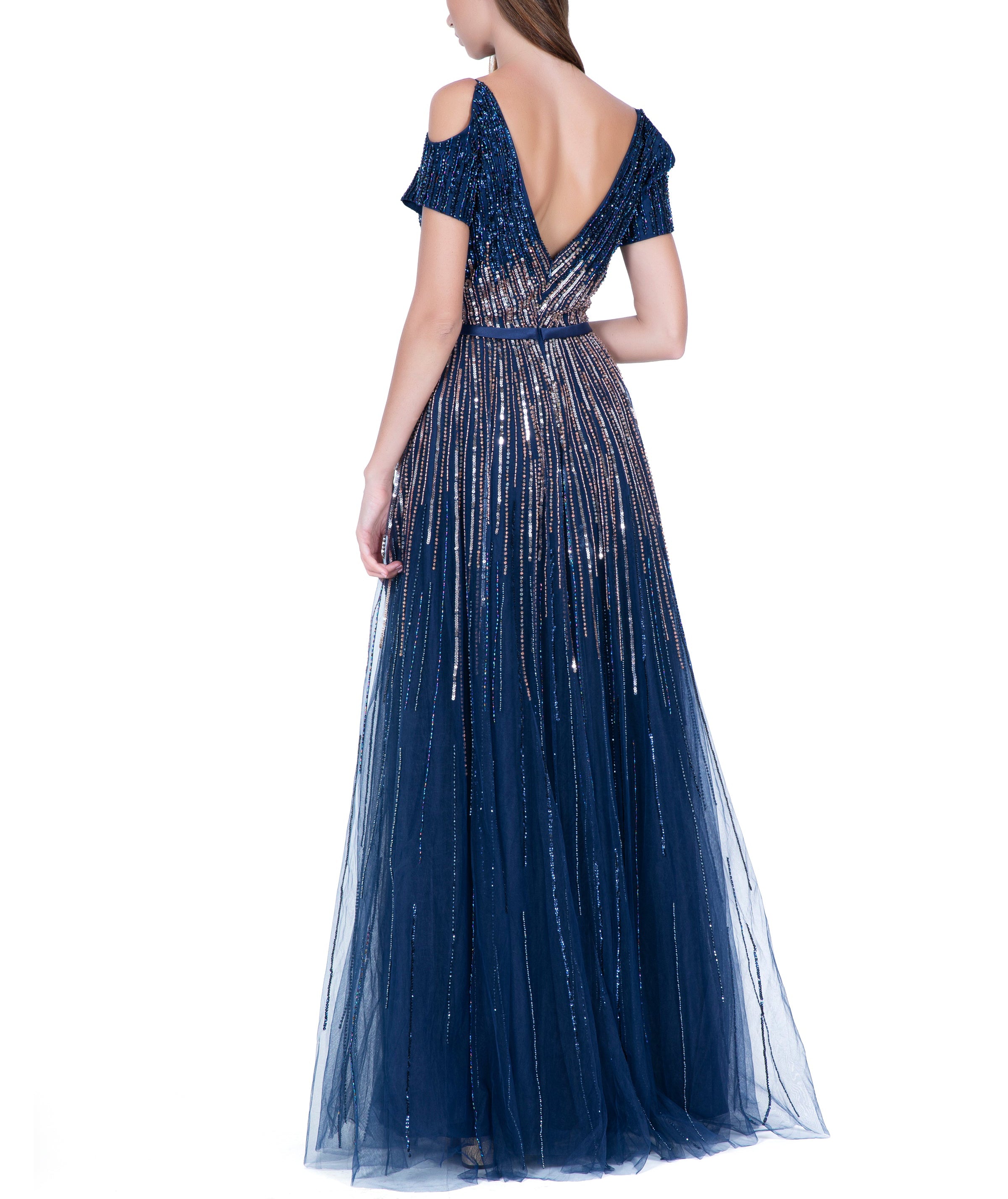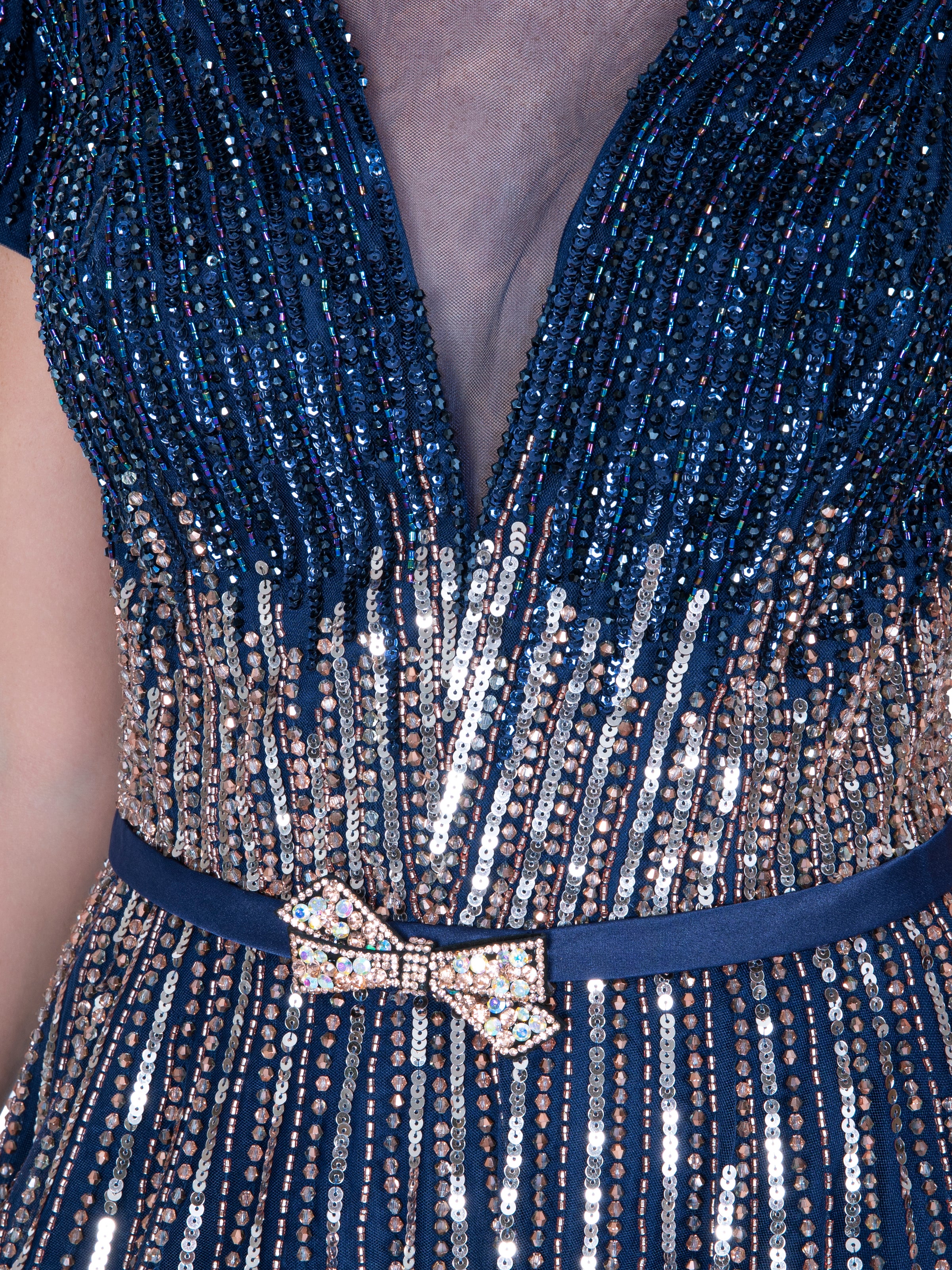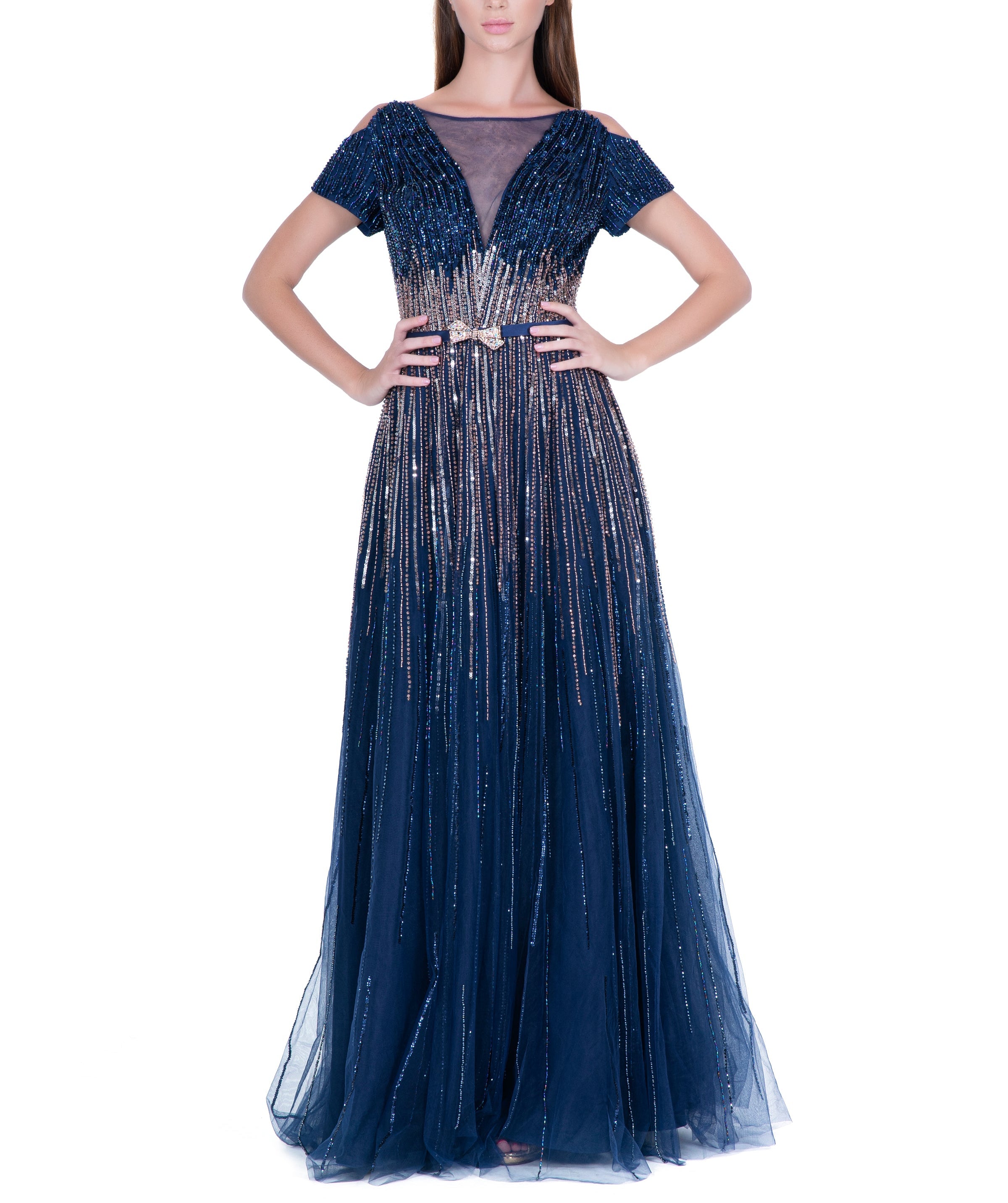 Blue Illusion V-Neck Embroidered Long Dress