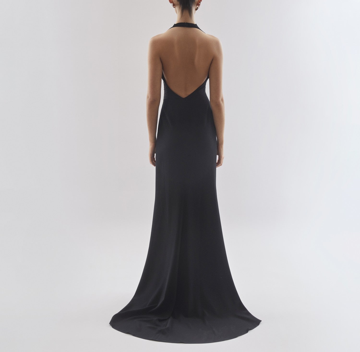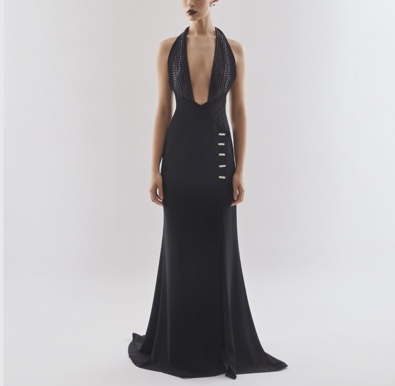 Crepe dress with plunging V neckline and beaded pearl bust, complete with a delicately draped georgette panel and an overlapping skirt finished with engraved metallic bamboo-like buttons