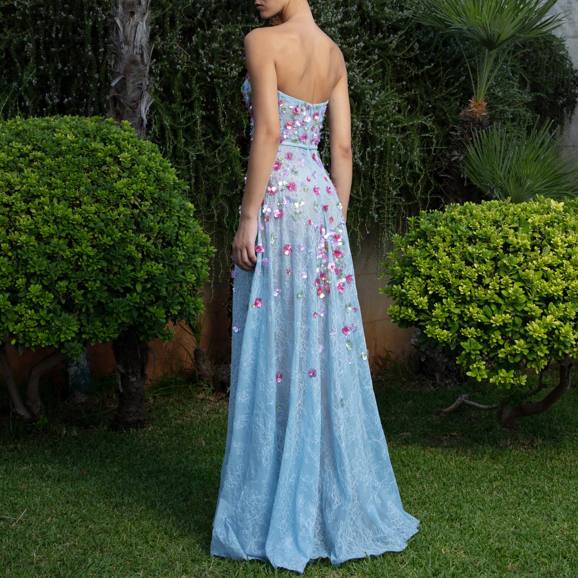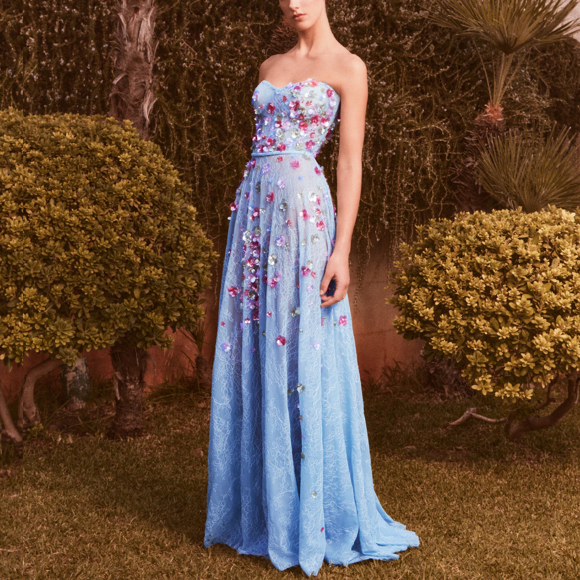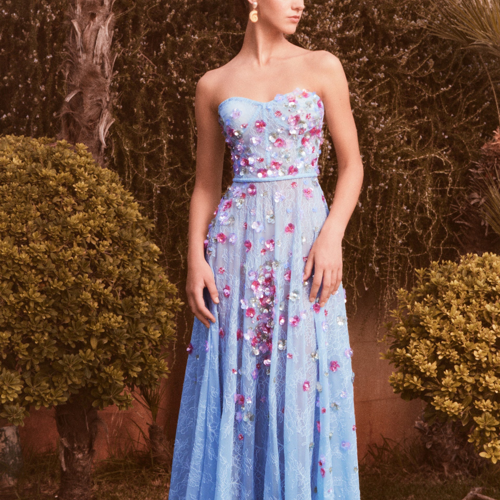 - Neckline: Corset top with a structured fit