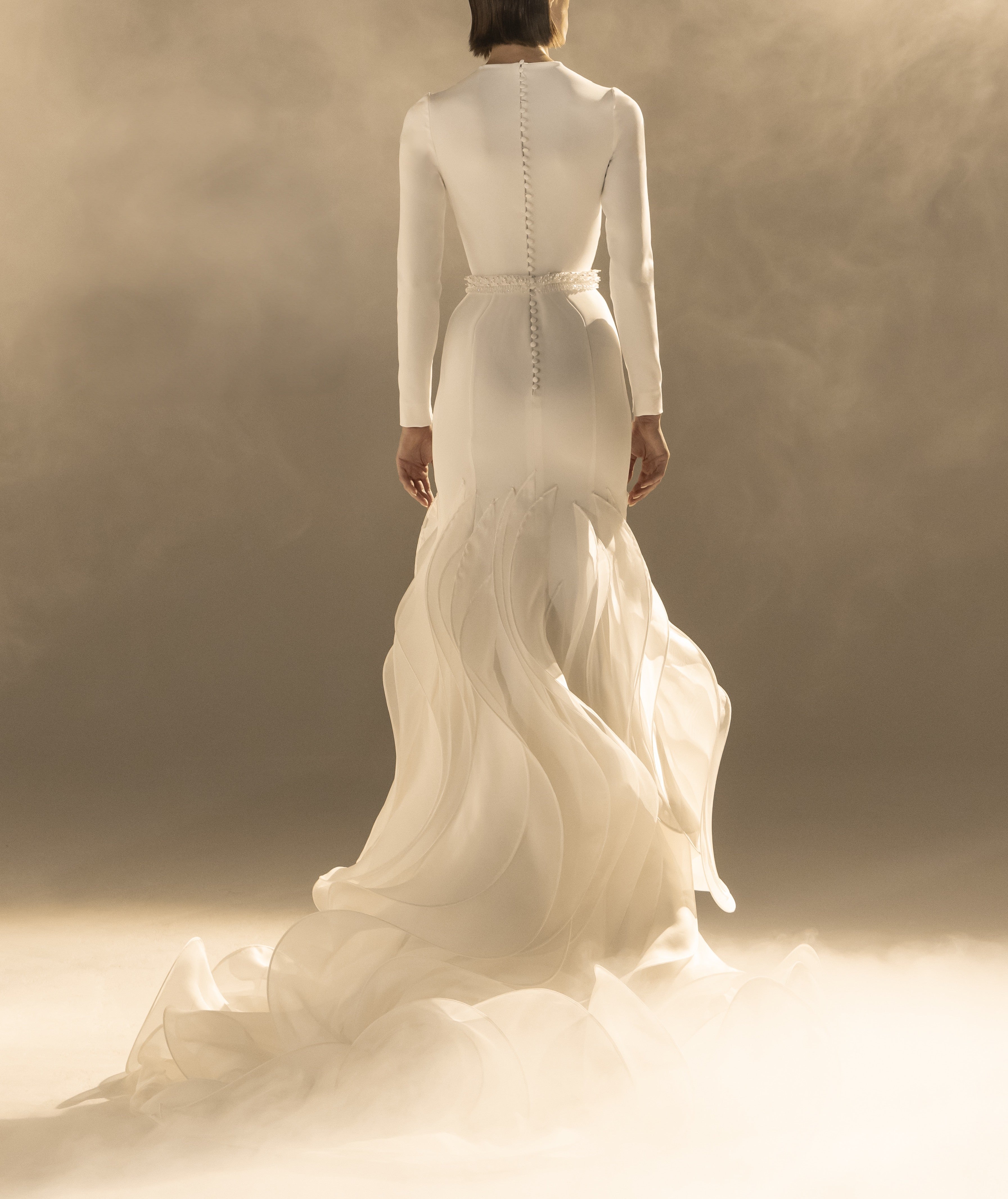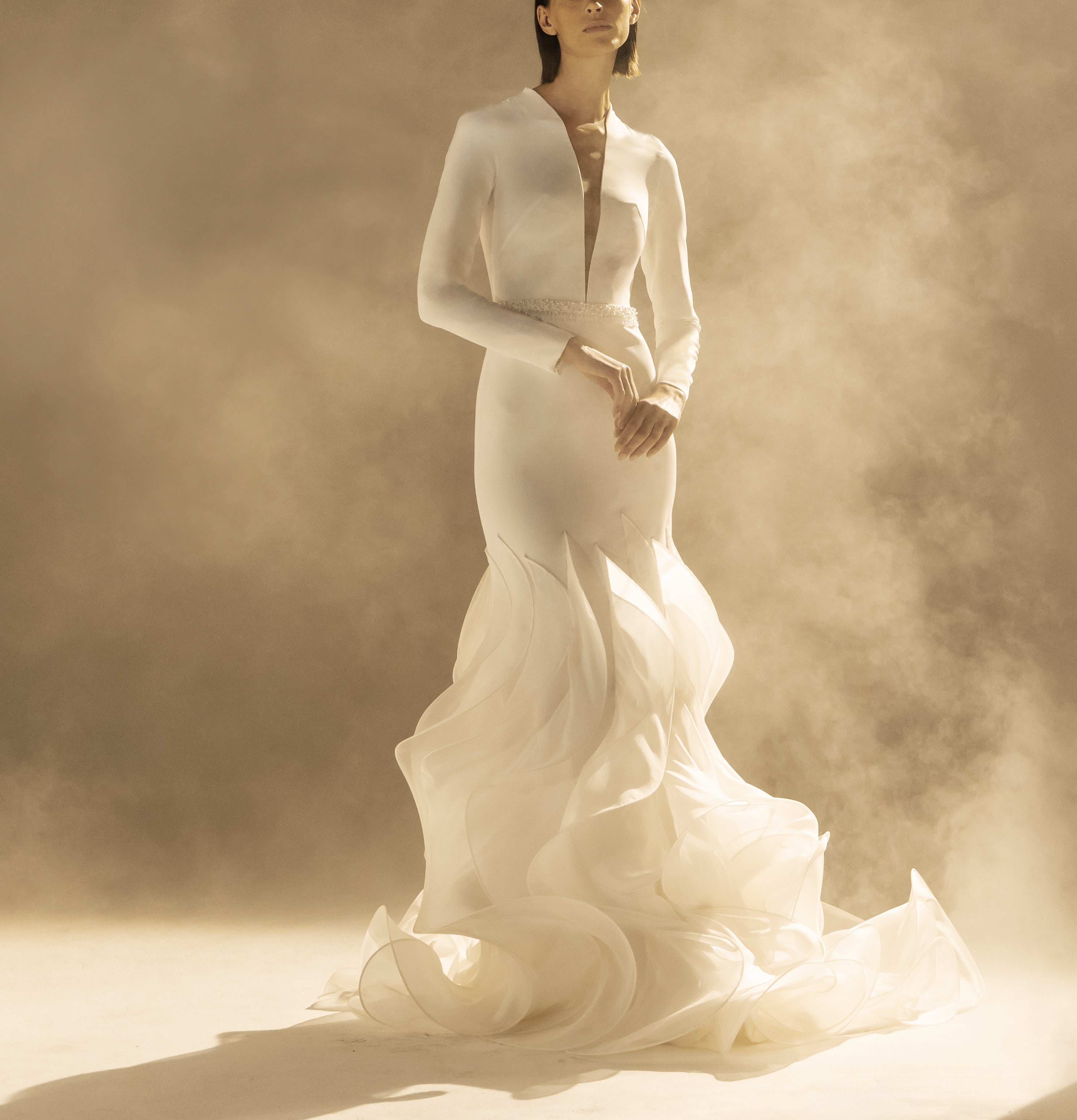 This gown embodies modern elegance with its sleek, form-fitting silhouette and dramatic ruffled train. The plunging neckline and long sleeves create a captivating contrast, making it a statement piece for a sophisticated bride.