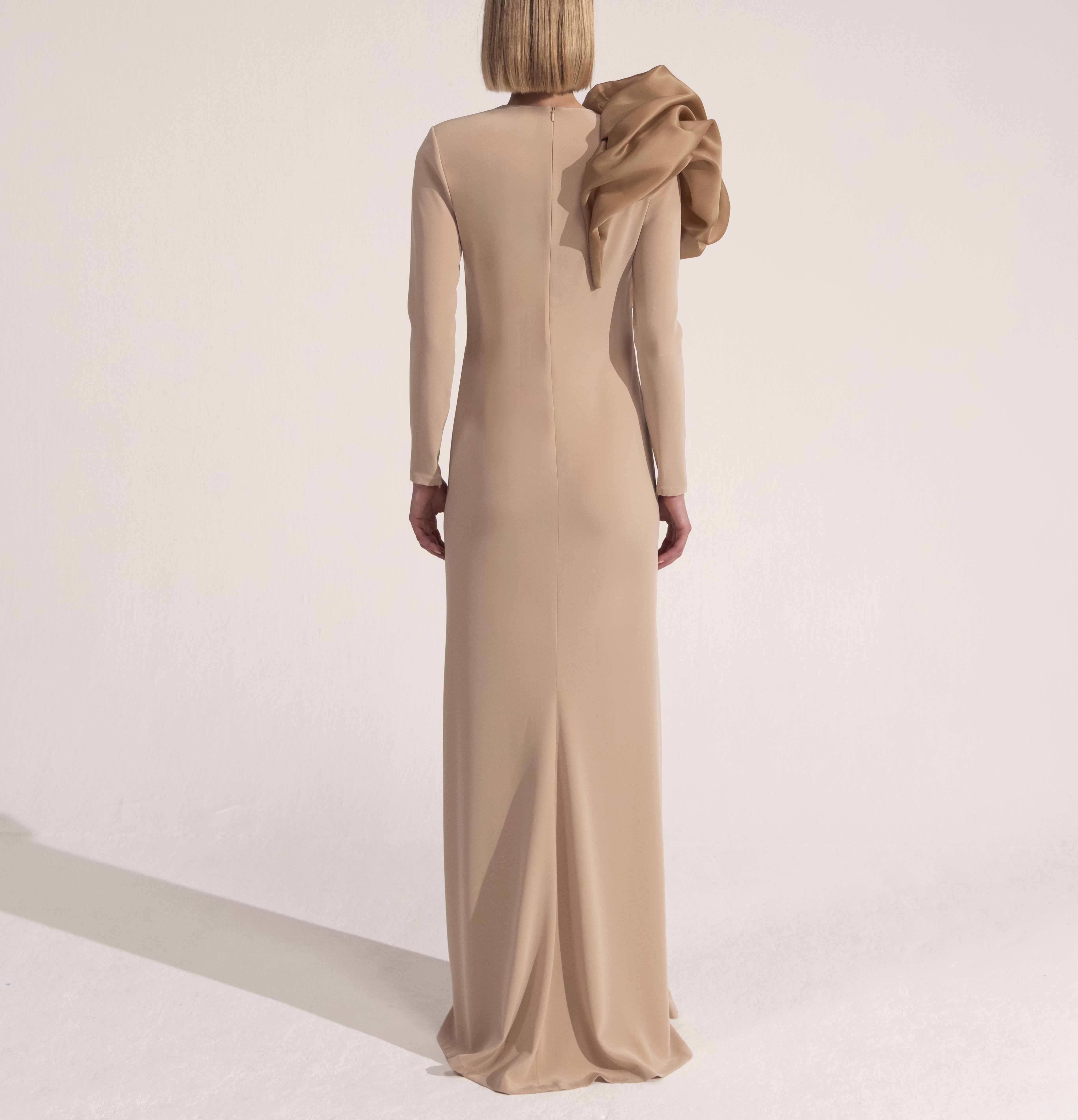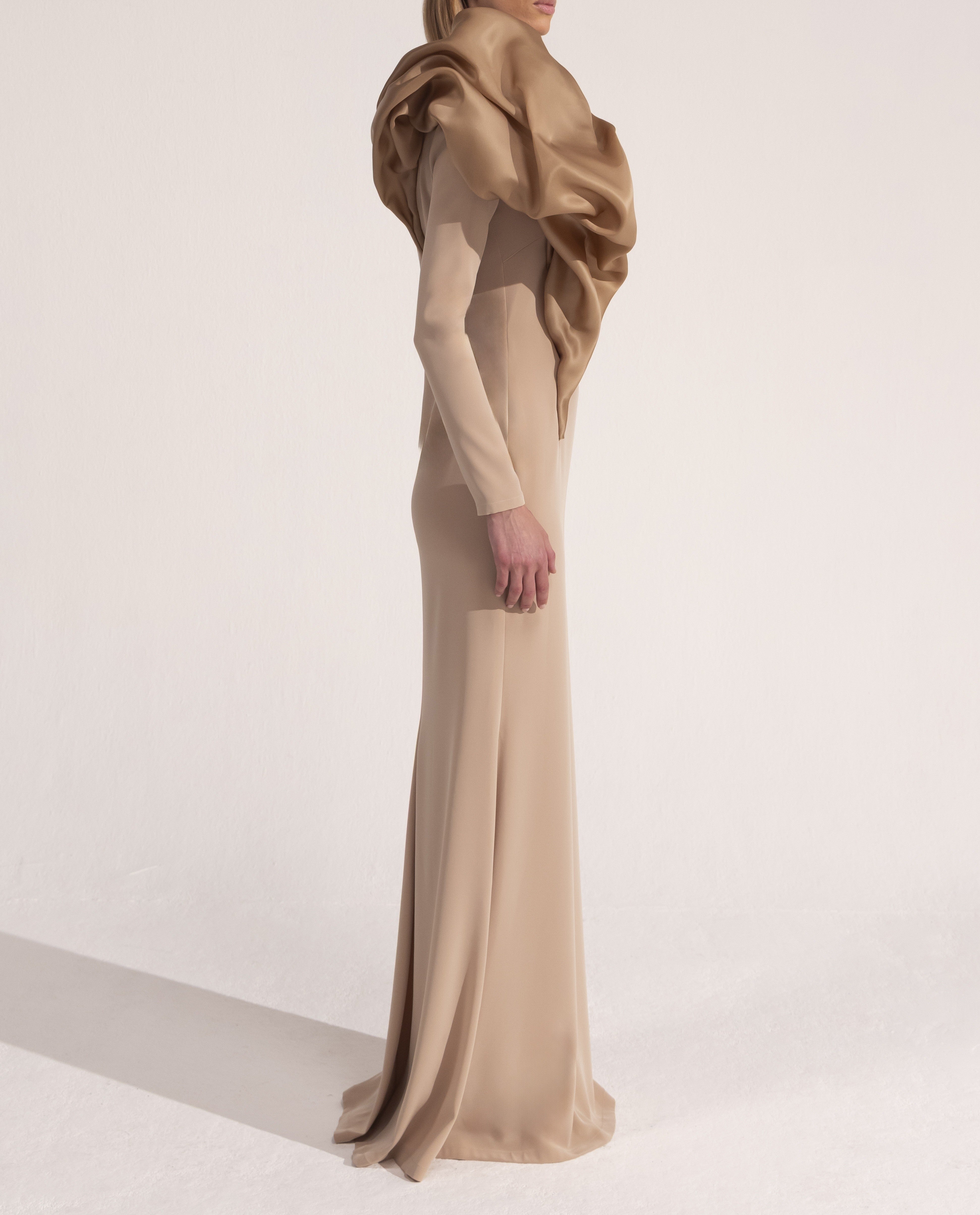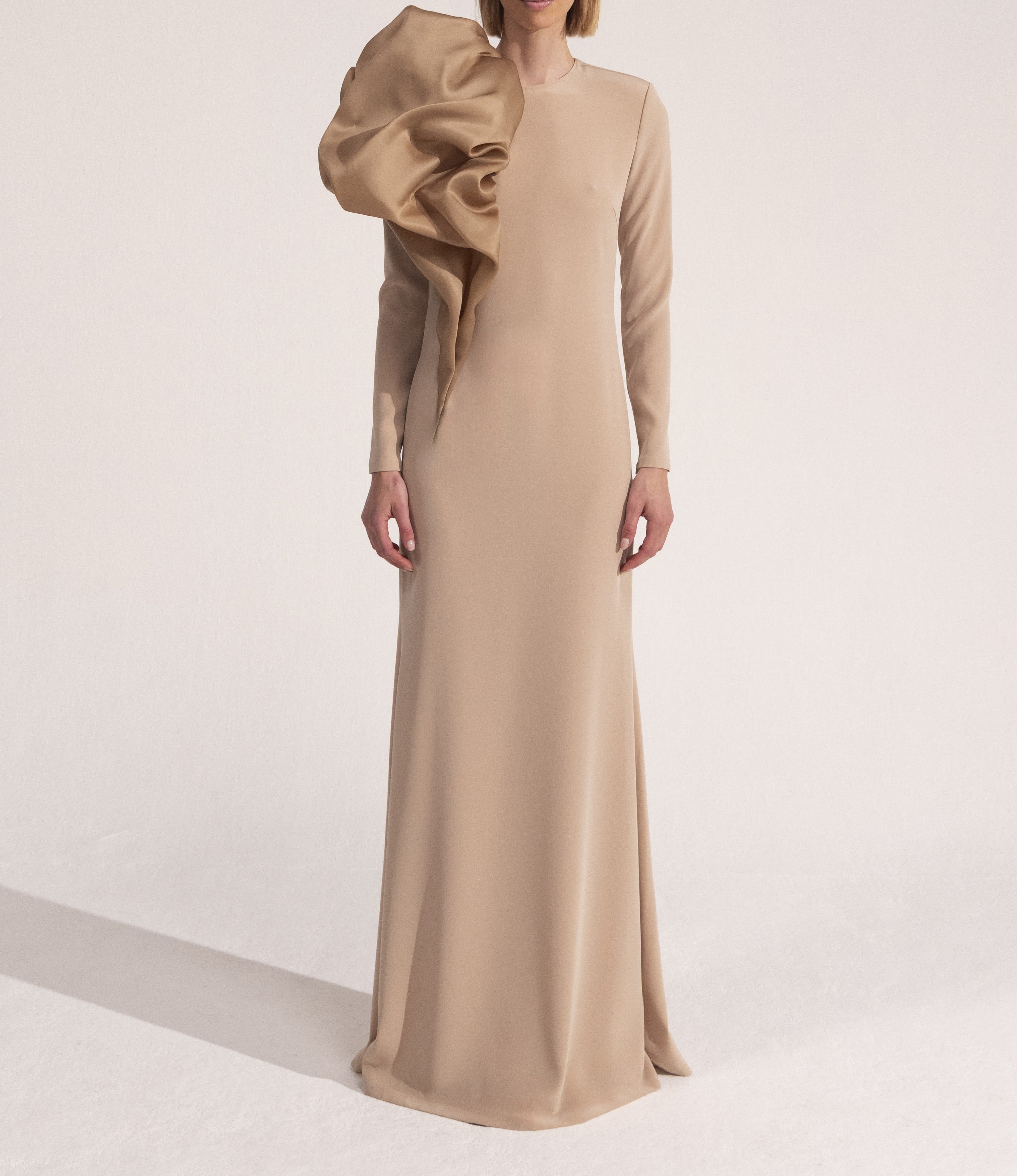 - This elegant gown features a sophisticated beige hue and a striking asymmetric ruffle detail on the shoulder. The long sleeves and flowing, floor-length skirt create a graceful silhouette, perfect for formal occasions.