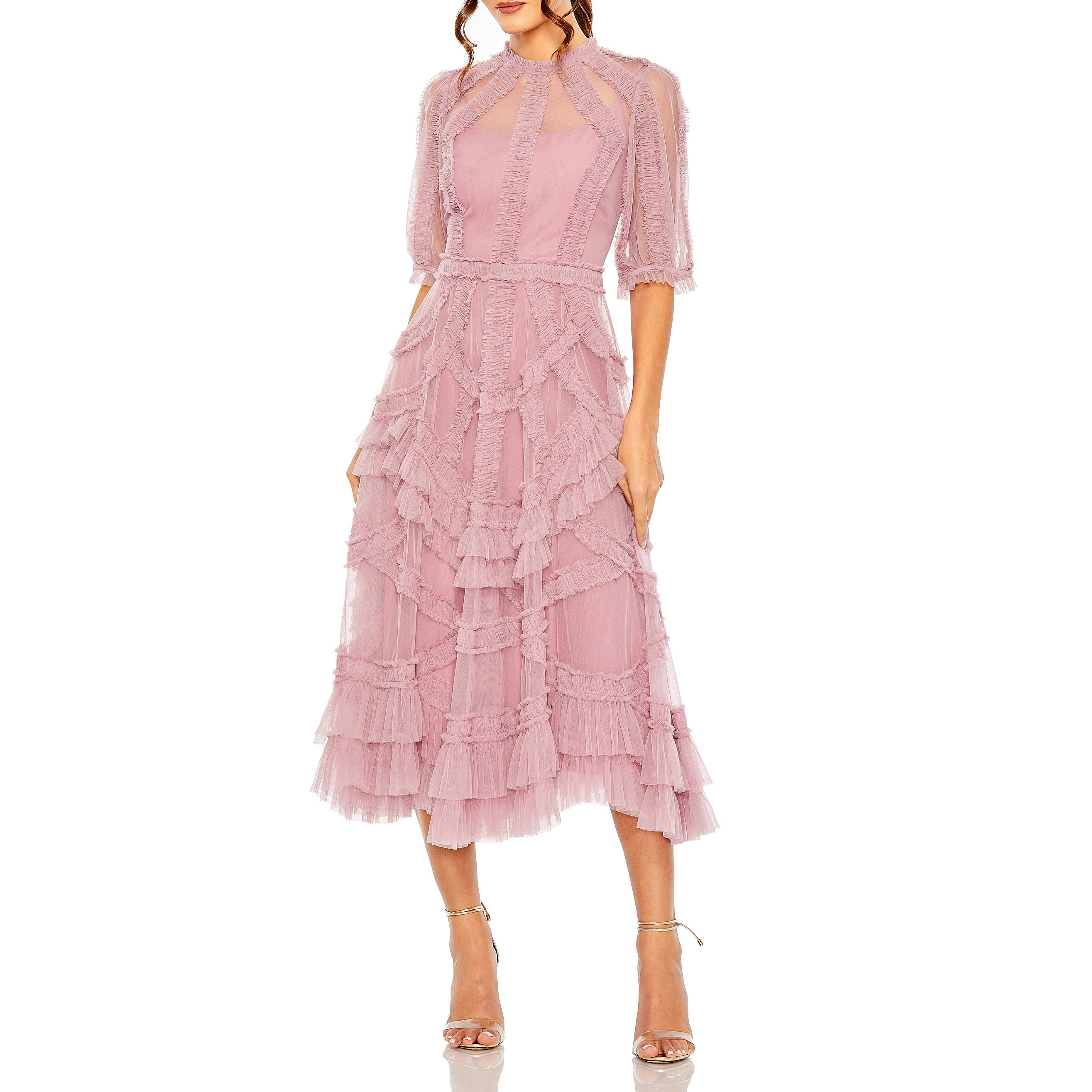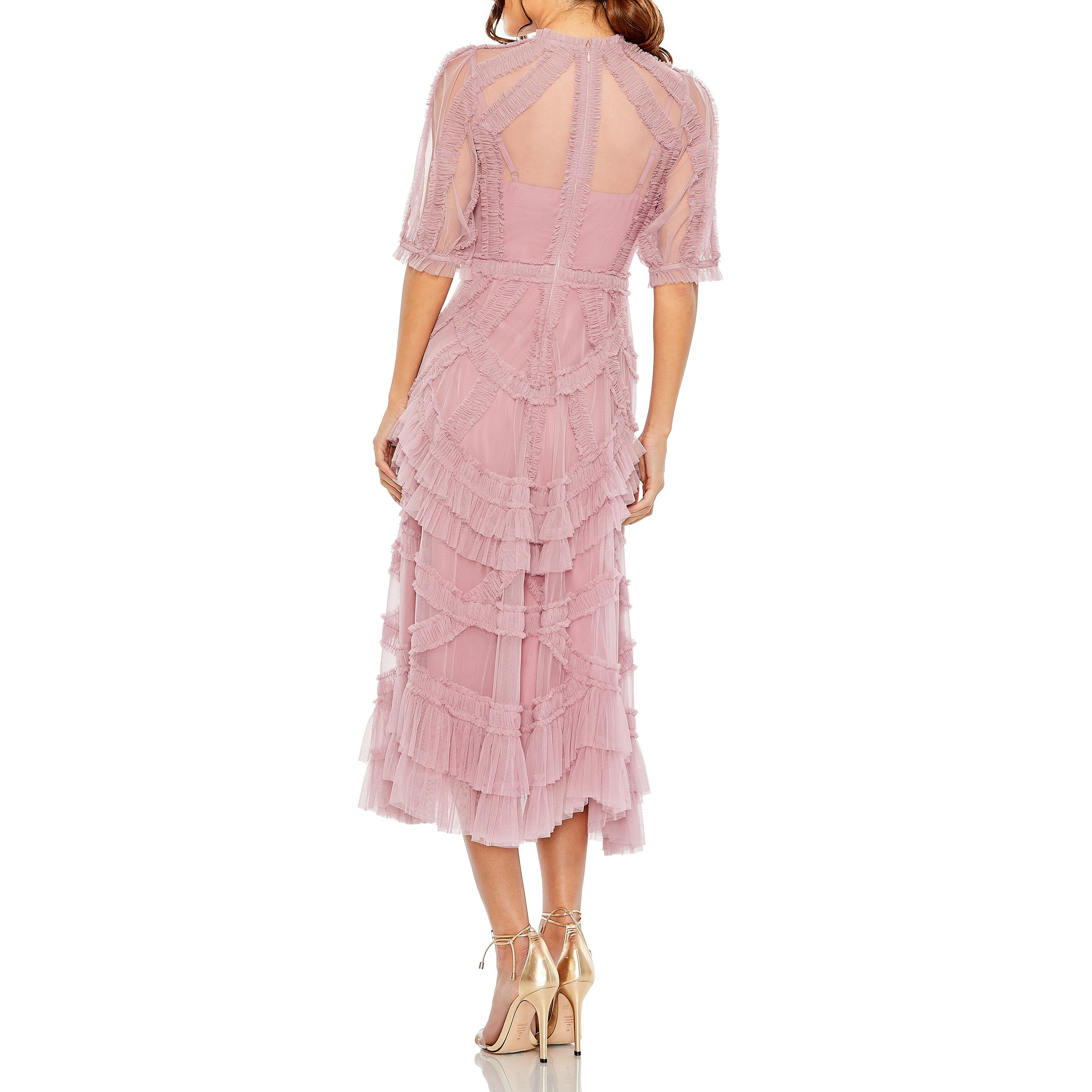 - Partially lined bodice; fully lined skirt; sheer unlined sleeves