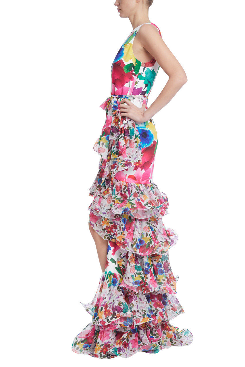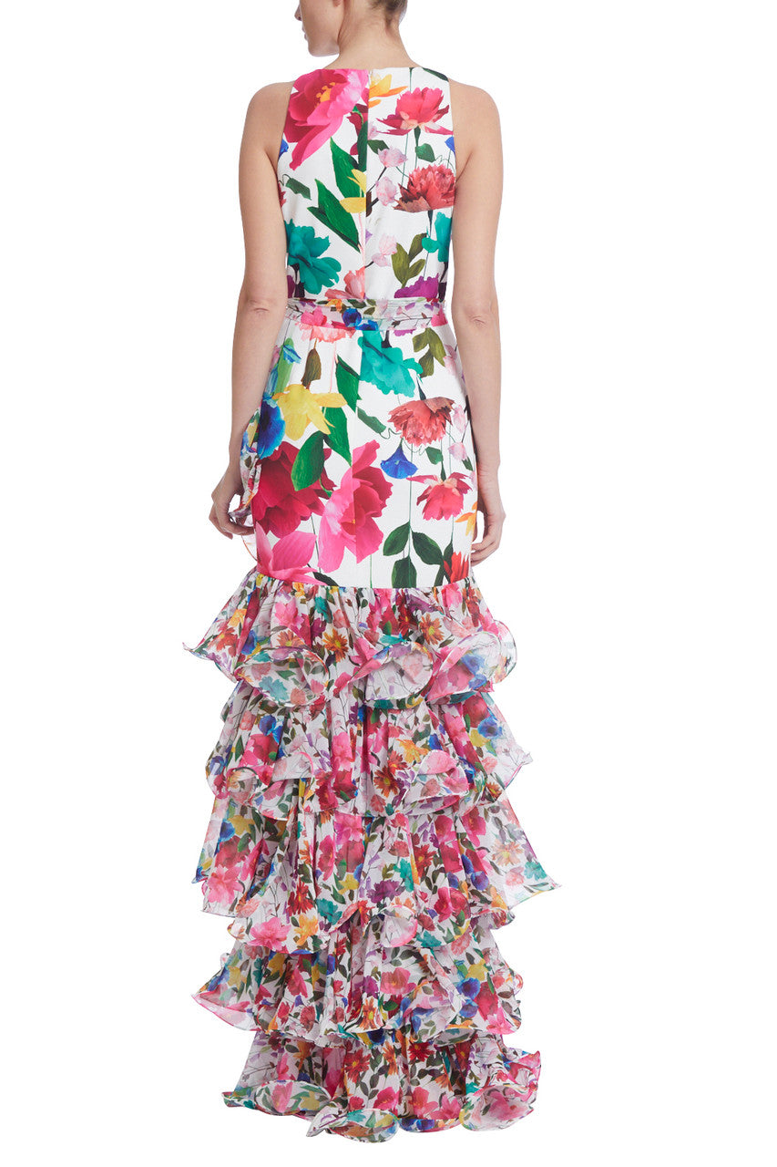 Sleeveless Floral Silk Maxi Gown With Ruffled Slit