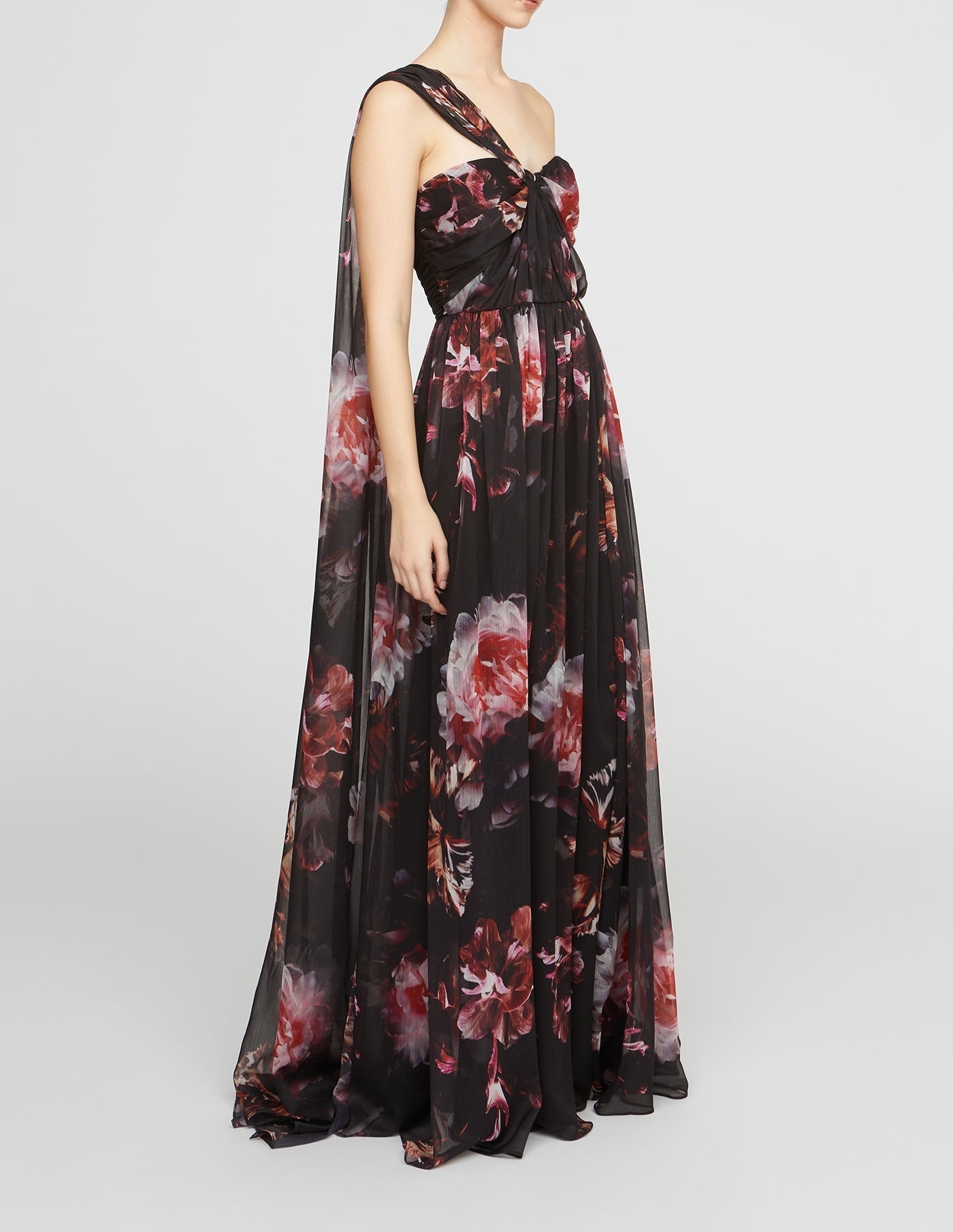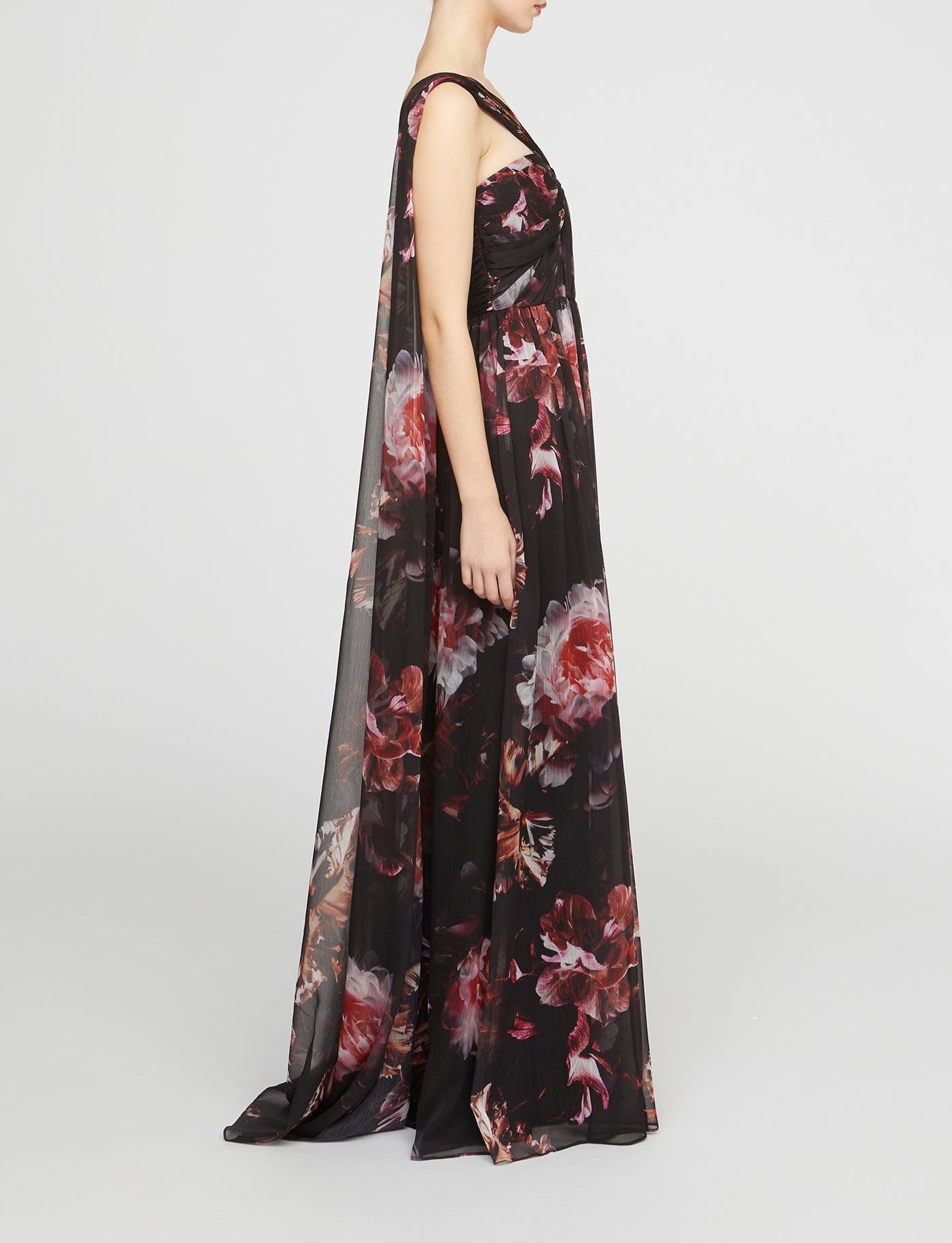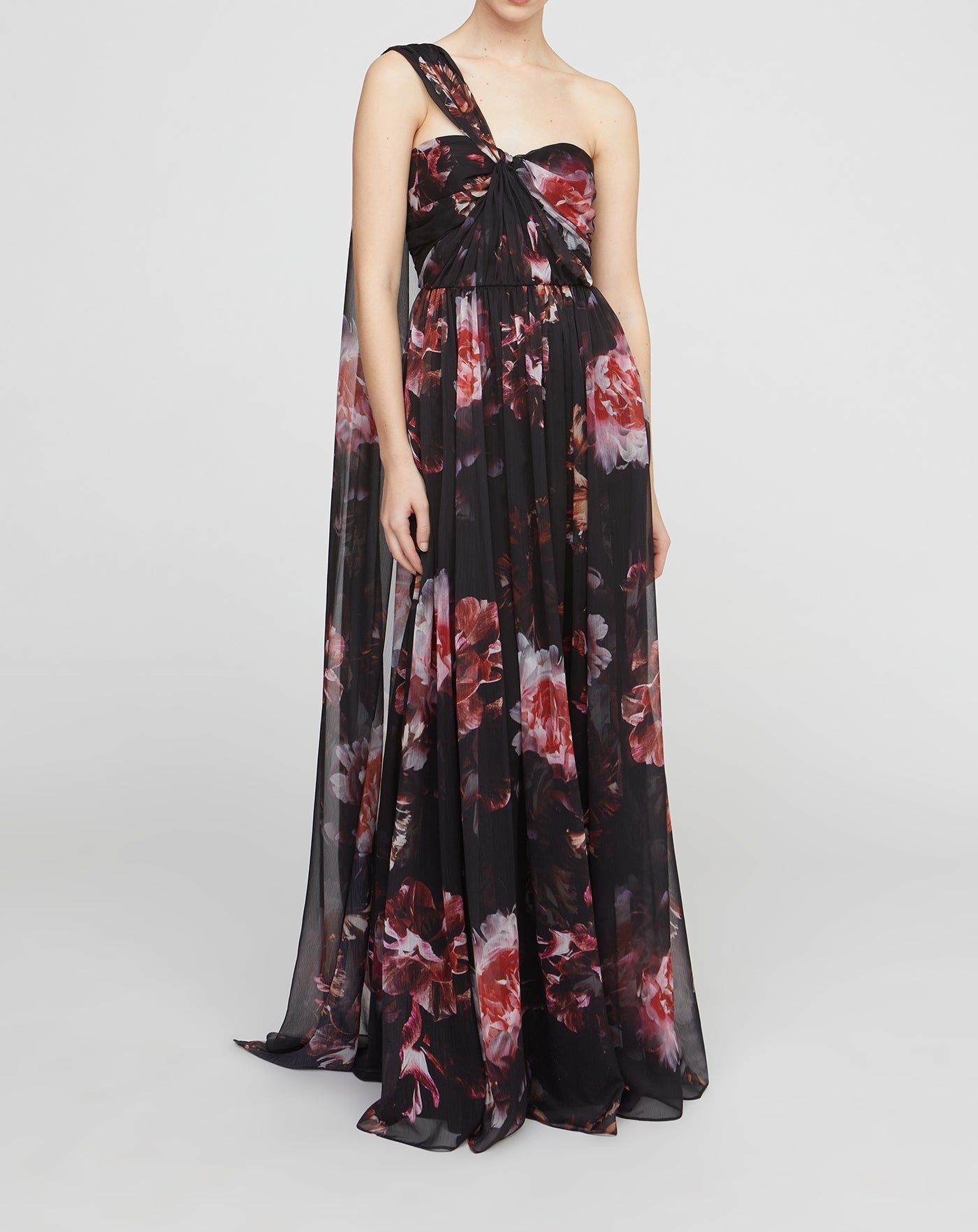 Printed chiffon one-shoulder gown with a twisted sweetheart bodice and flowing scarf detail. The full skirt moves with ease, blooming in moody florals—ideal for fall weddings and black-tie events.
