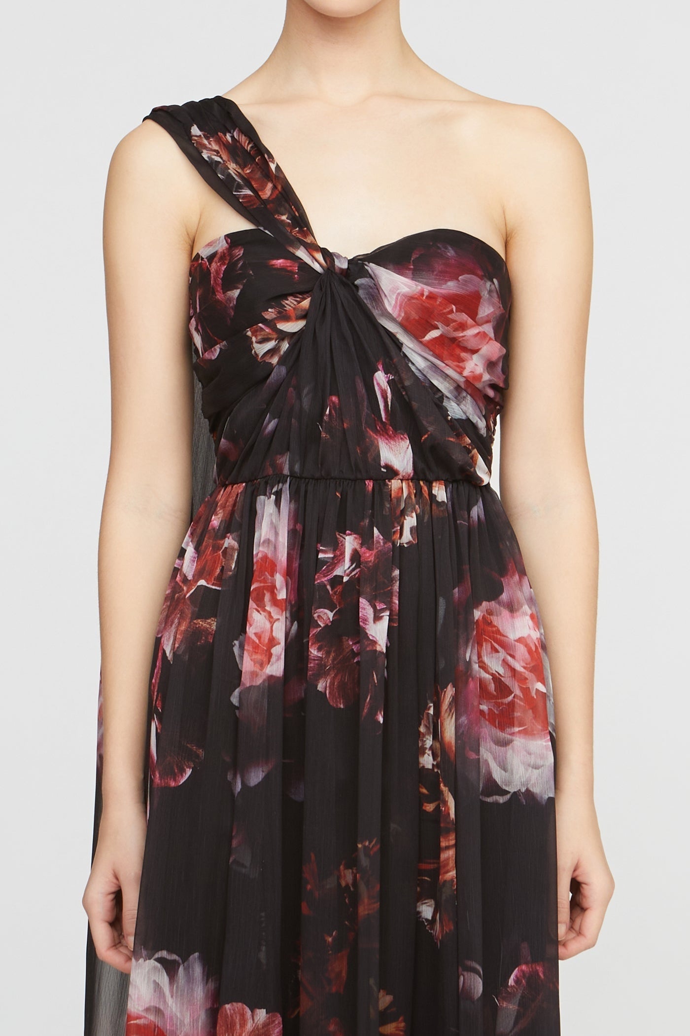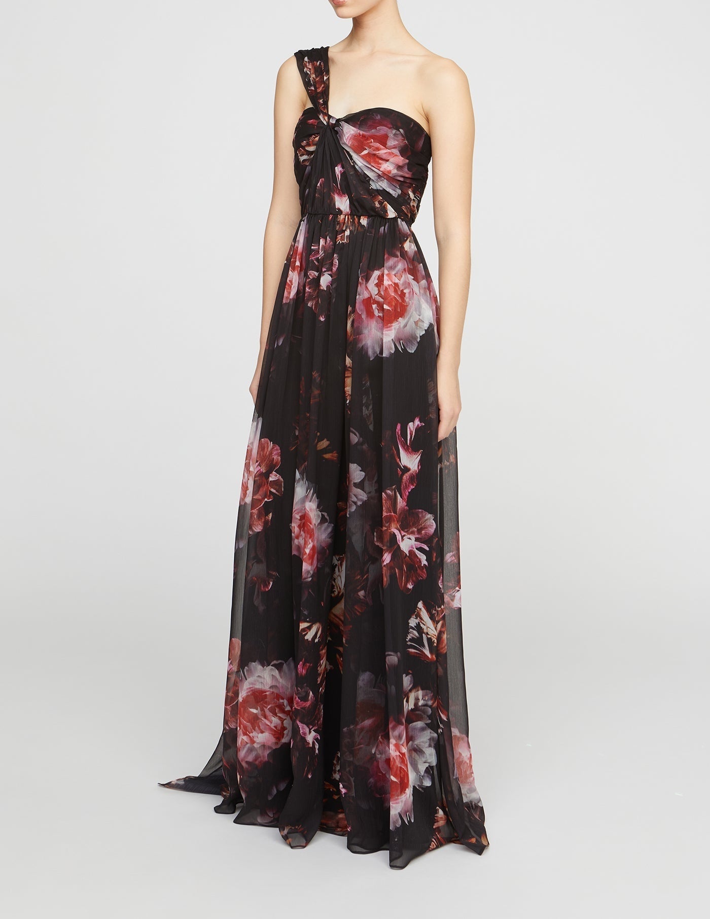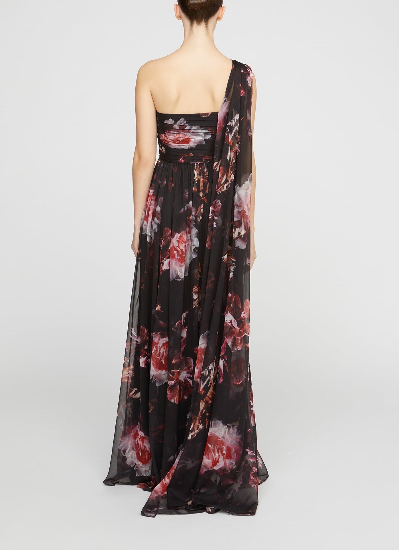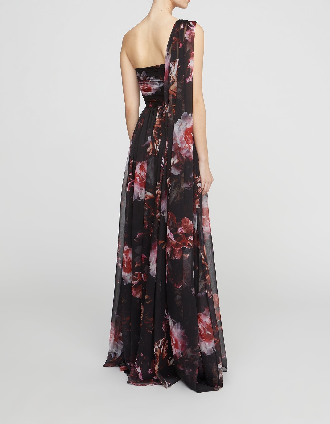 Printed chiffon one-shoulder gown with a twisted sweetheart bodice and flowing scarf detail. The full skirt moves with ease, blooming in moody florals—ideal for fall weddings and black-tie events.