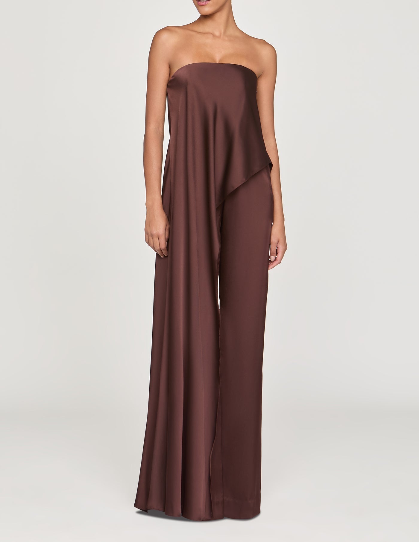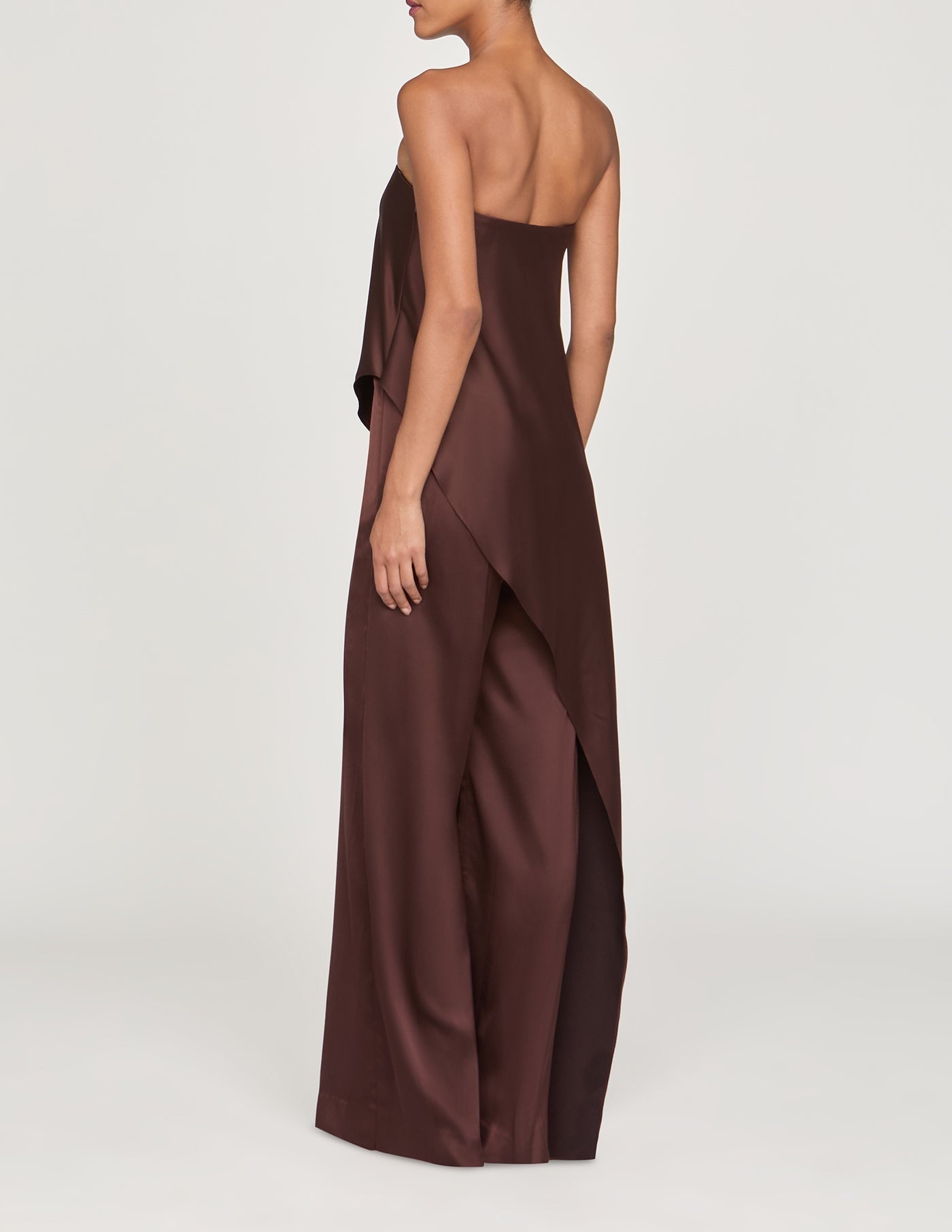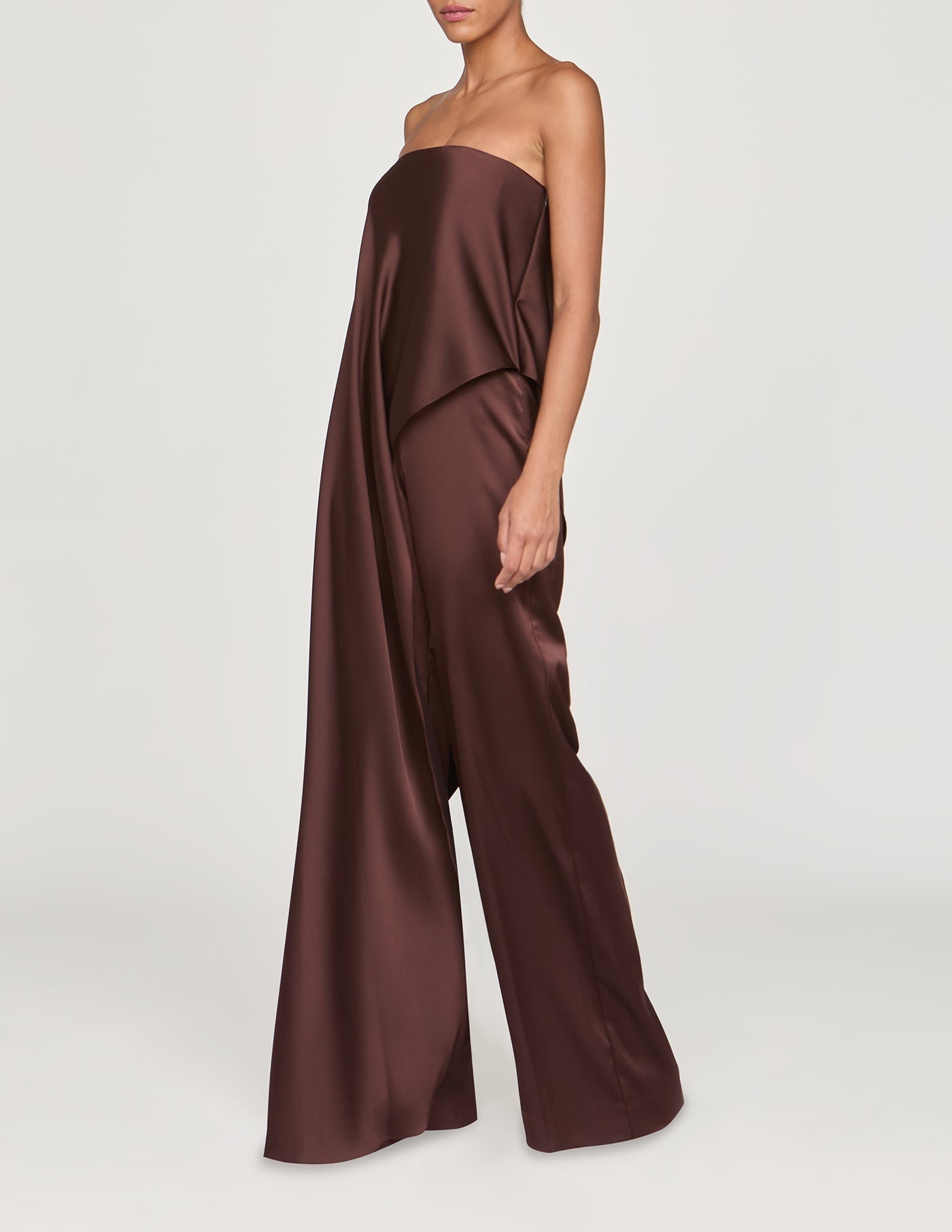 Strapless crepe-back satin jumpsuit with an asymmetric draped overlay. Cut with wide legs for fluid movement and a soft luster that catches the light—minimal, but makes an impact.