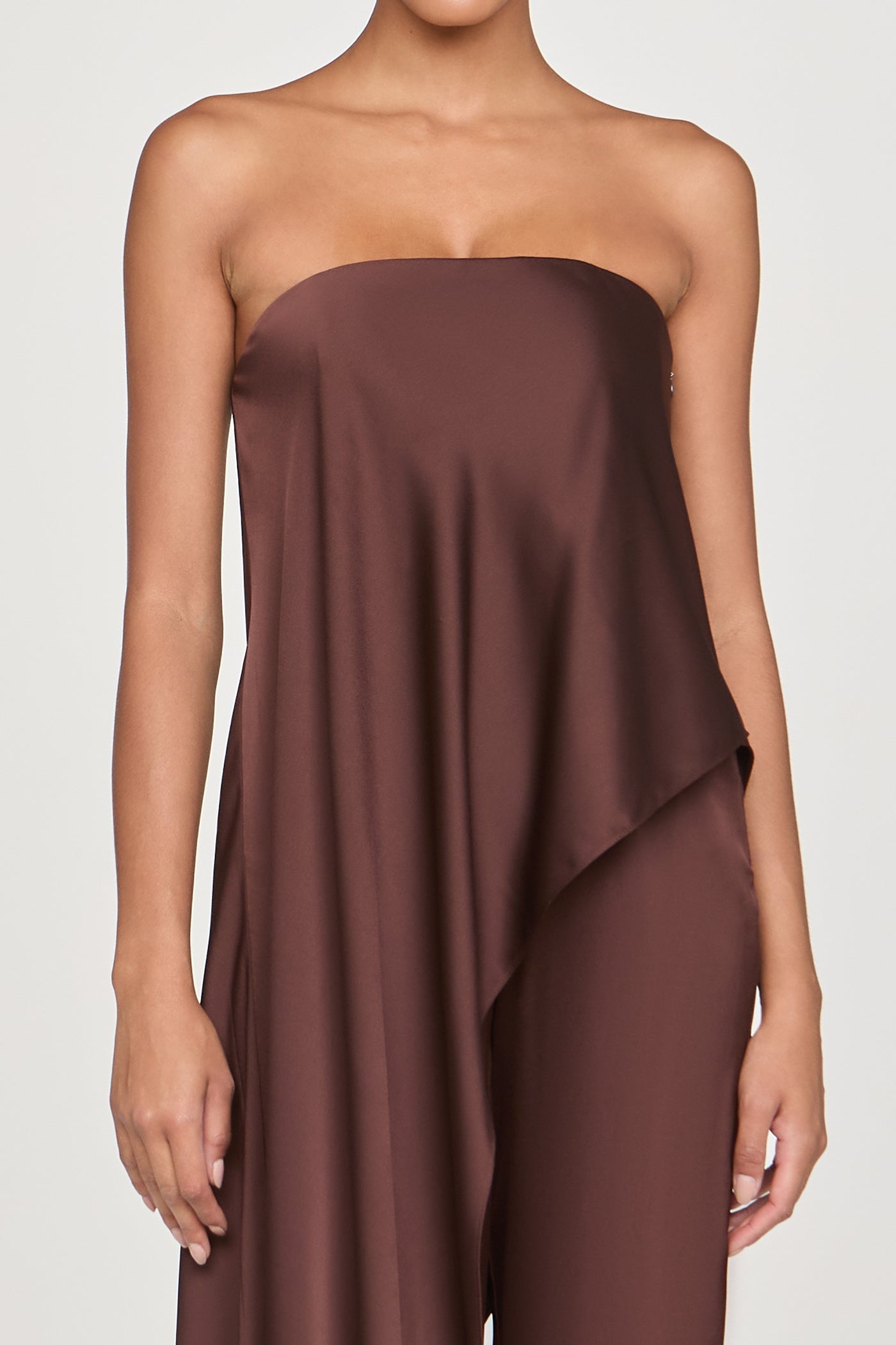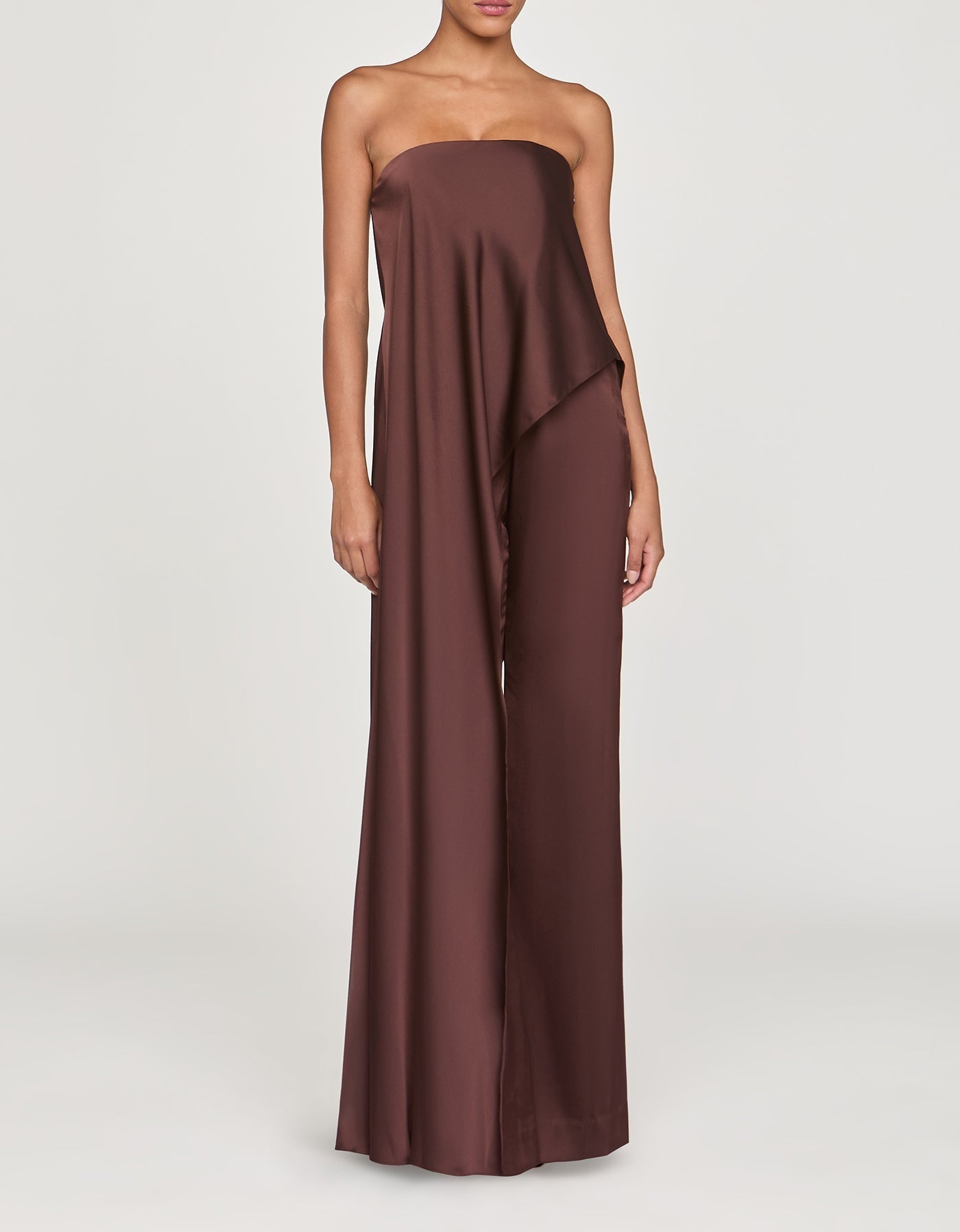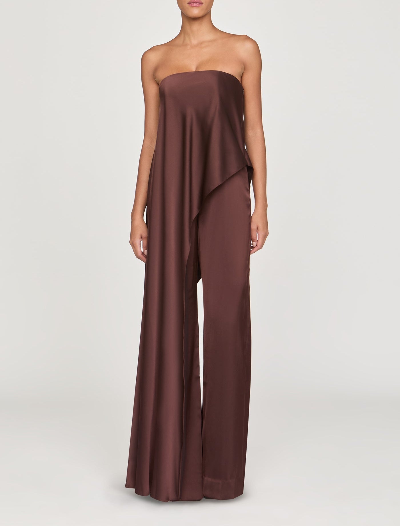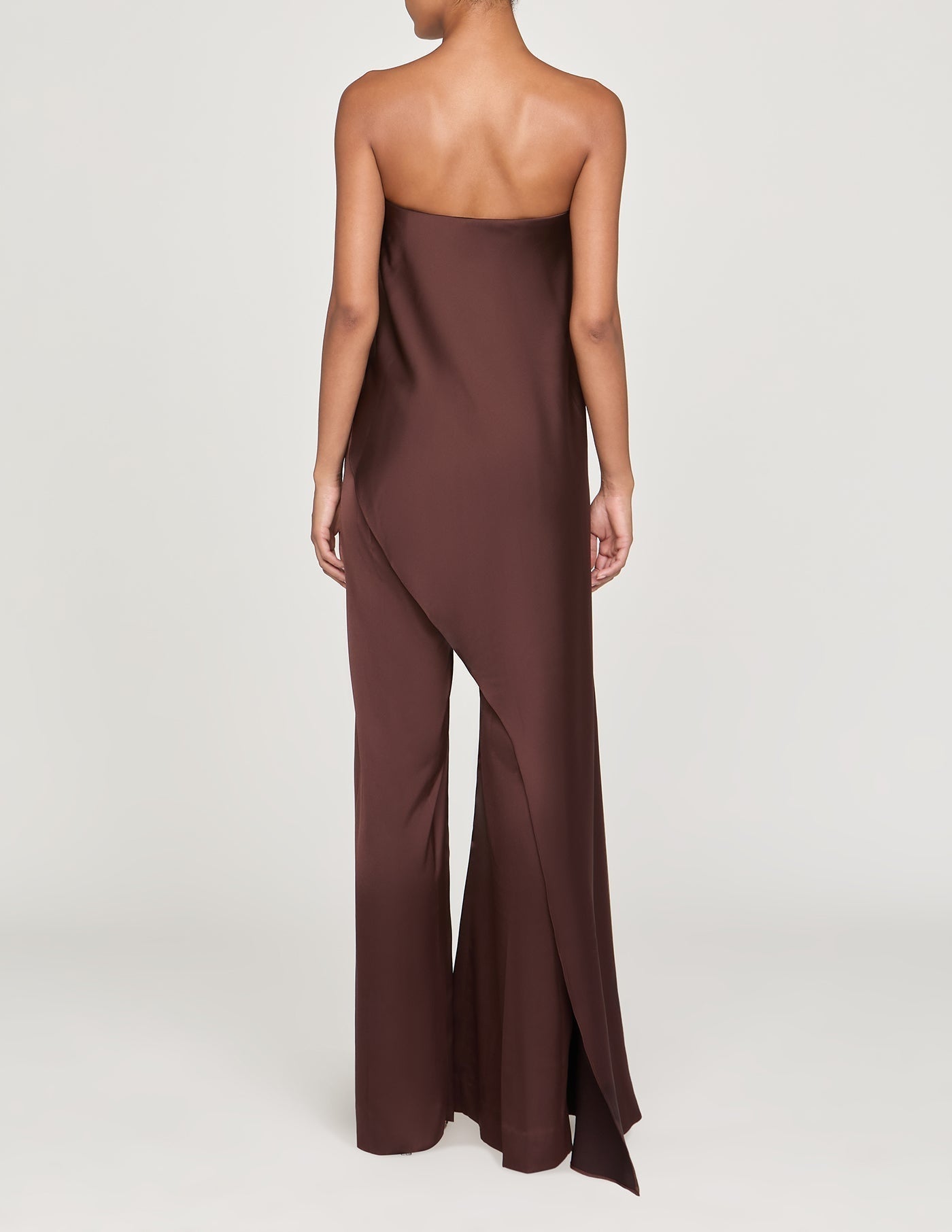 Strapless crepe-back satin jumpsuit with an asymmetric draped overlay. Cut with wide legs for fluid movement and a soft luster that catches the light—minimal, but makes an impact.