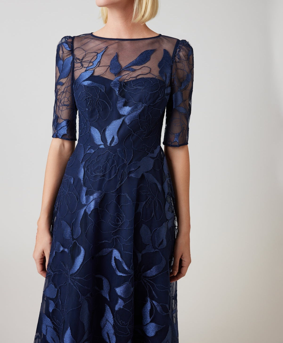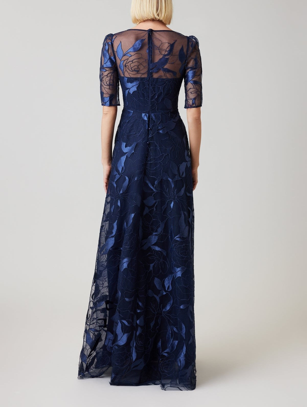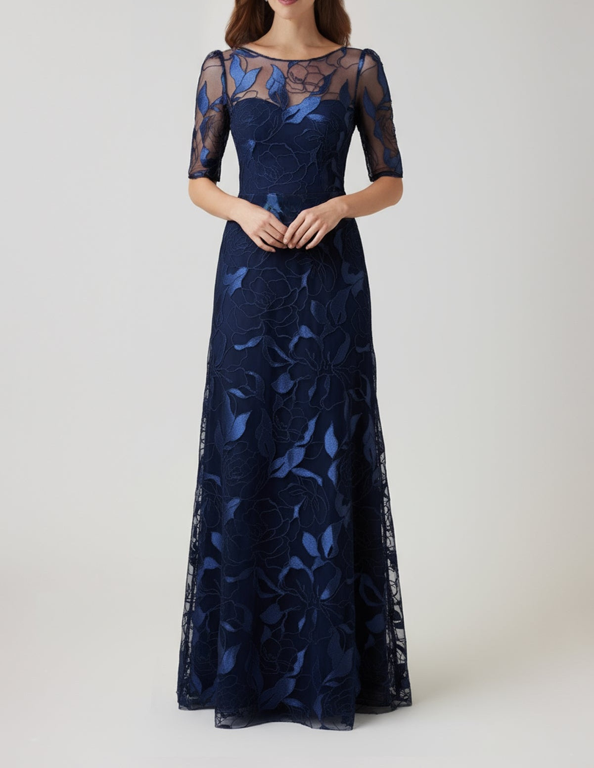 Delicate and refined, this embroidered tulle gown captures effortless elegance in rich navy sapphire tones. The illusion neckline and elbow length sleeves offer a touch of sheer sophistication, while the floral embroidery adds texture and depth throughout. Designed in an A line silhouette that flatters every figure, this floor length gown flows gracefully with each step. Perfect for formal weddings, evening receptions, and black tie events where timeless beauty is always in style.