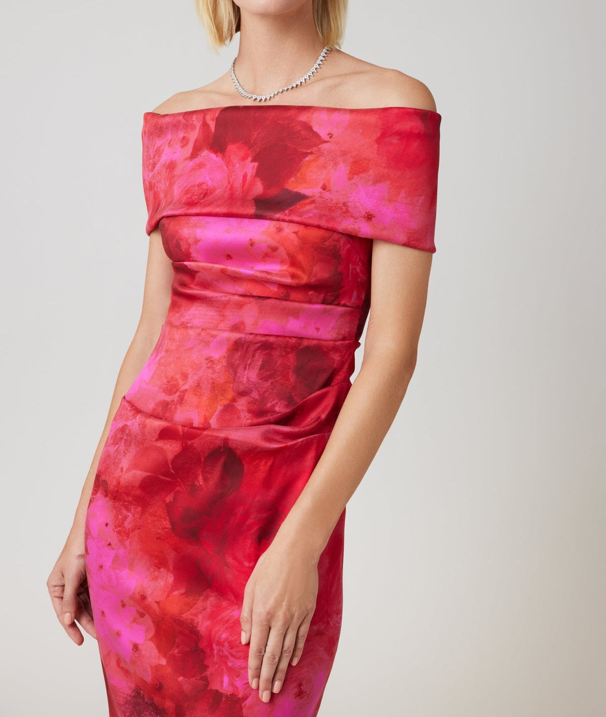 Make an entrance in this stretch mikado gown, designed in a vibrant floral print. The off the shoulder neckline creates a beautiful frame, while the ruched bodice offers a flattering, tailored fit. A sleek column silhouette enhances the figure, and the floor length finish adds refined drama. Perfect for black tie weddings, galas, and evening occasions where polished glamour is key.