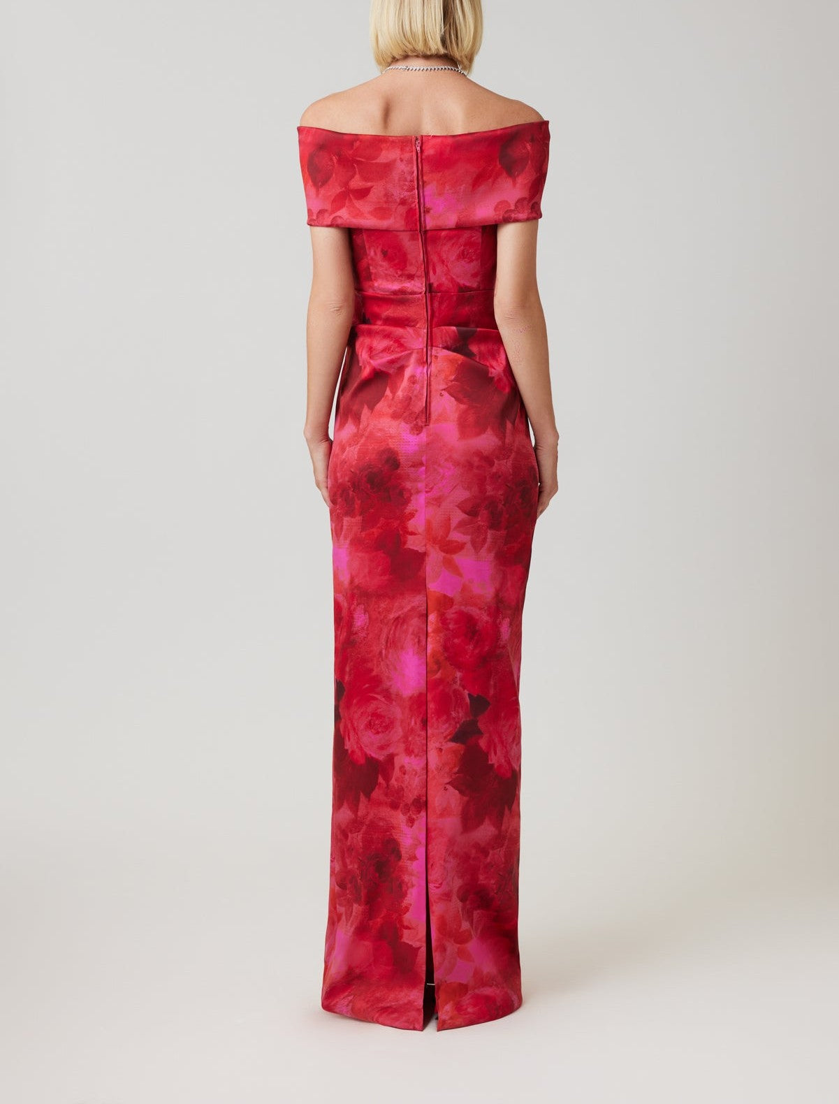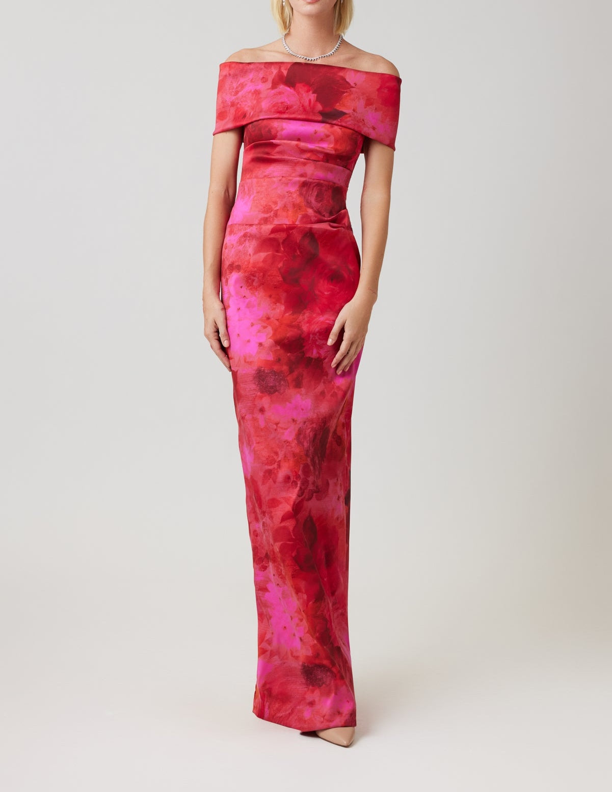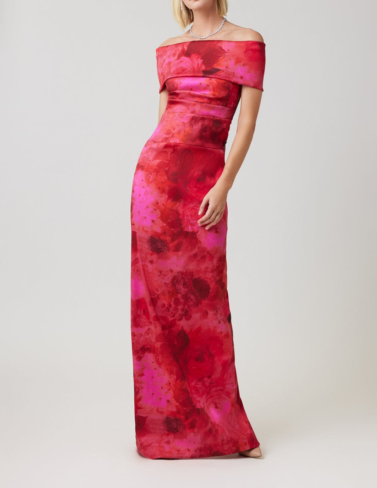 Floral Stretch Mikado Ruched Off The Shoulder Gown