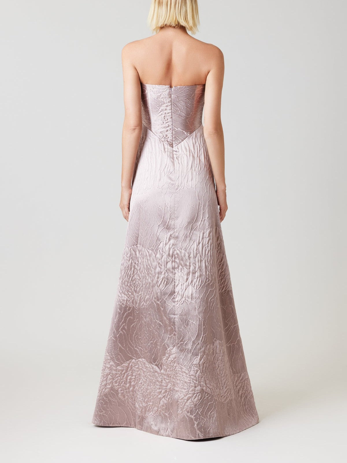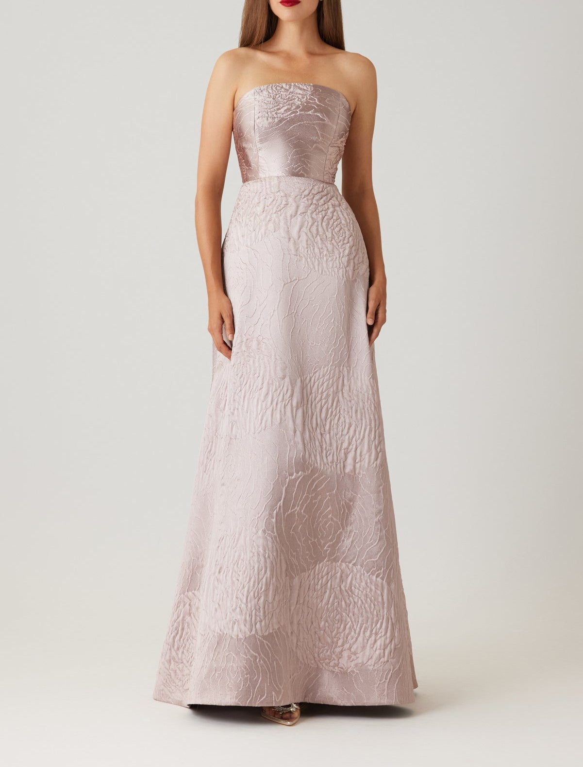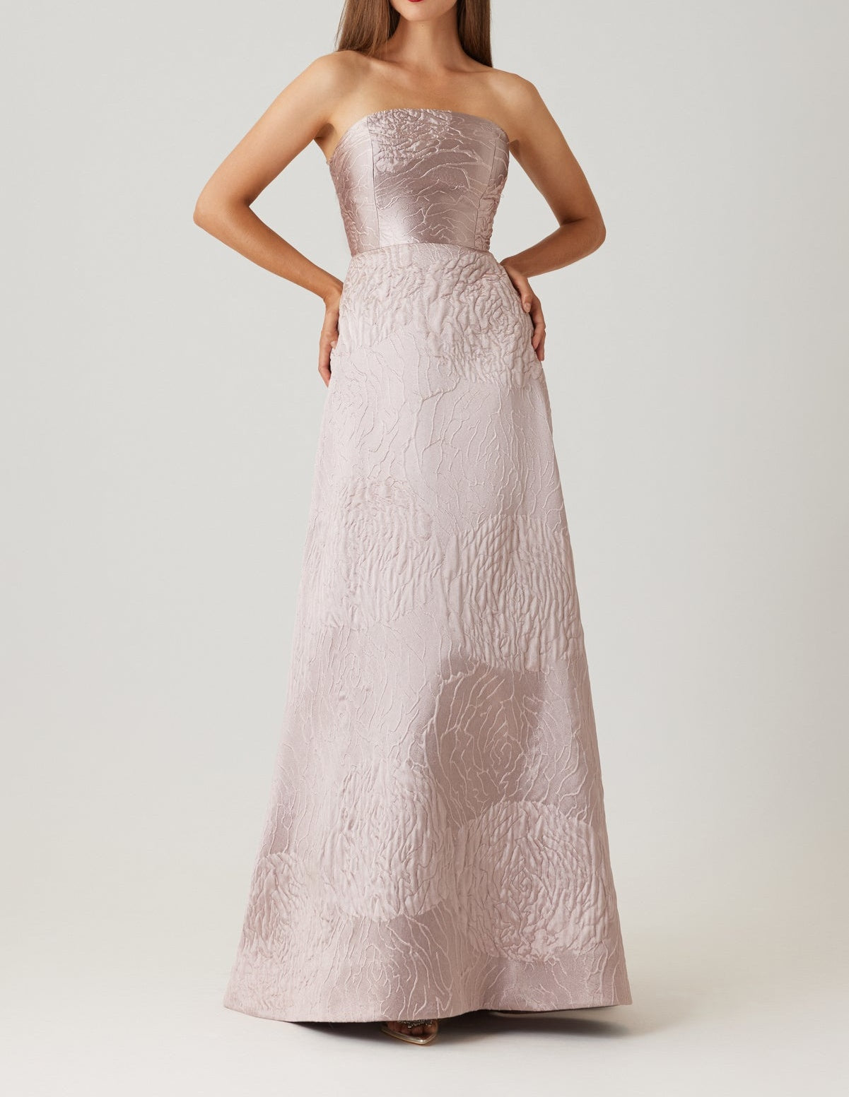 Exude timeless elegance in this sophisticated jacquard gown, featuring a subtle floral motif that adds luxurious texture and depth. The classic strapless neckline showcases the shoulders beautifully, while the defined waist creates a flattering silhouette. Flowing to a floor length hem, the A line shape offers graceful movement and refined style in a soft mauve hue. Perfect for formal weddings and elegant evening celebrations.