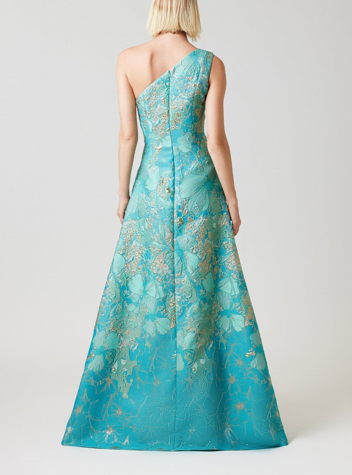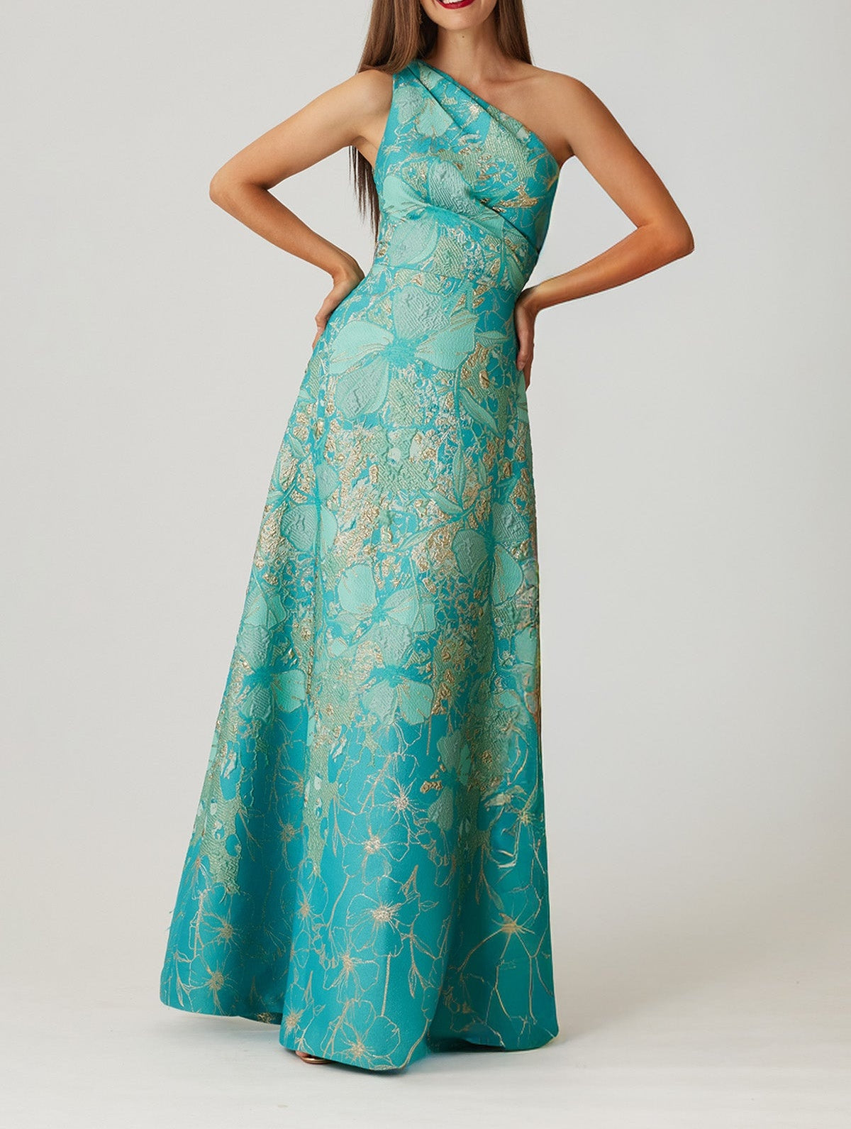 Turn heads in this striking one shoulder gown, crafted in a luxurious metallic floral jacquard that shimmers in turquoise and gold tones. The ruched bodice creates a flattering, sculpted fit, while the full A line skirt flows elegantly to the floor for a timeless silhouette. Sophisticated yet statement making, this gown embodies modern glamour and is perfect for formal weddings, galas, and special evening occasions.
