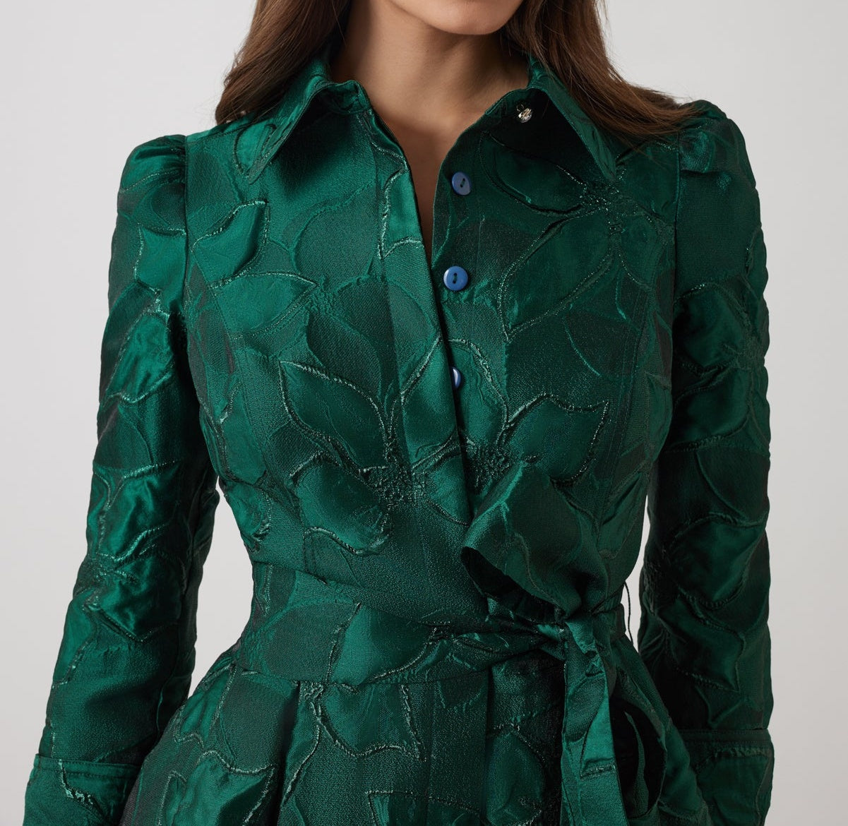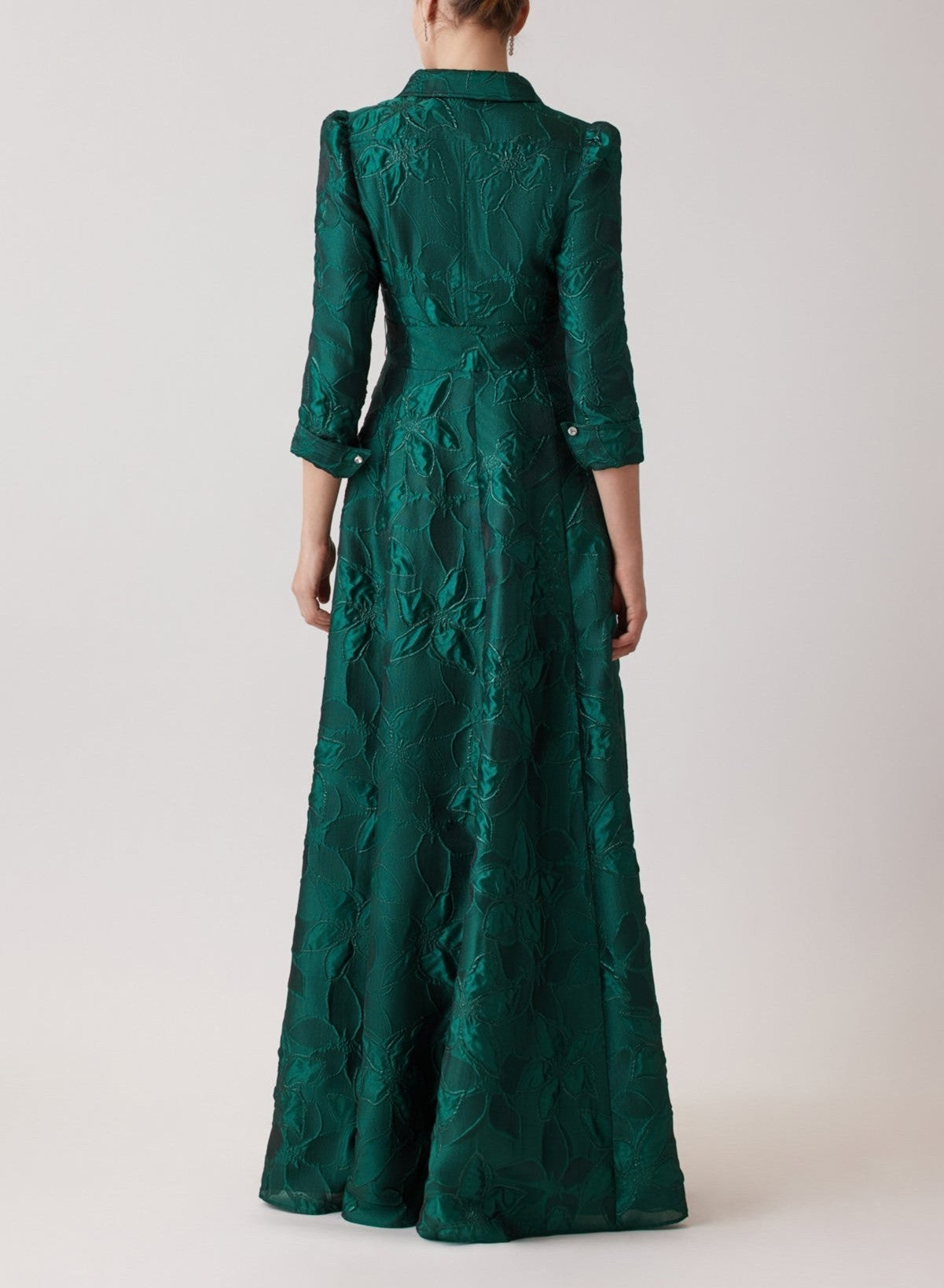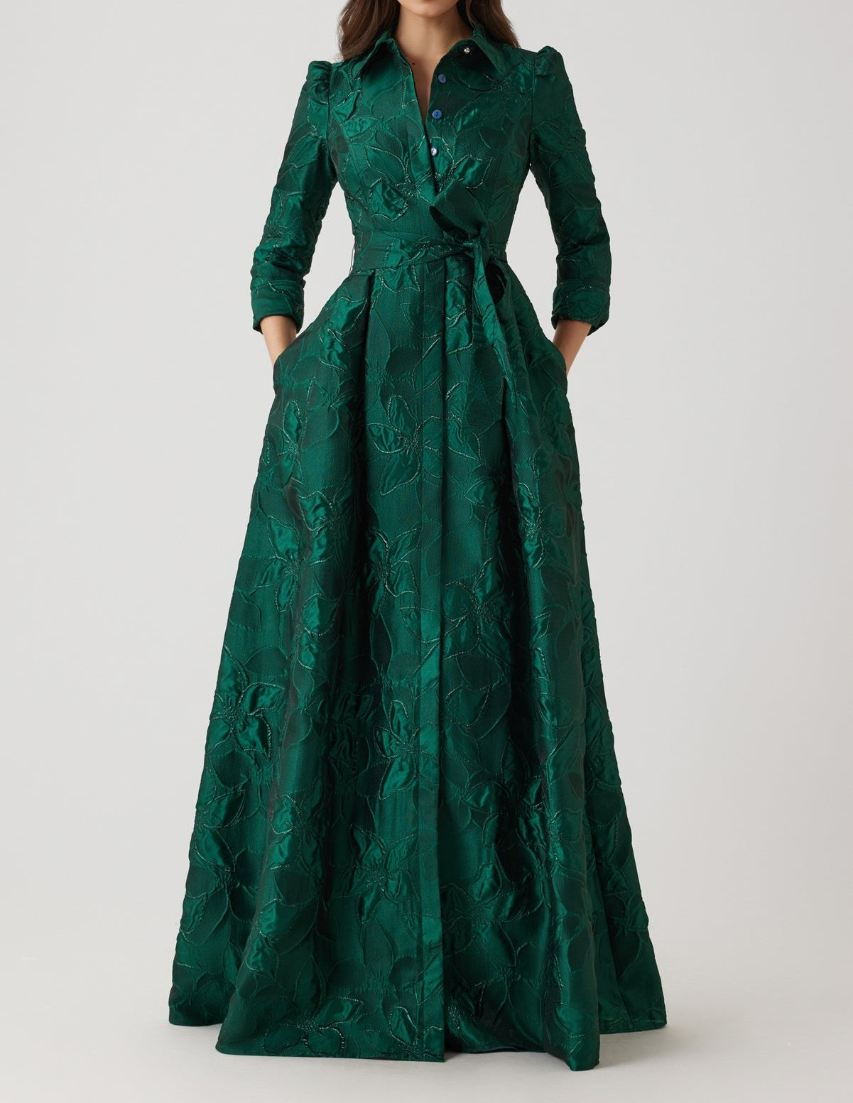 Command attention in this metallic jacquard shirt dress, designed with an intricate floral pattern that catches the light beautifully. The collared neckline and long sleeves offer a sophisticated, tailored touch, while the removable sash cinches the waist for a flattering A line silhouette. Finished with a full, floor length skirt, this gown blends structure and elegance effortlessly. Perfect for galas, holiday celebrations, and formal evening affairs.