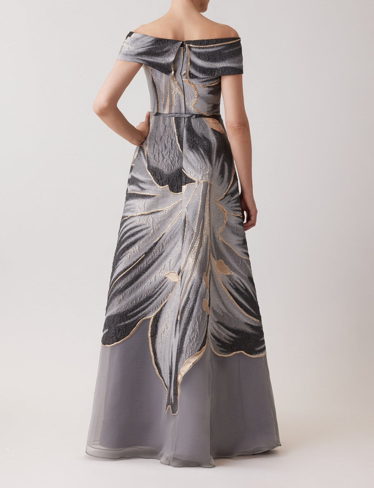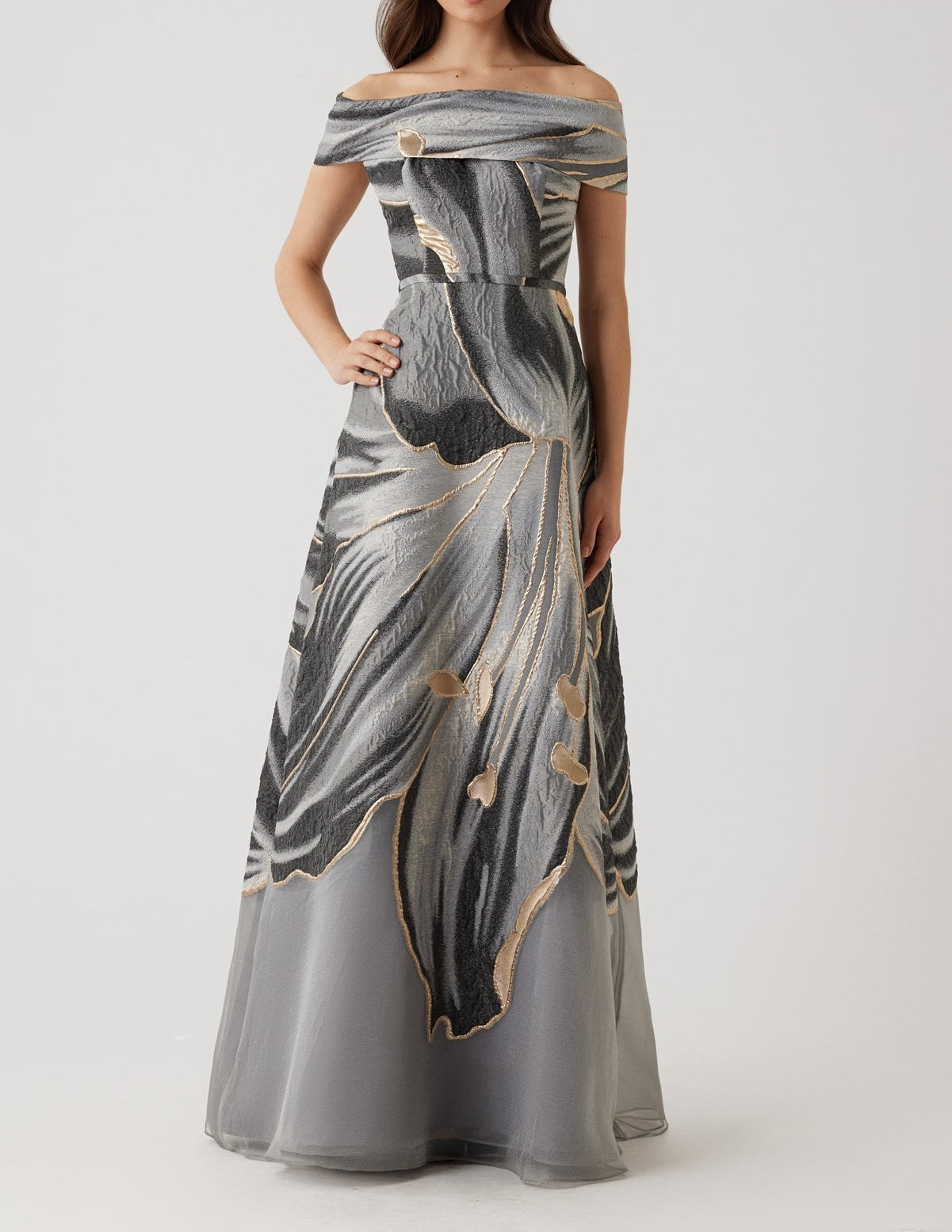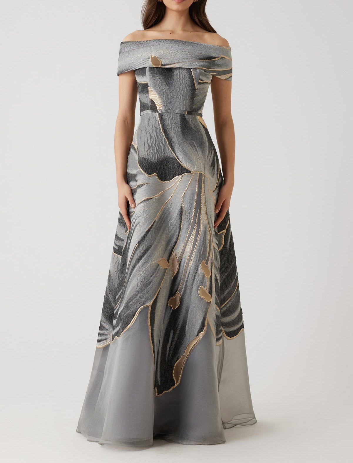 Metallic Jacquard Off The Shoulder A Line Floral Gown