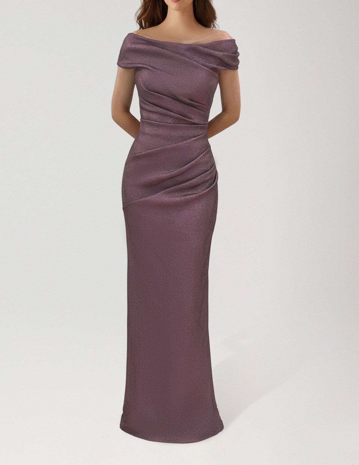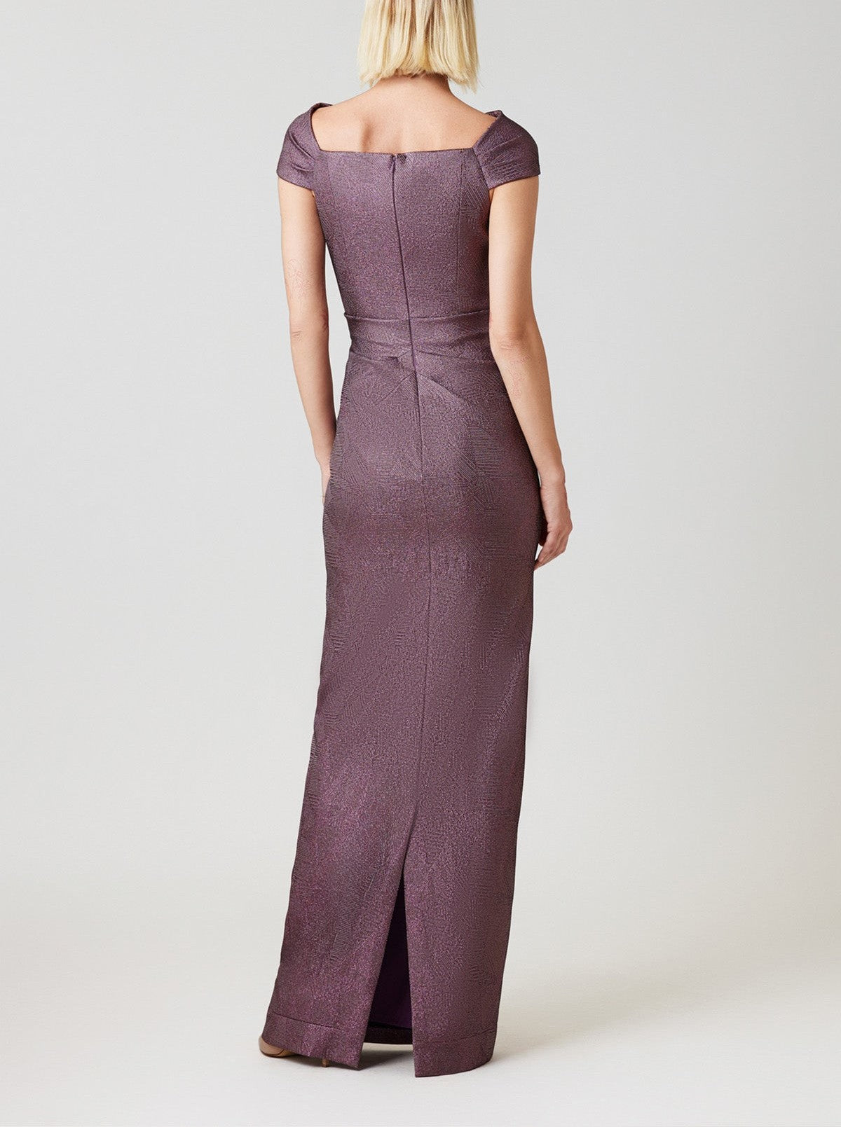 Radiate sophistication in this off the shoulder gown, crafted from luxurious stretch jacquard for a sleek and comfortable fit. The artful ruching accentuates the figure, creating a beautifully sculpted silhouette. Falling gracefully to the floor in a refined column shape, this gown embodies timeless glamour with a modern edge. Perfect for black tie weddings, formal galas, and elegant evening affairs.