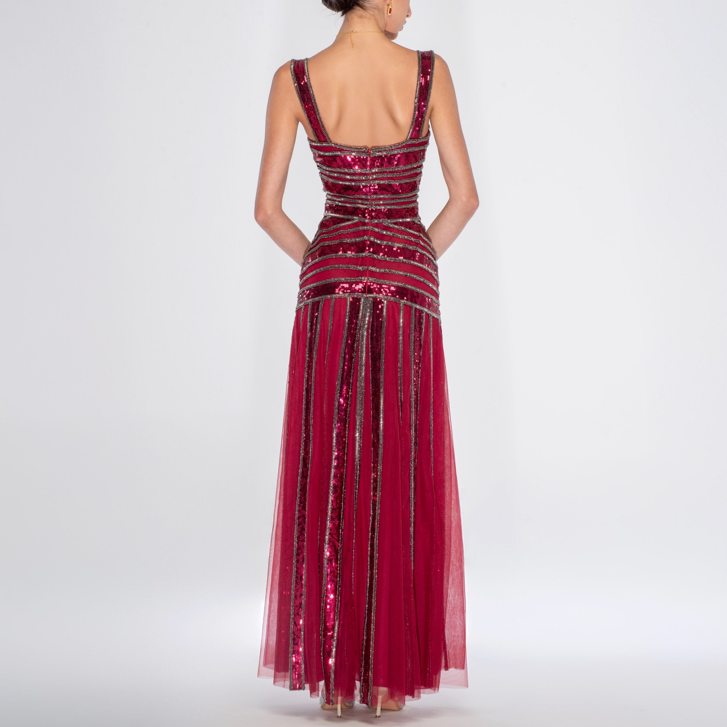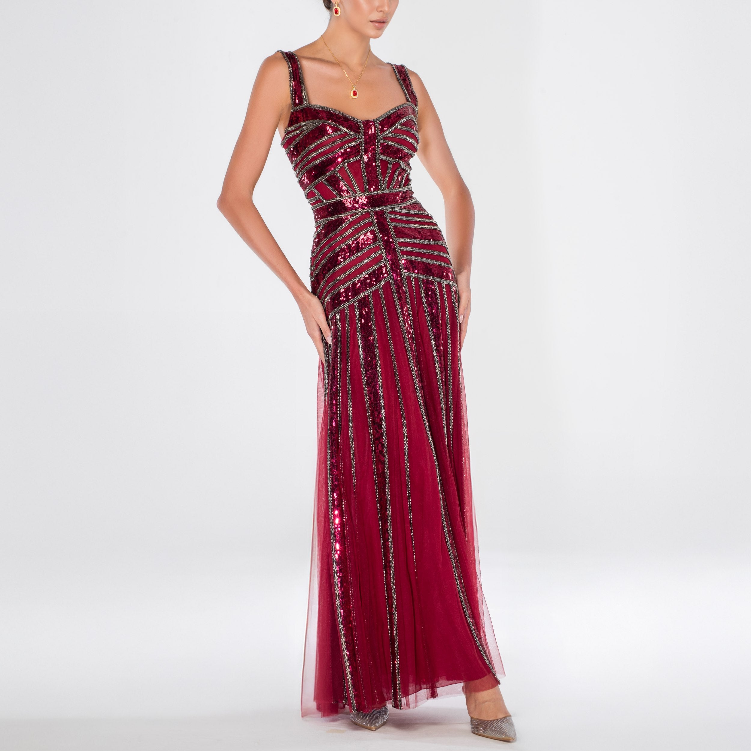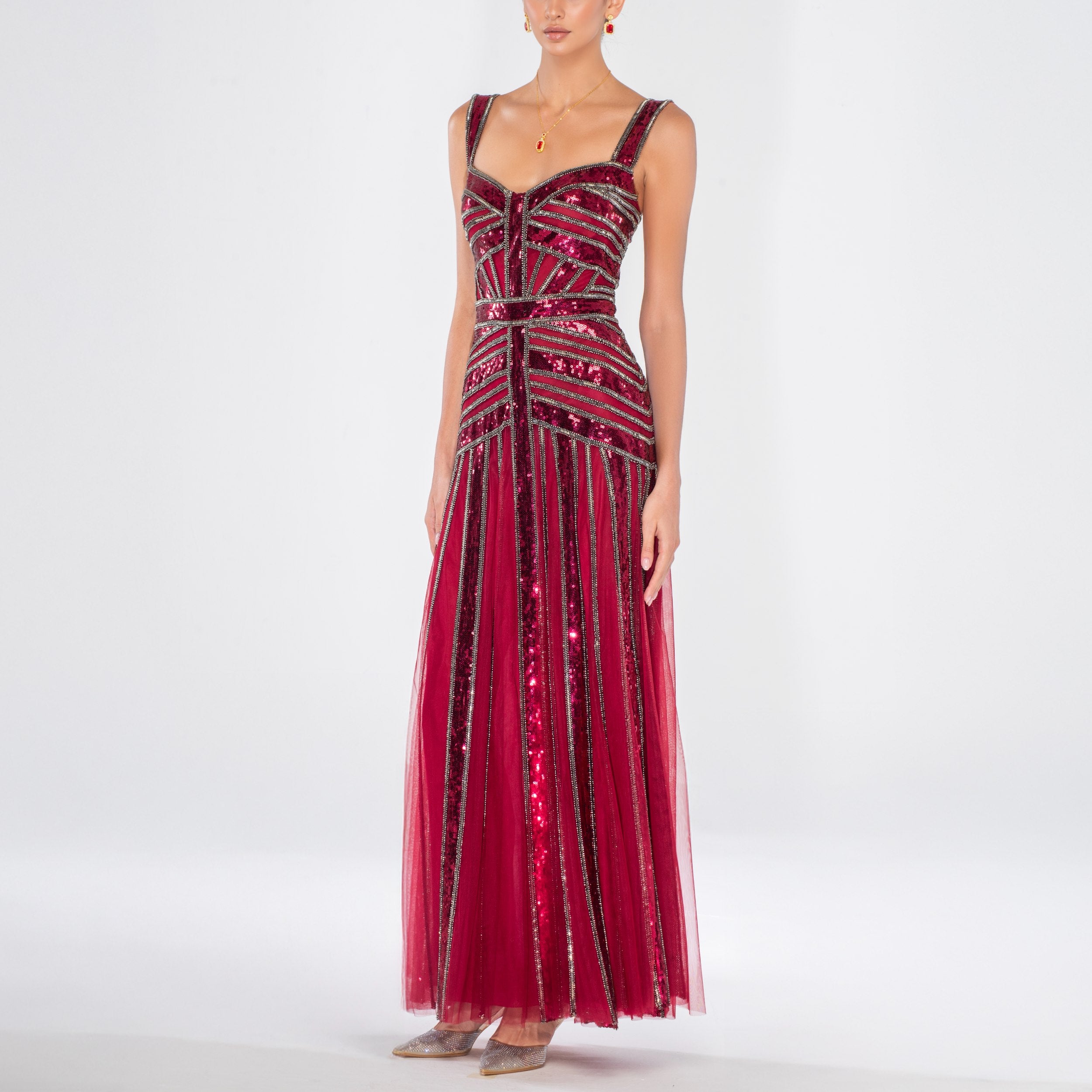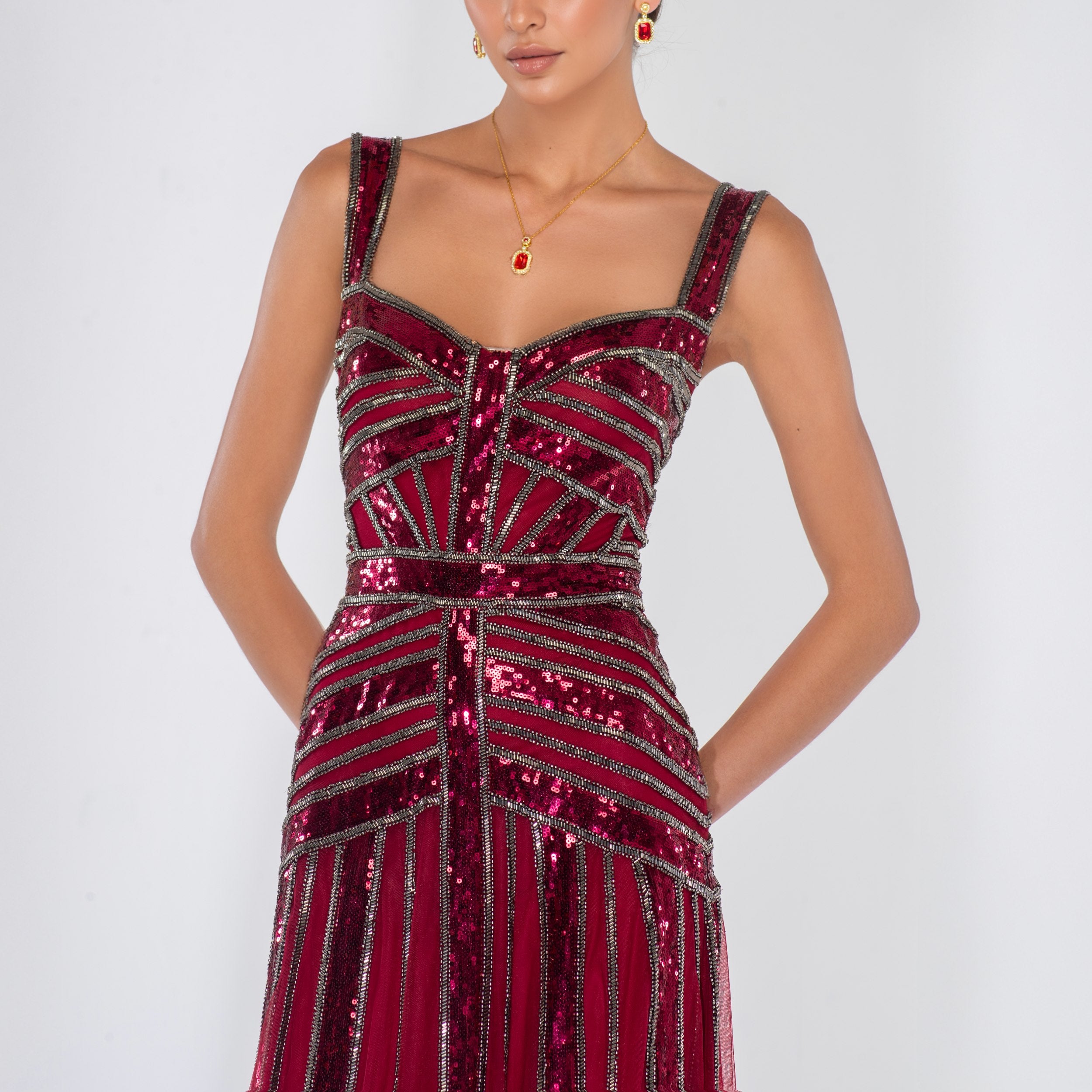 A chic midi A-line dress with shimmering silver matte paillette bands, offering a striking textured look and elegant flow for any occasion.