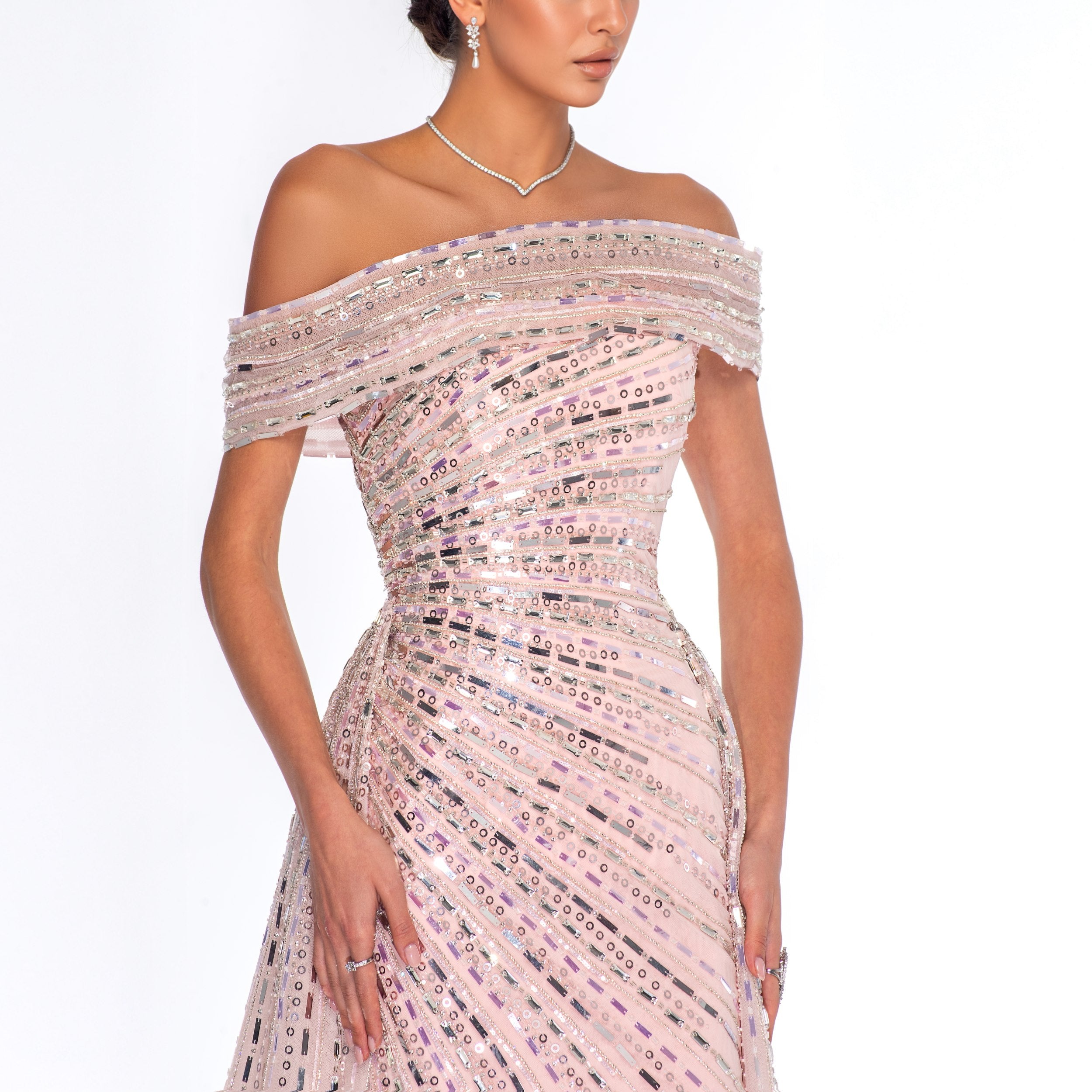Old Rose Fitted Gown With Asymmetrical Off Shoulder