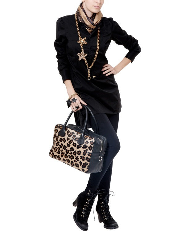 Styling Tip: Embellish with black laceup boots, black leggings, an Atos Lombardini Faux Fur Leopard Print Tote and matching star necklace in animal print, for street chic with a twist.