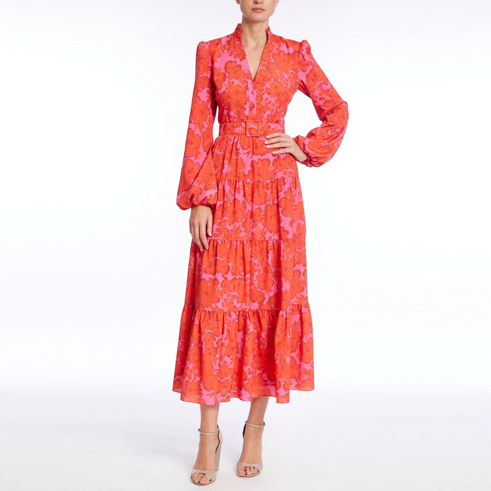 Watermelon Multi Floral Print Tiered Midi Dress with Belt