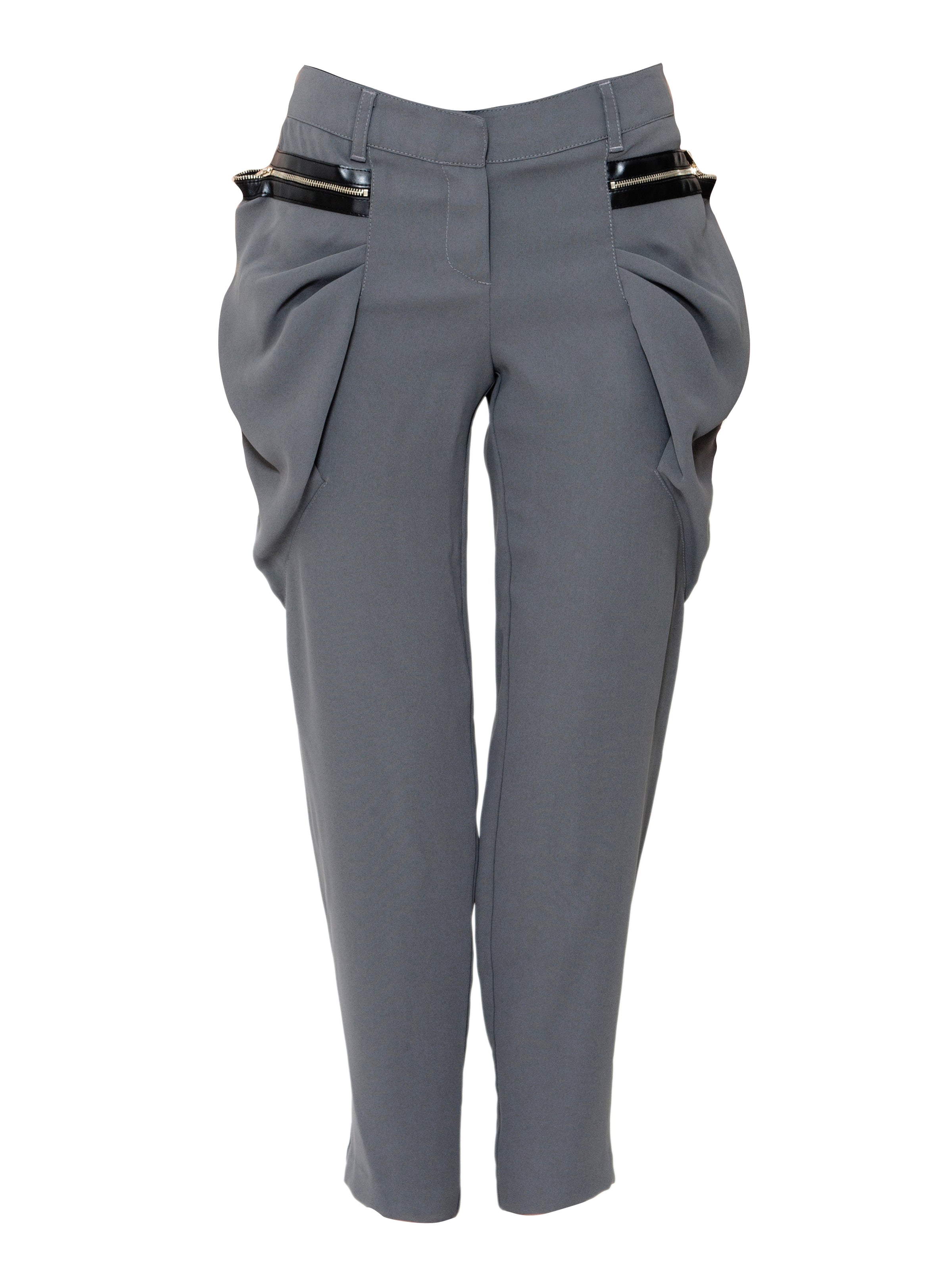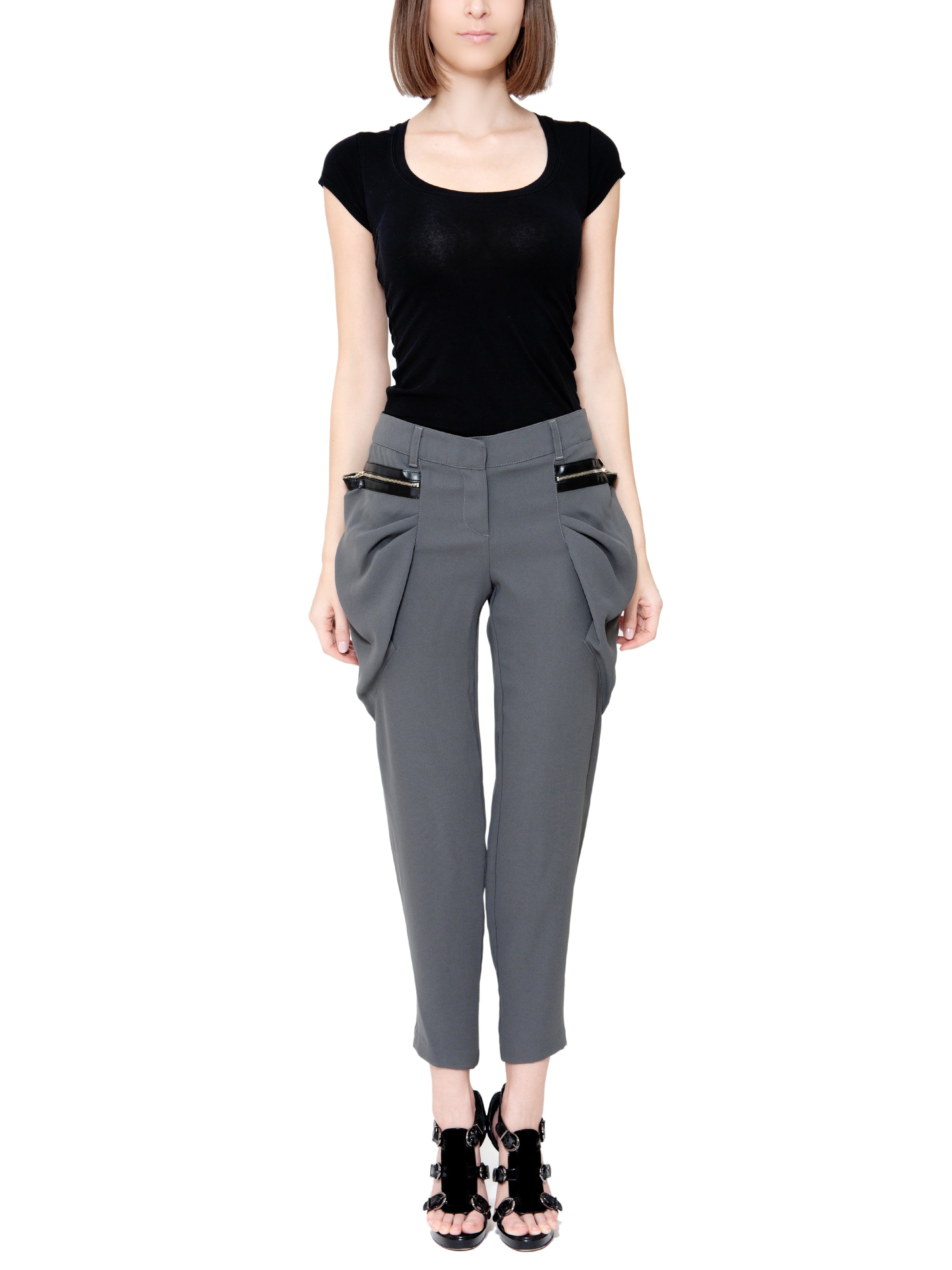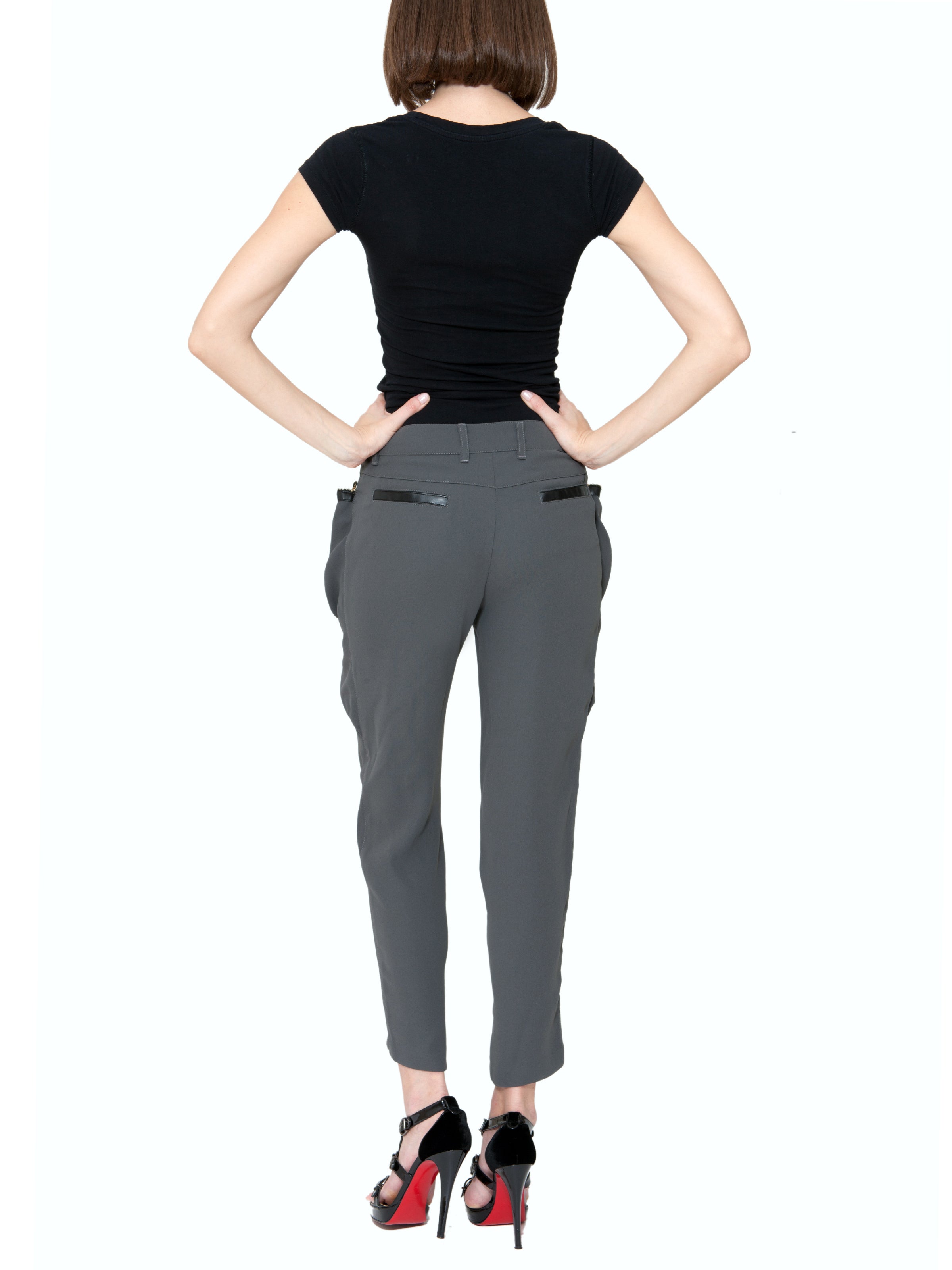 Grey cropped trousers with leather-trimmed zipped puff pockets.