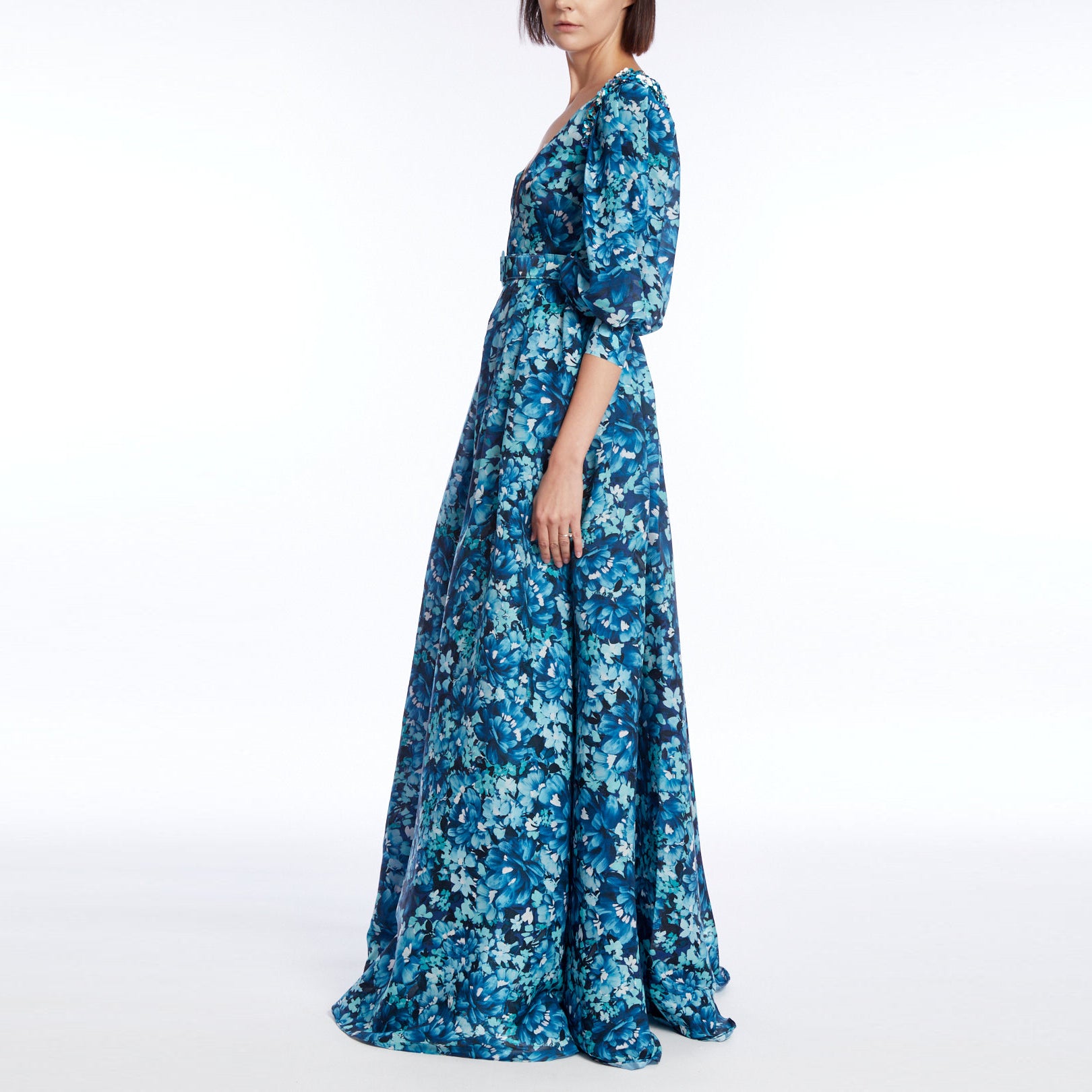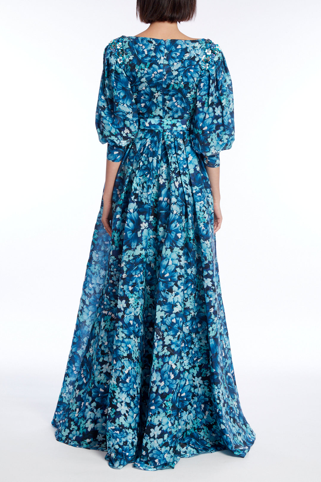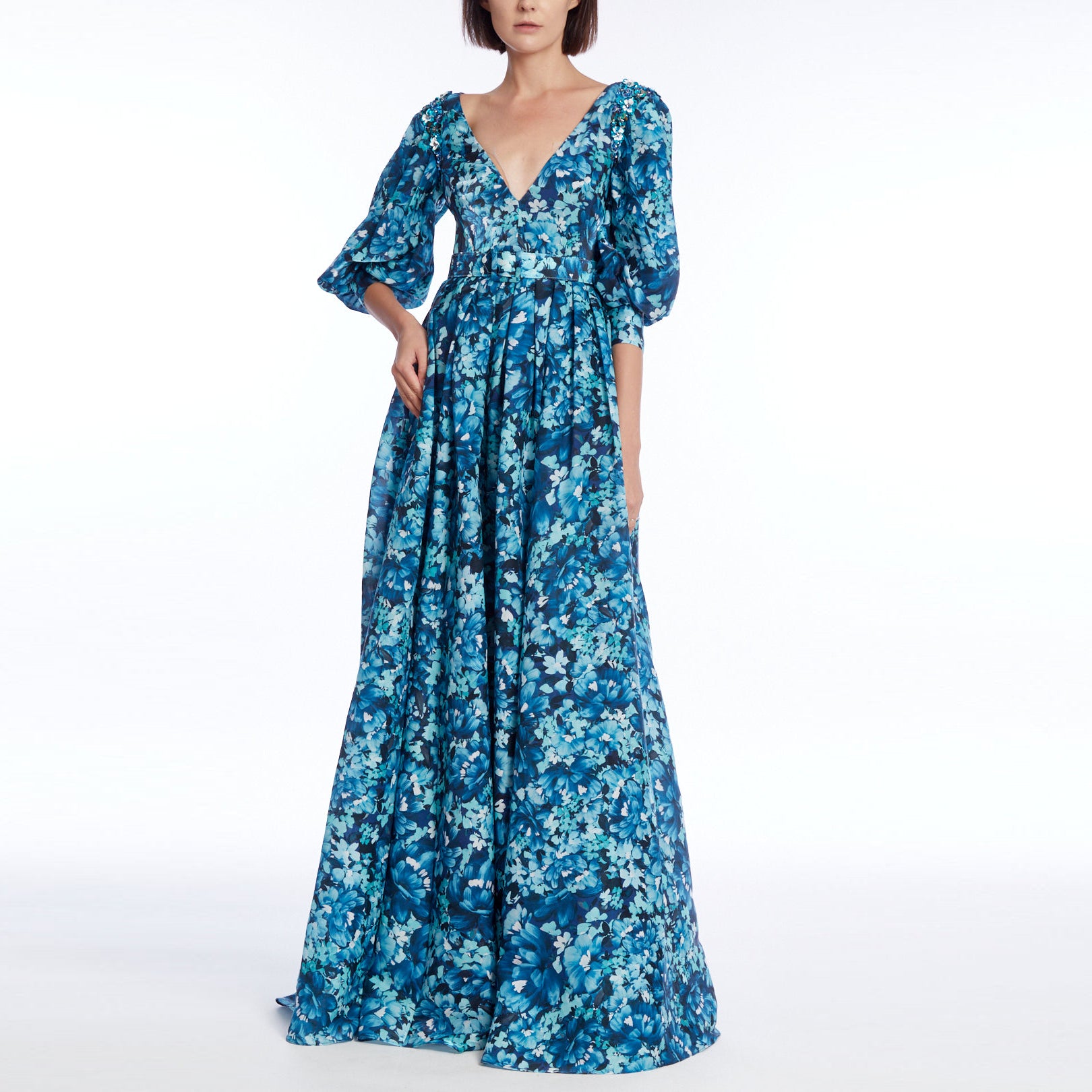 Teal Multi Printed V Neckline Puff Sleeve Gown