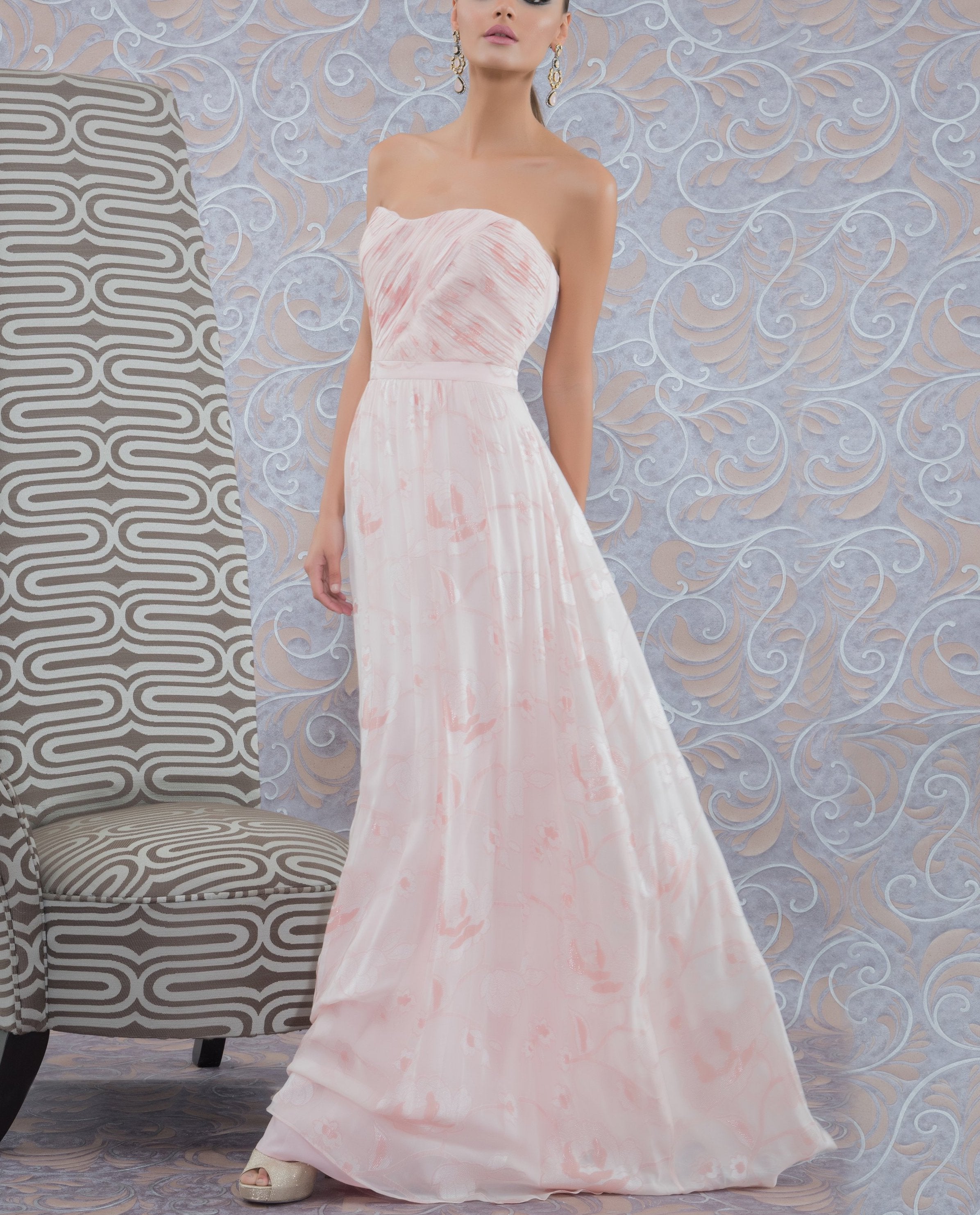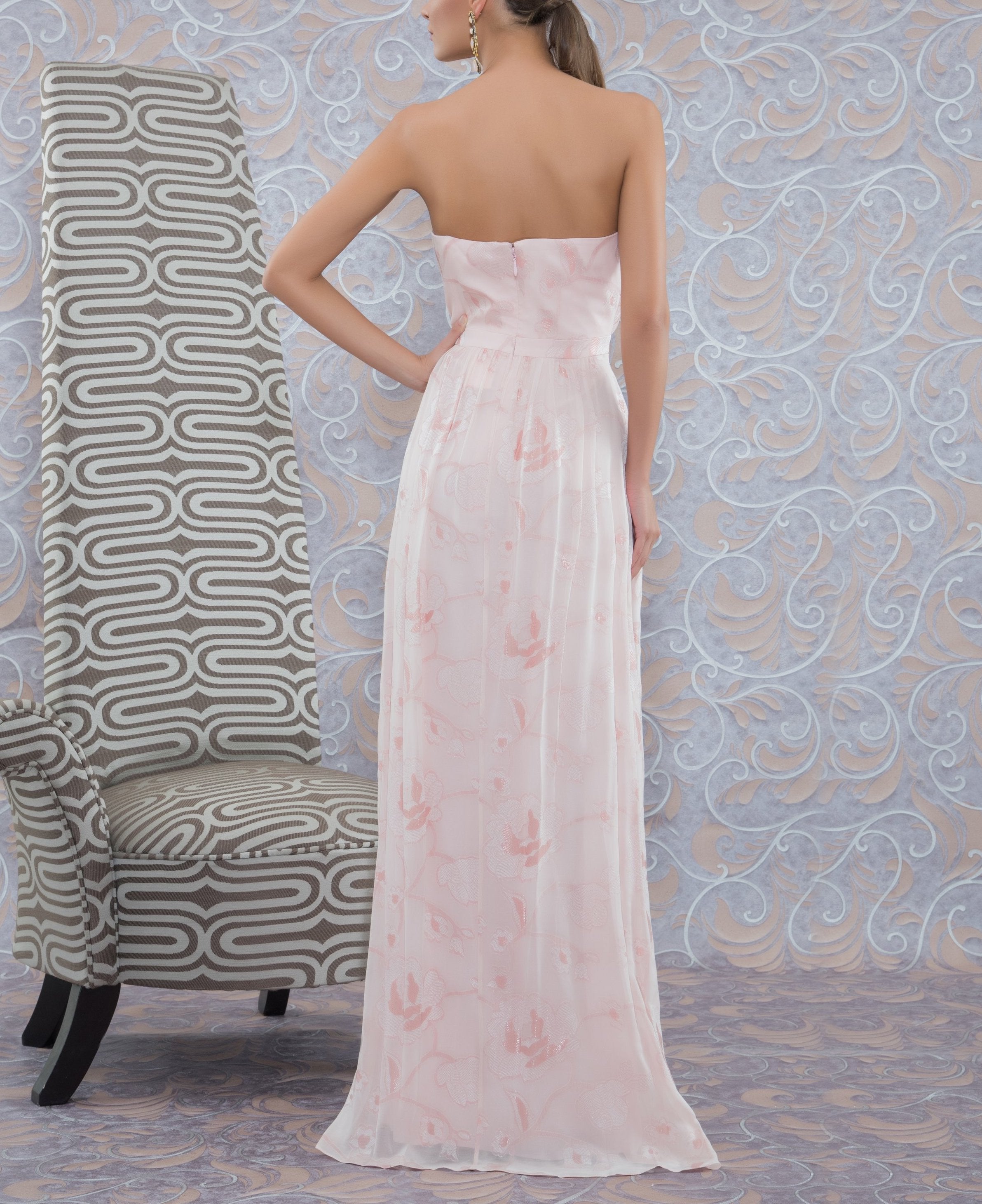 Strapless ruched bodice gown with Grecian drape in rose motif lurex chiffon. Defined waistband detail. Invisible zip at center back. -Fabric : Chiffon -100% Polyester -Fully lined -Imported -Dry Clean Only Model is 5'10" wearing size 0. Product Code: 11800003