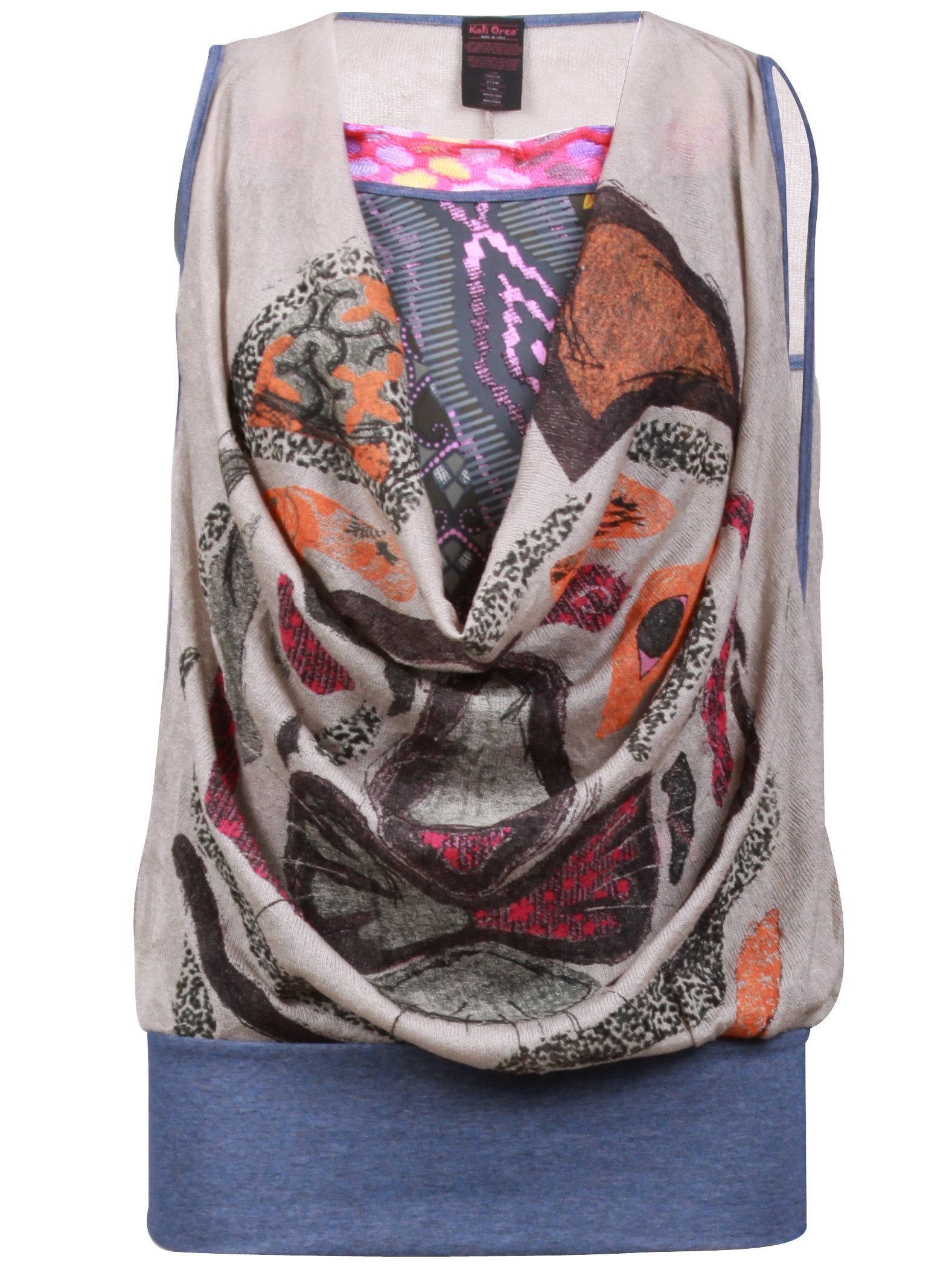 - This Multi Colored and fabric top is an exquisite day wear from the Italian designer Kali Orea. Fold-over collar, a cowl neck styled in drapes that ends at the hip with stretch band