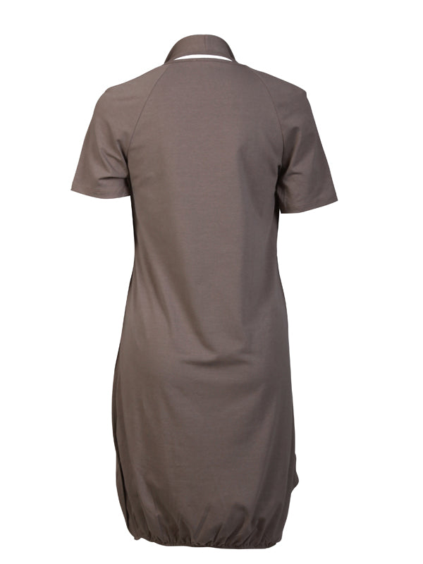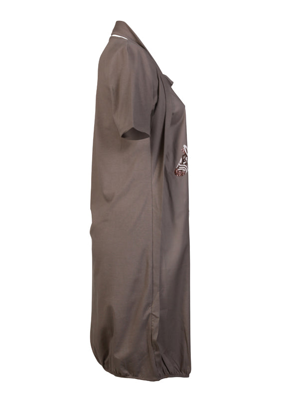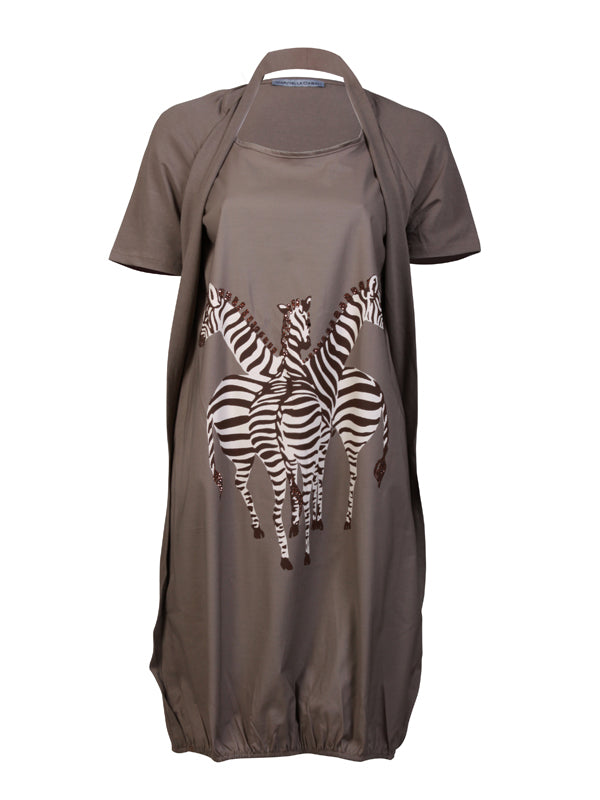 Style up with a twist with this dark beige jersey dress with a round neck, short sleeves and a specially designed collar flowing all the way from the nape of the neck to the front side seam closing-in on the elasticized hem line. Giraffe print details in the front.