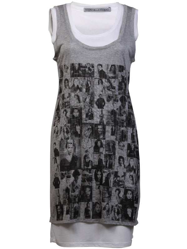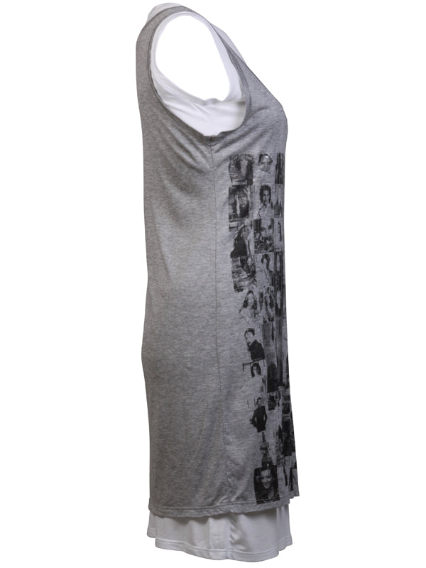 Chic and happening look with this grey and white sleeveless double Top tee with pictures of celebrities pictured in the front with black sequence detail.