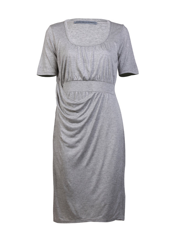 Grey knee length dress with a round neck and a fitted high waist belt. A dash of additional fabric for that extra special look fitted from the right shoulder flowing towards the waist downwards forming a coulee in the centre. 100% viscose.