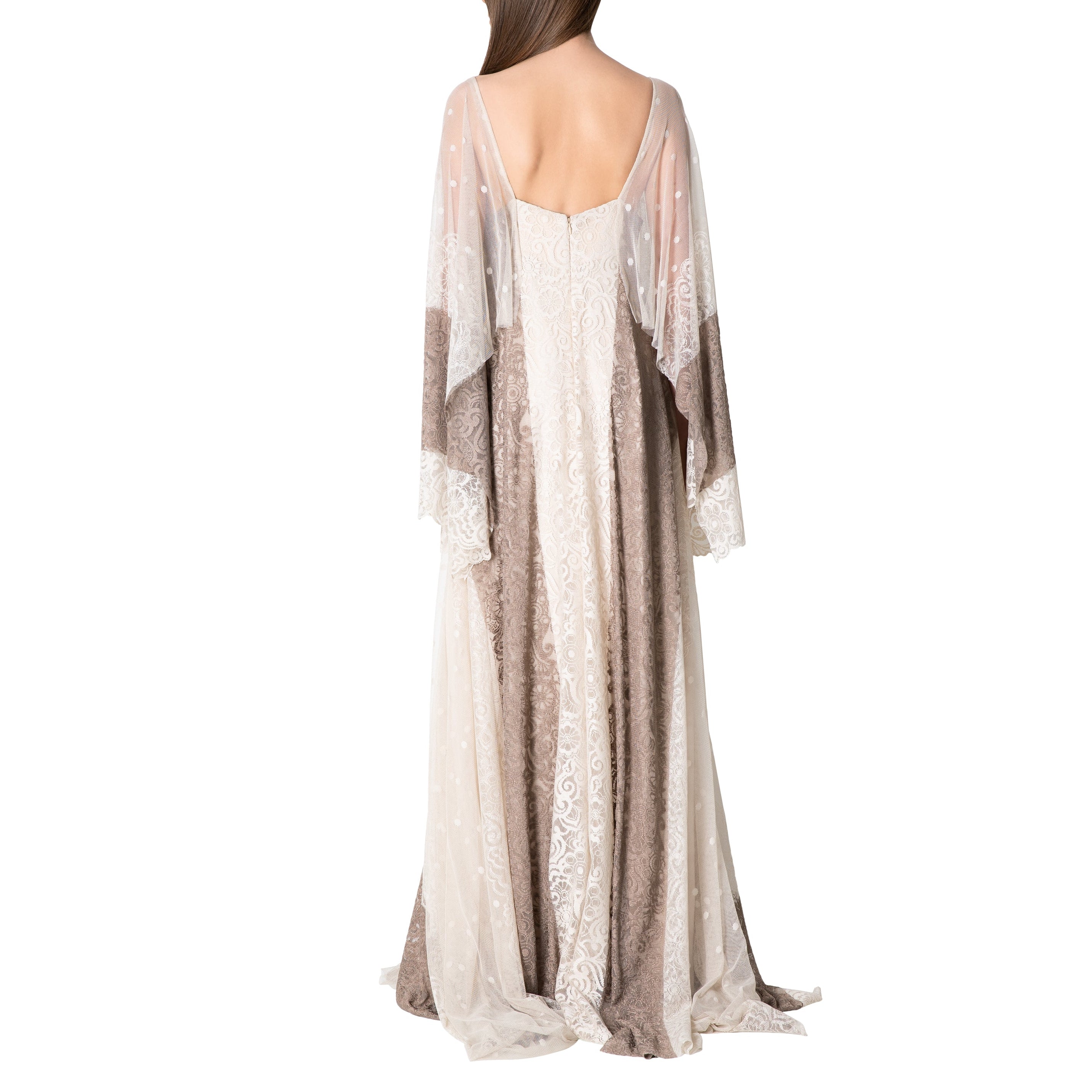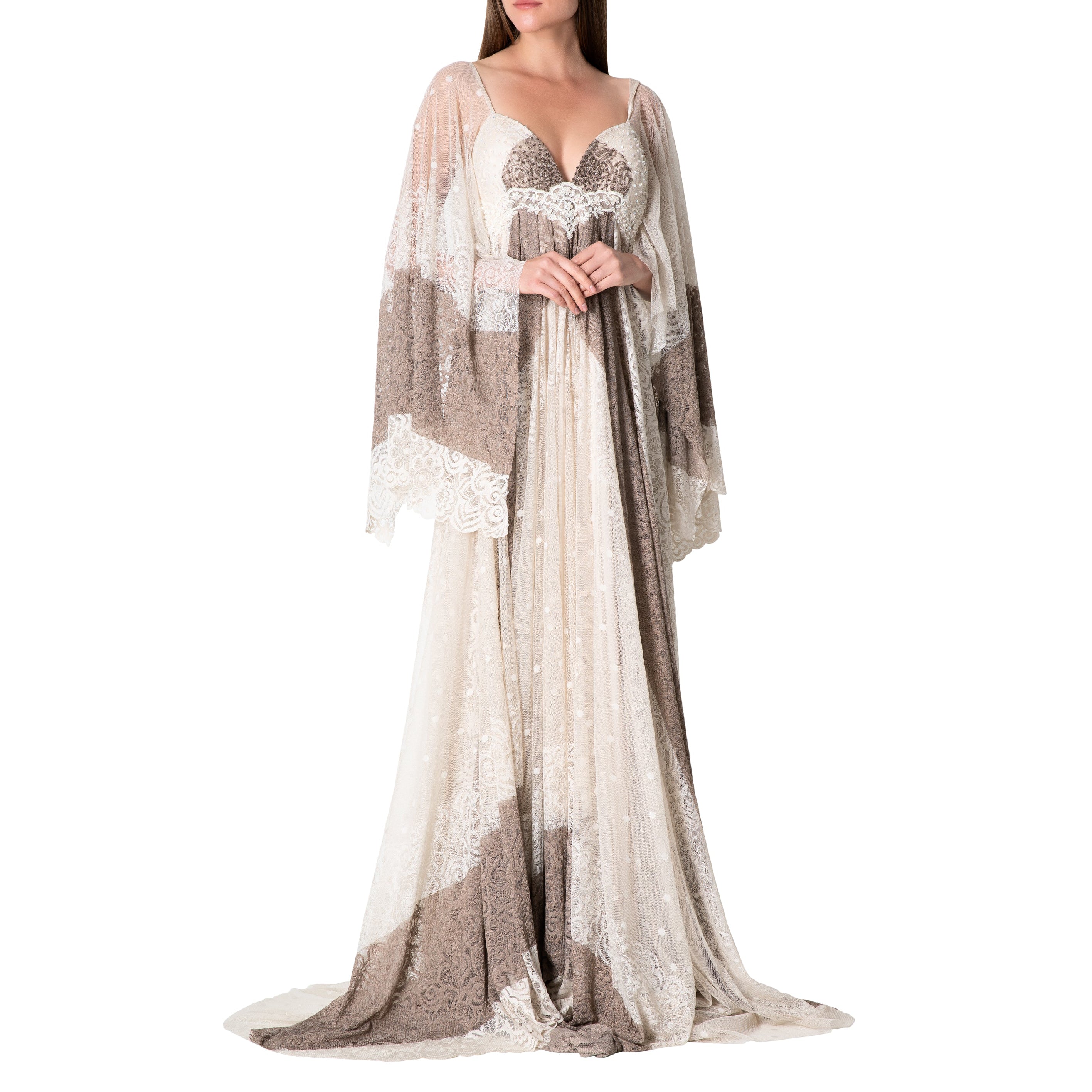 An Empress¢š¢s delight! This stunning romantic multi Dantel embellished gown from the avant-garde couture collection of Ozlem Suer is a great tribute to the Neo-classic style of Empress Josephine of France. The generous flow through the fabric at front in the form of pleats adds height and elegant to the gown. The A-line silhouette comes with a sweetheart neckline at front and back with a hidden zipper at the back. The sleeves are flowy and sheer showcasing the elegance, soft design of the Dantel on your skin color. This unique design can be worn in a red carpet, gala night or an occasion to remember. Special hand made design garment 50% viscon 50%polyester