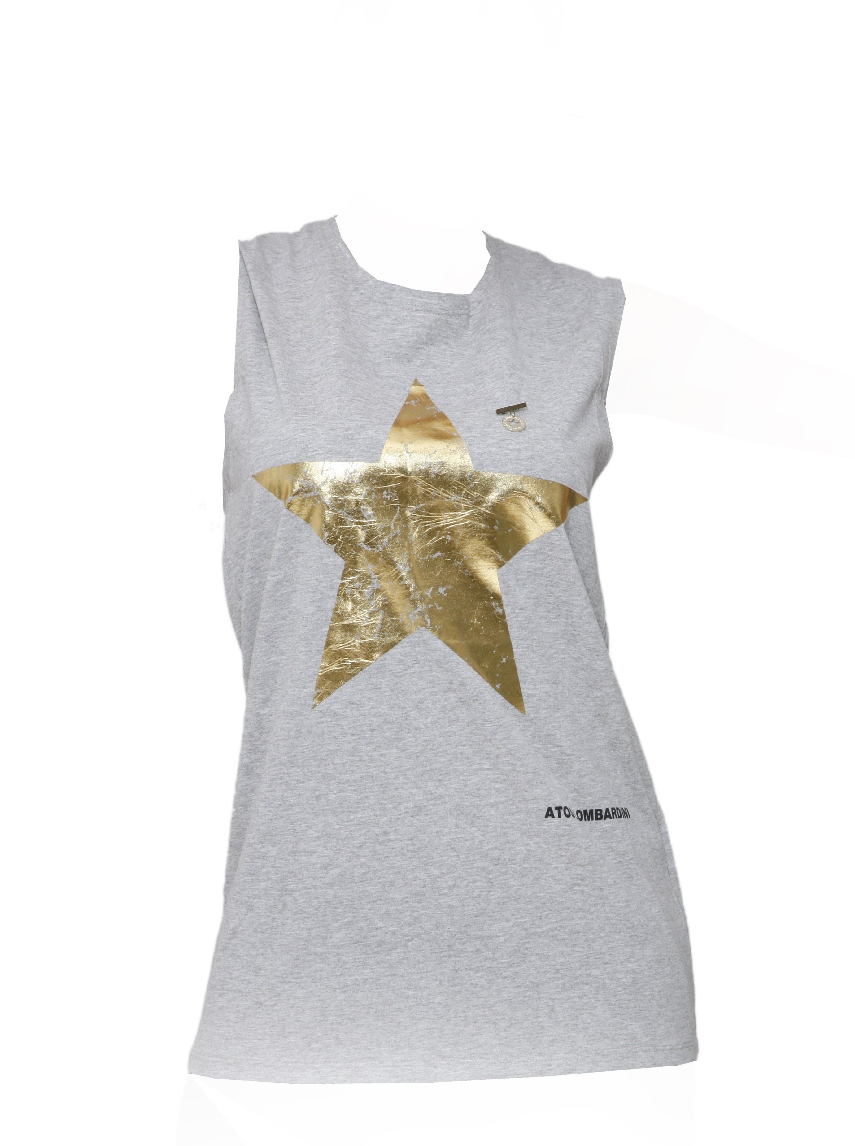 This Atos Lombardini sleeveless top has a round neck, fitted at the top and looser at the bottom, it includes a golden star print at the center of the top . 100% cotton, hand wash only