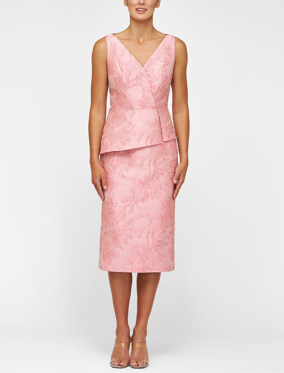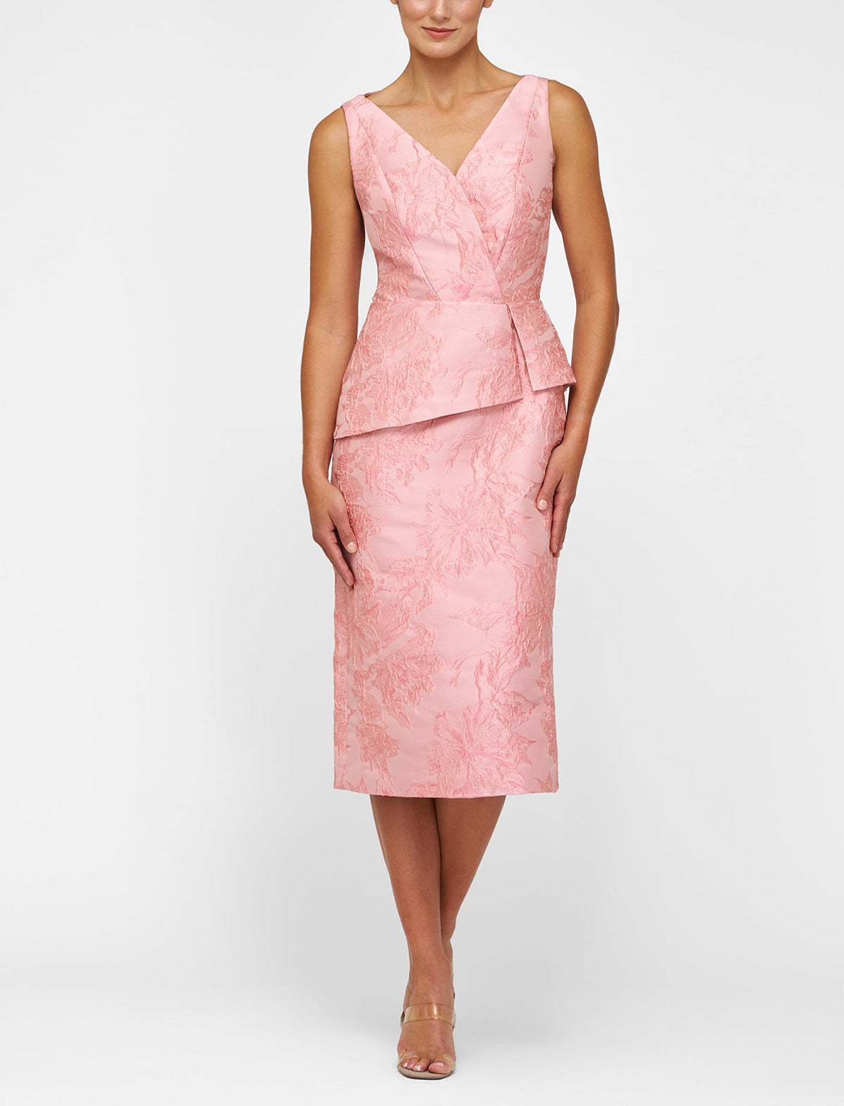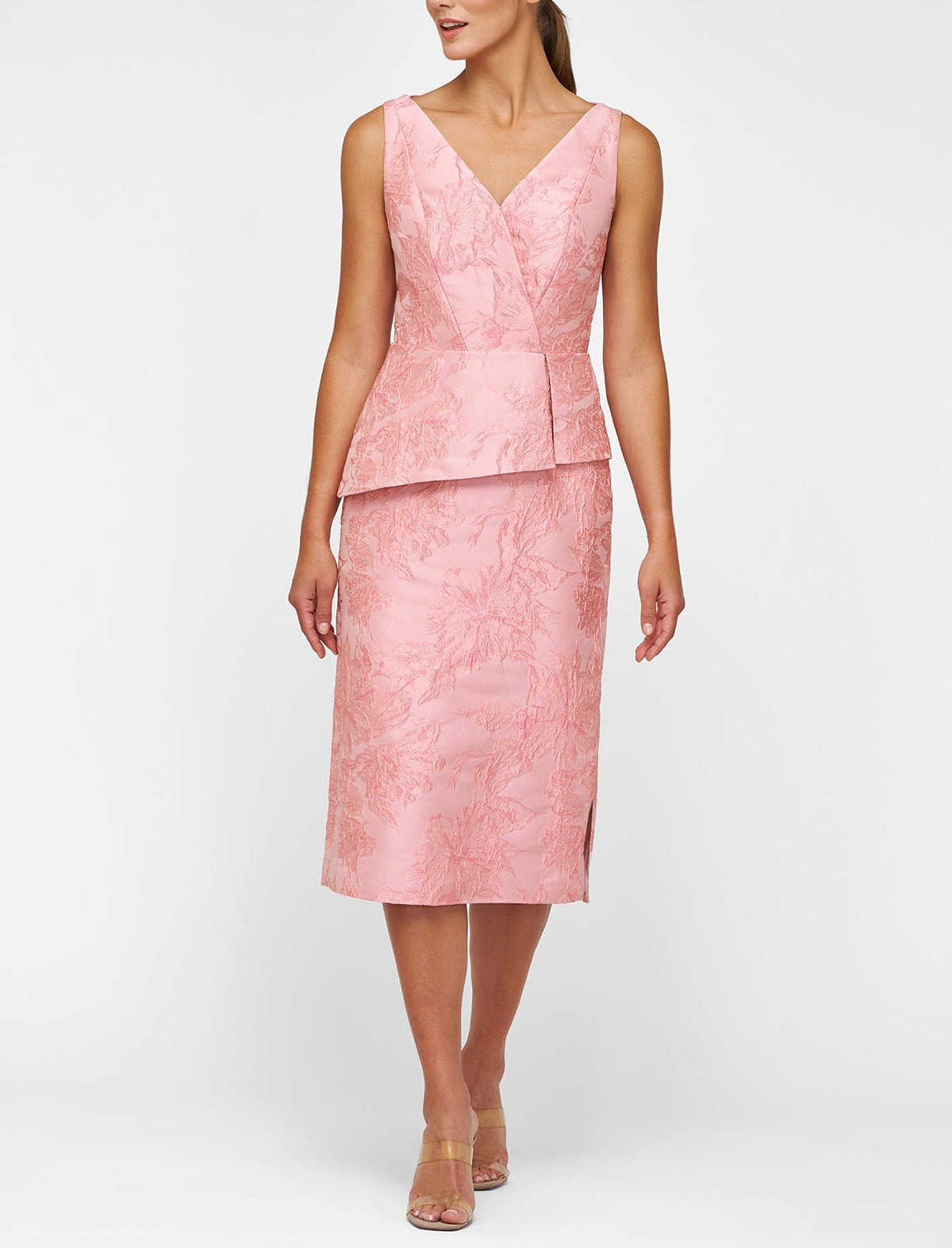 Polished blush pink midi with a touch of shimmer, tailored in lightweight metallic floral jacquard. The surplice bodice and asymmetric peplum contour the waist, while a side slit adds ease and allure. Ideal for bridal showers, rehearsal dinners, or an elevated daytime event.
