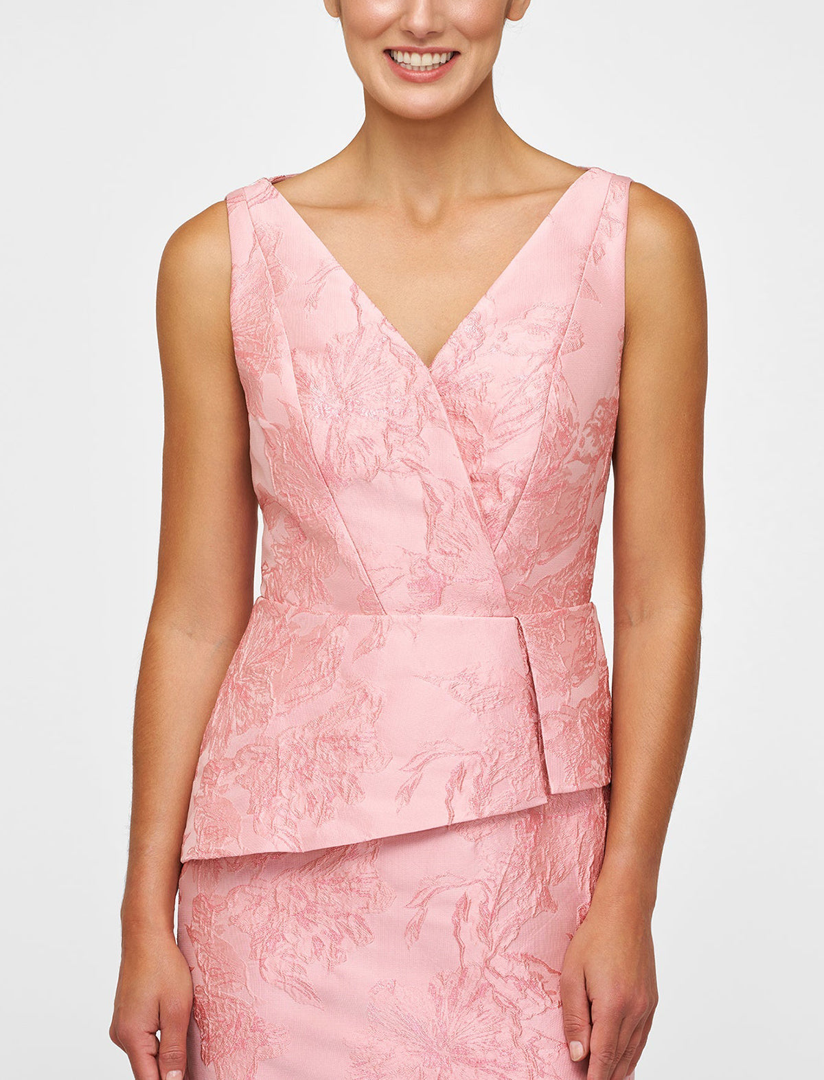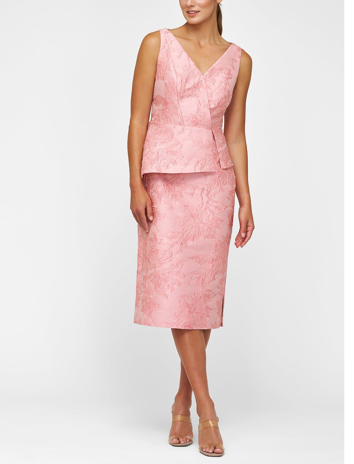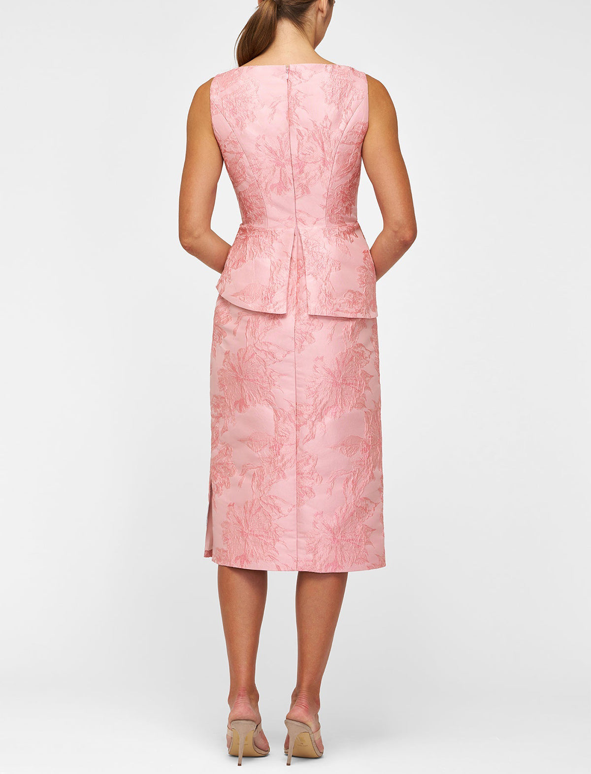 Polished blush pink midi with a touch of shimmer, tailored in lightweight metallic floral jacquard. The surplice bodice and asymmetric peplum contour the waist, while a side slit adds ease and allure. Ideal for bridal showers, rehearsal dinners, or an elevated daytime event.