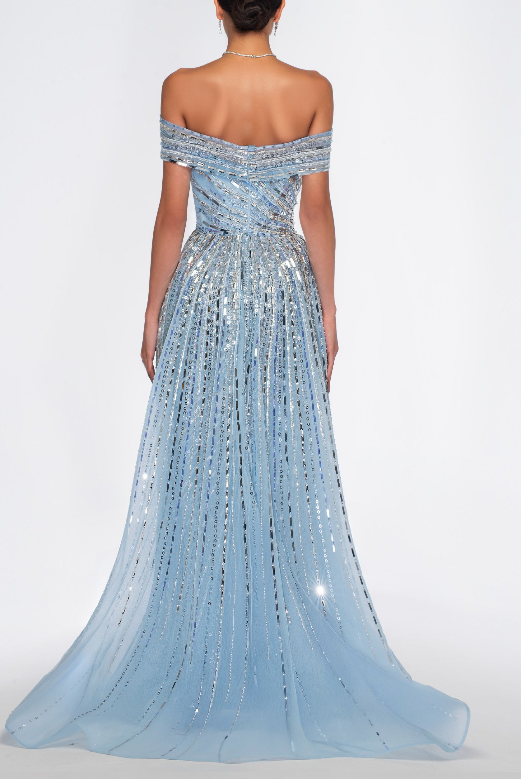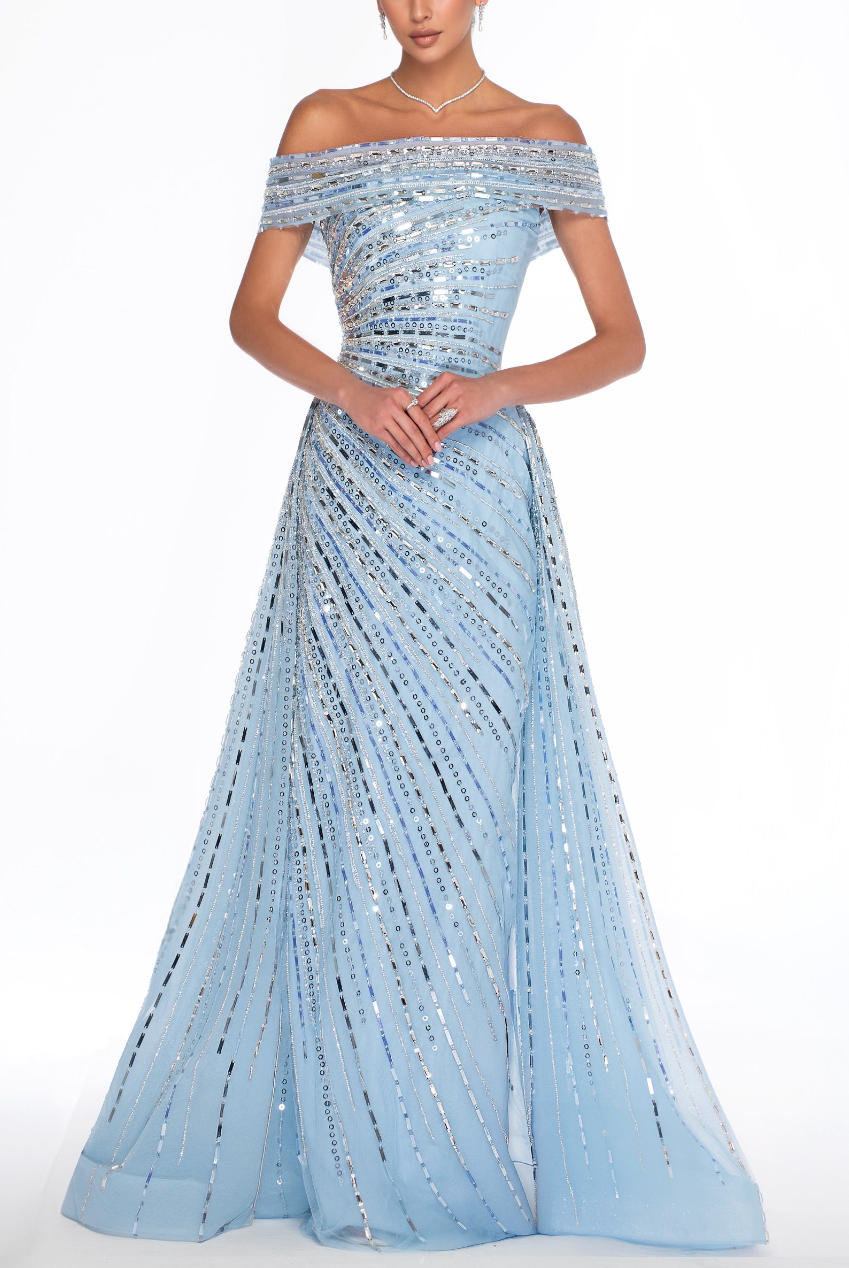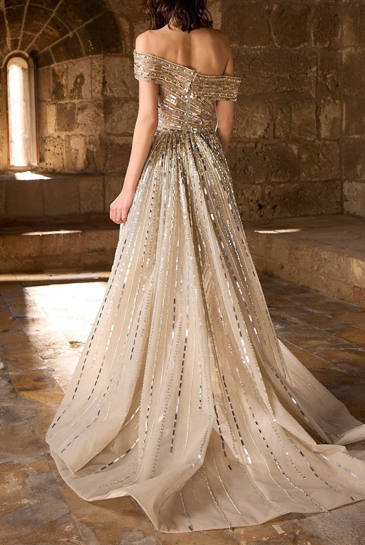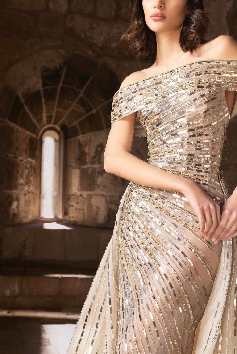 A fitted embellishment gown with an asymmetrical off-shoulder neckline, structured bodice, silver-toned embroidery, sequins, and a flowing overskirt.