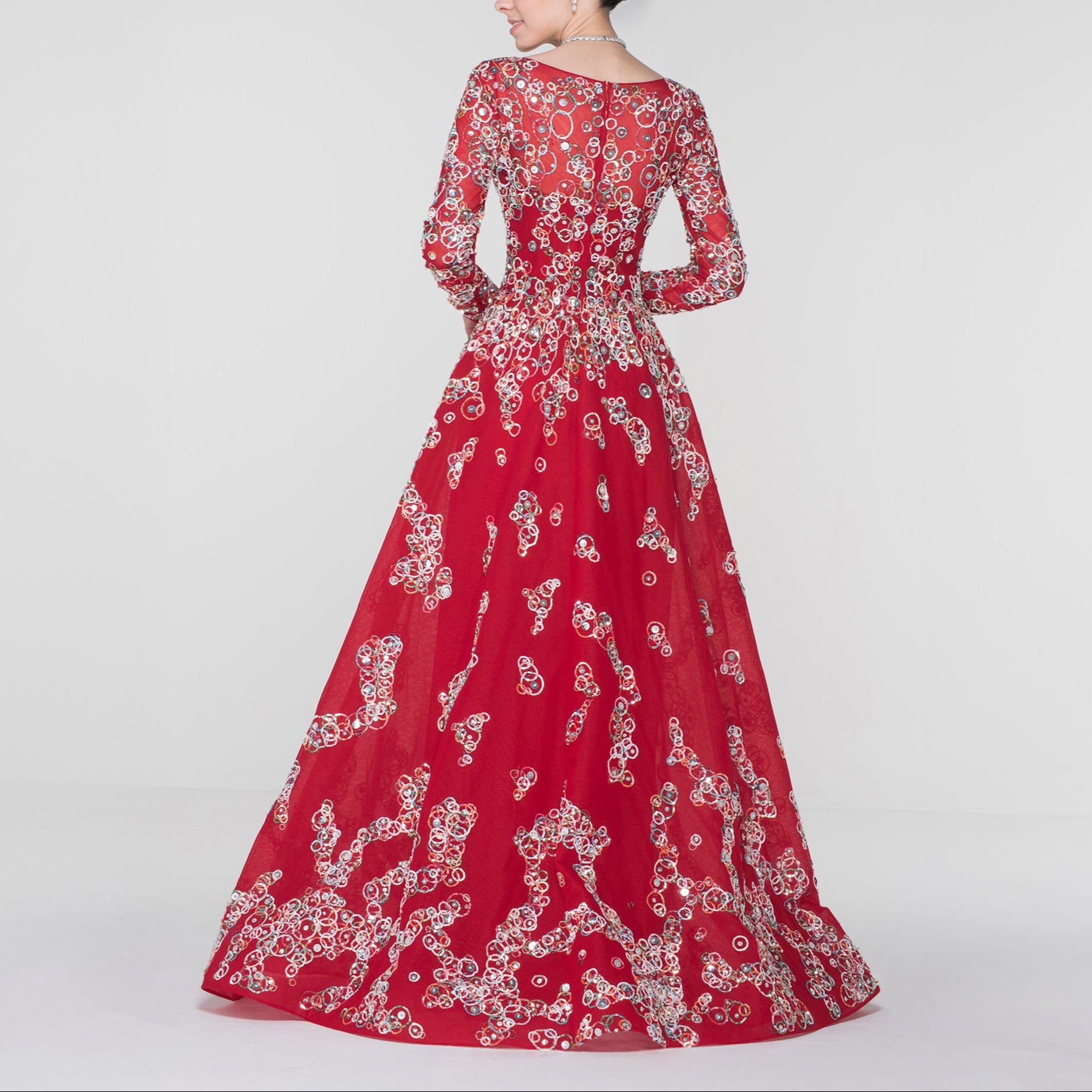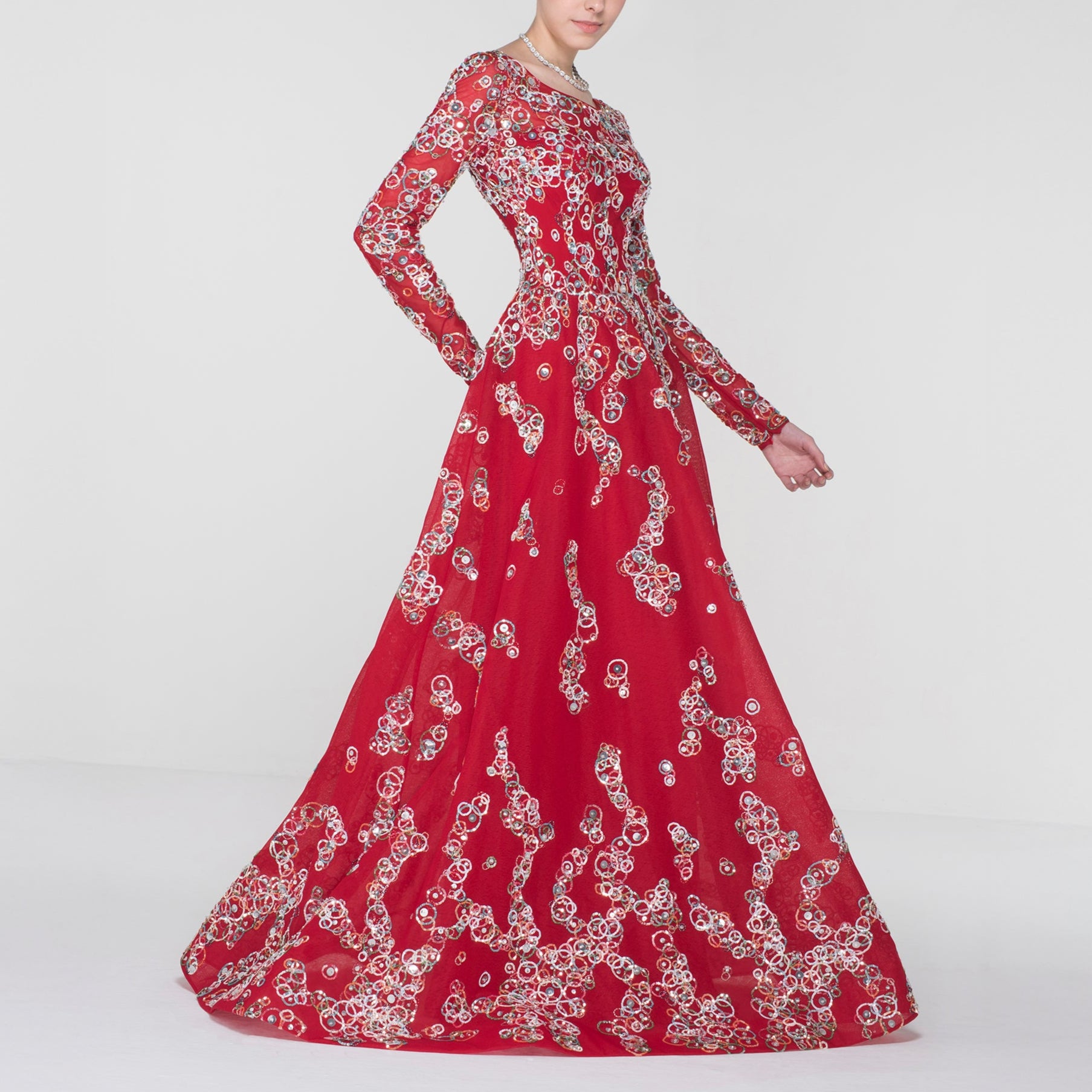 Ruby Red Organza Dress with Layered Full Sleeves and Multi-Colored Embroidery